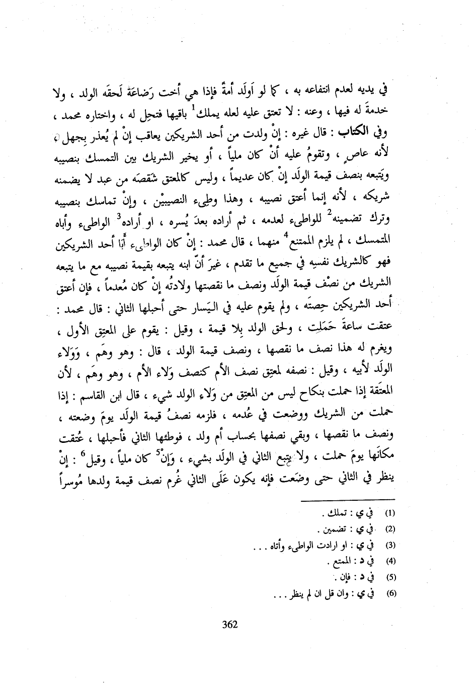 فِي يَدَيْهِ لِعَدَمِ انْتِفَاعِهِ بِهِ كَمَا لَوْ أَوْلَدَ أَمَةً فَإِذَا هِيَ أُخْتُ رَضَاعَةٍ لَحِقَهُ الْوَلَدُ وَلَا خِدْمَةَ لَهُ فِيهَا وَعَنْهُ لَا تُعْتَقُ عَلَيْهِ لَعَلَّهُ يَمْلِكُ بَاقِيهَا فَتَحِلُّ لَهُ وَاخْتَارَهُ مُحَمَّدٌ وَفِي الْكِتَابِ قَالَ غَيْرُهُ إِنْ وَلَدَتْ مِنْ أَحَدِ الشَّرِيكَيْنِ يُعَاقَبُ إِنْ لَمْ يُعْذَرْ بِجَهْلٍ لِأَنَّهُ عَاصٍ وَتُقَوَّمُ عَلَيْهِ إِنْ كَانَ مَلِيًّا أَوْ يُخَيَّرُ الشَّرِيكُ بَيْنَ التَّمَسُّكِ بِنَصِيبِهِ وَيَتْبَعُهُ بِنِصْفِ قِيمَةِ الْوَلَدِ إِنْ كَانَ عَدِيمًا وَلَيْسَ كَالْمُعْتِقِ شِقْصَهُ مِنْ عَبْدٍ لَا يَضْمَنُهُ شَرِيكُهُ لِأَنَّهُ إِنَّمَا أَعْتَقَ نَصِيبَهُ وَهَذَا وطئ النَّصِيبَيْنِ وَإِنْ تَمَاسَكَ بِنَصِيبِهِ وَتَرَكَ تَضْمِينَهُ لِلْوَاطِئِ لِعُدْمِهِ ثُمَّ أَرَادَهُ بَعْدَ يُسْرِهِ أَوْ أَرَادَهُ الْوَاطِئُ وَأَبَاهُ الْمُتَمَسِّكُ لَمْ يَلْزَمِ الْمُمْتَنِعَ مِنْهُمَا قَالَ مُحَمَّدٌ إِنْ كَانَ الْوَاطِئُ أَبَا أَحَدِ الشَّرِيكَيْنِ فَهُوَ كَالشَّرِيكِ نَفْسِهِ فِي جَمِيعِ مَا تَقَدَّمَ غَيْرَ أَنَّ ابْنَهُ يَتْبَعُهُ بِقِيمَةِ نَصِيبِهِ مَعَ مَا يَتْبَعُهُ الشَّرِيكُ مِنْ نِصْفِ قِيمَةِ الْوَلَدِ وَنِصْفِ مَا نَقَصَتْهَا وِلَادَتُهُ إِنْ كَانَ مُعْدِمًا فَإِنْ أَعْتَقَ أَحَدُ الشَّرِيكَيْنِ حِصَّتَهُ وَلَمْ يُقَوَّمْ عَلَيْهِ فِي الْيَسَارِ حَتَّى أَحْبَلَهَا الثَّانِي قَالَ مُحَمَّدٌ عَتَقَتْ سَاعَةَ حَمَلَتْ وَلَحِقَ الْوَلَدُ بِلَا قِيمَةٍ وَقِيلَ يُقَوَّمُ عَلَى الْمُعْتِقِ الْأَوَّلِ وَيَغْرَمُ لَهُ هَذَا نِصْفَ مَا نَقَصَهَا وَنِصْفَ قِيمَةِ الْوَلَدِ قَالَ وَهُوَ وَهْمٌ وَوَلَاءُ الْوَلَدِ لِأَبِيهِ وَقِيلَ نِصْفُهُ لِمُعْتِقِ نِصْفِ الْأُمِّ كَنِصْفِ وَلَاءِ الْأُمِّ وَهُوَ وَهْمٌ لِأَنَّ الْمُعْتَقَةَ إِذَا حَمَلَتْ بِنِكَاحٍ لَيْسَ مِنَ الْمُعْتِقِ مِنْ وَلَاءِ الْوَلَدِ شَيْءٌ قَالَ ابْنُ الْقَاسِمِ إِذَا حَمَلَتْ مِنَ الشَّرِيكِ وَوَضَعَتْ فِي عُدْمِهِ فَلَزِمَهُ نِصْفُ قِيمَةِ الْوَلَدِ يَوْمَ وَضَعَتْهُ وَنِصْفُ مَا نَقَصَهَا وَبَقِيَ نِصْفُهَا بِحِسَابِ أُمِّ وَلَدٍ فَوَطِئَهَا الثَّانِي فَأَحْبَلَهَا عَتَقَتْ مَكَانَهَا يَوْمَ حَمَلَتْ وَلَا يَتْبَعُ الثَّانِيَ فِي الْوَلَدِ بِشَيْءٍ وَإِنْ كَانَ مَلِيًّا وَقيل إِن يُنْظَرْ فِي الثَّانِي حَتَّى وَضَعَتْ فَإِنَّهُ يَكُونُ عَلَى الثَّانِي غُرْمُ نِصْفِ قِيمَةِ وَلَدِهَا مُوسِرًا