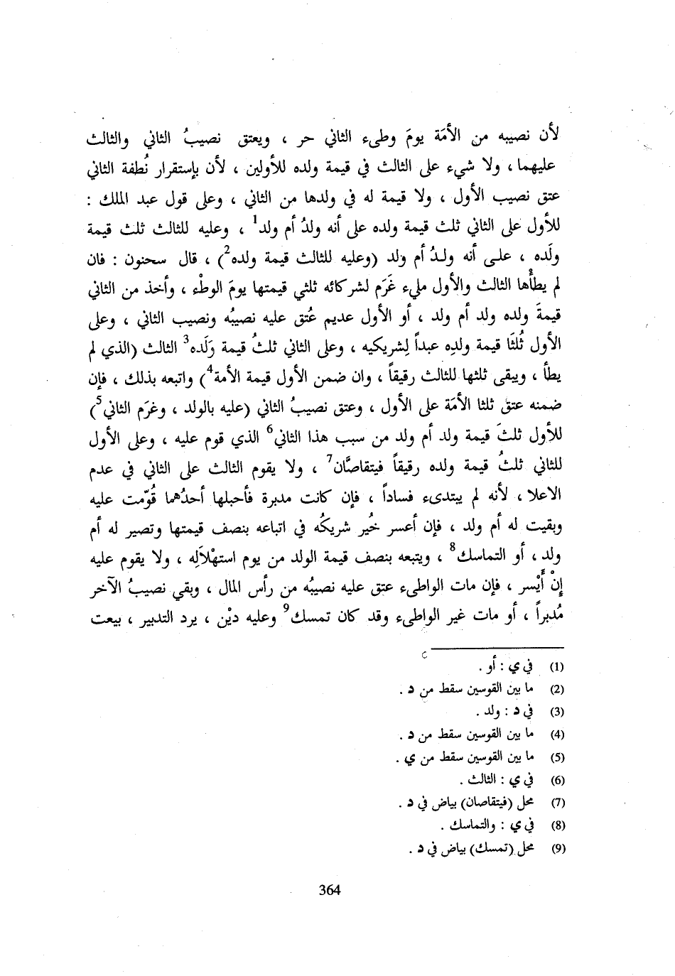 لِأَنَّ نَصِيبَهُ مِنَ الْأَمَةِ يَوْمَ وَطِئَ الثَّانِي حُرٌّ وَيُعْتَقُ نَصِيبُ الثَّانِي وَالثَّالِثِ عَلَيْهِمَا وَلَا شَيْءَ عَلَى الثَّالِثِ فِي قِيمَةِ وَلَدِهِ لِلْأَوَّلِينَ لِأَنَّ بِاسْتِقْرَارِ نُطْفَةِ الثَّانِي عِتْقَ نَصِيبِ الْأَوَّلِ وَلَا قِيمَةَ لَهُ فِي وَلَدِهَا مِنَ الثَّانِي وَعَلَى قَوْلِ عَبْدِ الْمَلِكِ لِلْأَوَّلِ عَلَى الثَّانِي ثُلُثُ قِيمَةِ وَلَدِهِ عَلَى أَنَّهُ وَلَدُ أُمِّ وَلَدٍ وَعَلَيْهِ لِلثَّالِثِ ثُلُثُ قِيمَةِ وَلَدِهِ عَلَى أَنه ولد أم ولد وَعَلِيهِ للثَّالِث قيمَة وَلَده قَالَ سَحْنُونٌ فَإِنْ لَمْ يَطَأْهَا الثَّالِثُ وَالْأَوَّلُ مَلِيءٌ غَرِمَ لِشُرَكَائِهِ ثُلُثَيْ قِيمَتِهَا يَوْمَ الْوَطْءِ وَأَخَذَ مِنَ الثَّانِي قِيمَةَ وَلَدِهِ وَلَدِ أُمِّ وَلَدٍ أَوِ الْأَوَّلُ عَدِيمٌ عَتَقَ عَلَيْهِ نَصِيبُهُ وَنَصِيبُ الثَّانِي وَعَلَى الْأَوَّلِ ثُلُثَا قِيمَةِ وَلَدِهِ عبدا لشريكيه وعَلى الثَّانِي ثلث قيمَة وَلَده الثَّالِث الَّذِي لم يطَأ وَيبقى ثلثهَا لِلثَّالِثِ رَقِيقًا وَإِنْ ضِمْنَ الْأَوَّلُ قِيمَةَ الْأَمَةِ وَأَتْبَعَهُ بِذَلِكَ فَإِنْ ضَمِنَهُ عَتَقَ ثُلُثَا الْأَمَةِ عَلَى الْأَوَّلِ وَعَتَقَ نَصِيبُ الثَّانِي عَلَيْهِ بِالْوَلَدِ وَغَرِمَ الثَّانِي لِلْأَوَّلِ ثُلُثَ قِيمَةِ وَلَدِ أُمِّ وَلَدٍ مِنْ سَبَبِ هَذَا الثَّانِي الَّذِي قُوِّمَ عَلَيْهِ وَعَلَى الْأَوَّلِ لِلثَّانِي ثُلُثُ قِيمَةِ وَلَدِهِ رَقِيقًا فَيَتَقَاصَّانِ وَلَا يُقَوَّمُ الثَّالِثُ عَلَى الثَّانِي فِي عدم الاعلا لِأَنَّهُ لَمْ يَبْتَدِئْ فَسَادًا فَإِنْ كَانَتْ مُدَبَّرَةً فَأَحْبَلَهَا أَحَدُهُمَا قُوِّمَتْ عَلَيْهِ وَبَقِيَتْ لَهُ أُمَّ وَلَدٍ فَإِنْ أَعْسَرَ خُيِّرَ شَرِيكُهُ فِي اتِّبَاعِهِ بِنِصْفِ قِيمَتِهَا وَتَصِيرُ لَهُ أُمَّ وَلَدٍ أَوِ التَّمَاسُكَ وَيَتْبَعَهُ بِنِصْفِ قِيمَةِ الْوَلَدِ مِنْ يَوْمِ اسْتِهْلَالِهِ وَلَا يُقَوَّمُ عَلَيْهِ إِنْ أَيْسَرَ فَإِنْ مَاتَ الْوَاطِئُ عَتَقَ عَلَيْهِ نَصِيبُهُ مِنْ رَأْسِ الْمَالِ وَبَقِيَ نَصِيبُ الْآخَرِ مُدَبَّرًا أَوْ مَاتَ غير الْوَاطِئ وَقد كَانَ تمسك وَعَلَيْهِ دَيْنٌ يُرَدُّ التَّدْبِيرُ بِيعَتْ