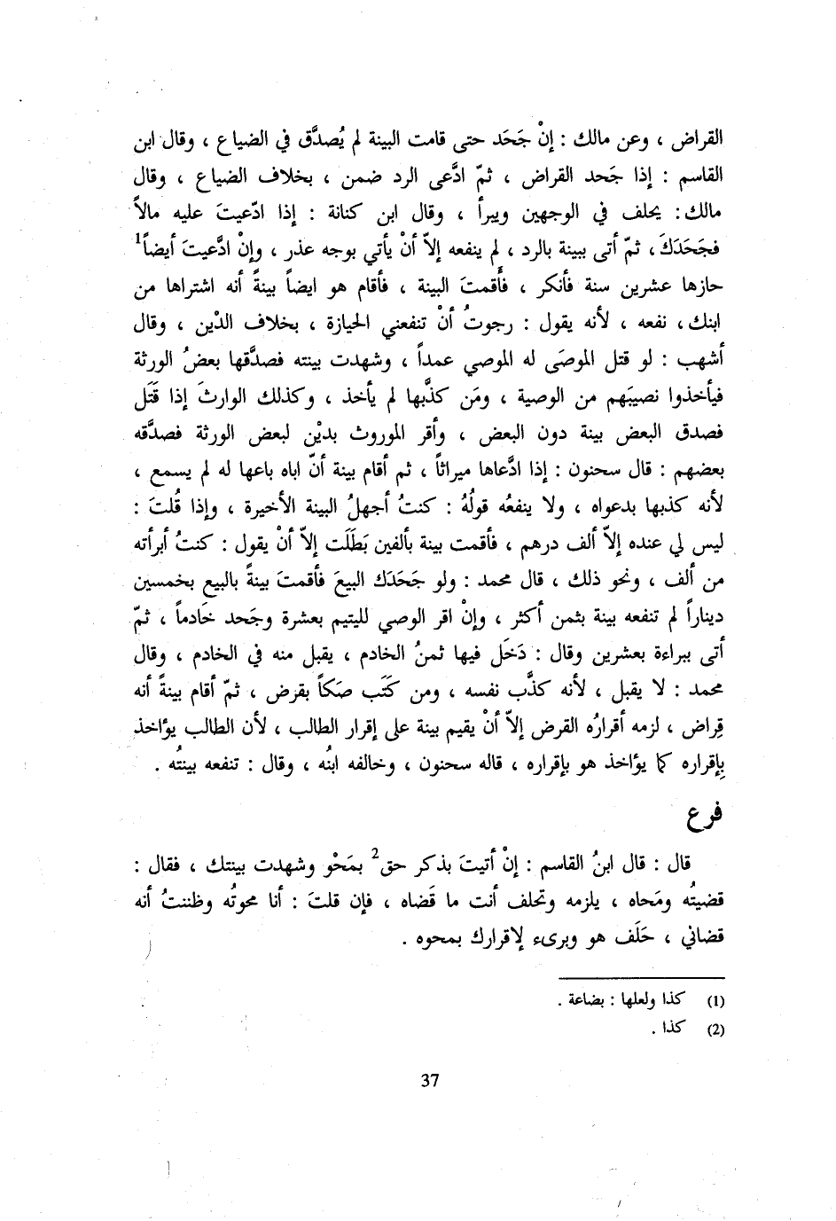 الْقِرَاضُ وَعَنْ مَالِكٍ إِنْ جَحَدَ حَتَّى قَامَتِ الْبَيِّنَةُ لَمْ يُصَدَّقْ فِي الضَّيَاعِ وَقَالَ ابْنُ الْقَاسِمِ إِذَا جَحَدَ الْقِرَاضَ ثُمَّ ادَّعَى الرَّدَّ ضَمِنَ بِخِلَافِ الضَّيَاعِ وَقَالَ مَالِكٌ يَحْلِفُ فِي الْوَجْهَيْنِ وَيَبْرَأُ وَقَالَ ابْنُ كِنَانَةَ إِذَا ادَّعَيْتَ عَلَيْهِ مَالًا فَجَحَدَكَ ثُمَّ أَتَى بِبَيِّنَةٍ بِالرَّدِّ لَمْ يَنْفَعْهُ إِلَّا أَنْ يَأْتِيَ بِوَجْهِ عُذْرٍ وَإِنِ ادَّعَيْتَ أَيْضًا حَازَهَا عِشْرِينَ سَنَةً فَأَنْكَرَ فَأَقَمْتَ الْبَيِّنَةَ فَأَقَامَ هُوَ أَيْضًا بَيِّنَةً أَنَّهُ اشْتَرَاهَا من ابْنك نَفَعَهُ لِأَنَّهُ يَقُولُ رَجَوْتُ أَنْ تَنْفَعَنِي الْحِيَازَةُ بِخِلَافِ الدَّيْنِ وَقَالَ أَشْهَبُ لَوْ قَتَلَ الْمُوصَى لَهُ الْمُوصِي عَمْدًا وَشَهِدَتْ بَيِّنَتُهُ فَصَدَّقَهَا بَعْضُ الْوَرَثَةِ فَيَأْخُذُوا نَصِيبَهُمْ مِنَ الْوَصِيَّةِ وَمَنْ كَذَّبَهَا لَمْ يَأْخُذْ وَكَذَلِكَ الْوَارِثُ إِذَا قَتَلَ فَصَدَّقَ الْبَعْض بَيِّنَة دون الْبَعْض وَأقر الْمَوْرُوثُ بِدَيْنٍ لِبَعْضِ الْوَرَثَةِ فَصَدَّقَهُ بَعْضُهُمْ قَالَ سَحْنُونٌ إِذَا ادَّعَاهَا مِيرَاثًا ثُمَّ أَقَامَ بَيِّنَةً أَن اباه بَاعهَا لَهُ لم يسمع لِأَنَّهُ كَذَّبَهَا بِدَعْوَاهُ وَلَا يَنْفَعُهُ قَوْلُهُ كُنْتُ أَجْهَلُ الْبَيِّنَةَ الْأَخِيرَةَ وَإِذَا قُلْتَ لَيْسَ لِي عِنْدَهُ إِلَّا أَلْفُ دِرْهَمٍ فَأَقَمْتَ بَيِّنَةً بِأَلْفَيْنِ بطلت إِلَّا أَن يَقُول كُنْتُ أَبْرَأْتُهُ مِنْ أَلْفٍ وَنَحْوَ ذَلِكَ قَالَ مُحَمَّدٌ وَلَوْ جَحَدَكَ الْبَيْعَ فَأَقَمْتَ بَيِّنَةً بِالْبَيْعِ بِخَمْسِينَ دِينَارًا لَمْ تَنْفَعْهُ بَيِّنَةٌ بِثَمَنٍ أَكْثَرَ وَإِنْ أَقَرَّ الْوَصِيُّ لِلْيَتِيمِ بِعَشَرَةٍ وَجَحَدَ خَادِمًا ثُمَّ أَتَى بِبَرَاءَةٍ بِعِشْرِينَ وَقَالَ دَخَلَ فِيهَا ثَمَنُ الْخَادِمِ يُقْبَلُ مِنْهُ فِي الْخَادِمِ وَقَالَ مُحَمَّدٌ لَا يُقْبَلُ لِأَنَّهُ كَذَّبَ نَفْسَهُ وَمَنْ كَتَبَ صَكًّا بِقَرْضٍ ثُمَّ أَقَامَ بَيِّنَةً أَنَّهُ قِرَاض لزمَه إِقْرَاره الْقَرْض إِلَّا أَنْ يُقِيمَ بَيِّنَةً عَلَى إِقْرَارِ الطَّالِبِ لِأَنَّ الطَّالِبَ يُؤَاخَذُ بِإِقْرَارِهِ كَمَا يُؤَاخَذُ هُوَ بِإِقْرَارِهِ قَالَهُ سَحْنُونٌ وَخَالَفَهُ ابْنُهُ وَقَالَ تَنْفَعُهُ بَيِّنَتُهُ