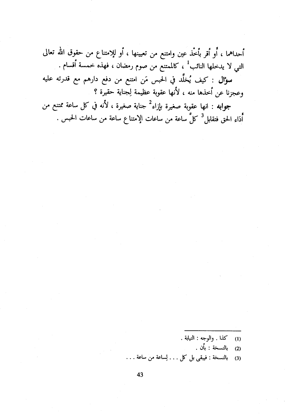 أحداهما اَوْ أقرّ بِأخذ عين وَامْتَنَعَ مِنْ تَعْيِينِهَا أَوْ لِلِامْتِنَاعِ مِنْ حُقُوقِ اللَّهِ تَعَالَى الَّتِي لَا يَدْخُلُهَا النَّائِبُ كَالْمُمْتَنِعِ مِنْ صَوْمِ رَمَضَانَ فَهَذِهِ خَمْسَةُ أَقْسَامٍ سُؤَالٌ كَيْفَ يَخْلُدُ فِي الْحَبْسِ مَنِ امْتَنَعَ مِنْ دَفْعِ دَارِهِمْ مَعَ قُدْرَتِهِ عَلَيْهِ وَعَجْزِنَا عَنْ أَخْذِهَا مِنْهُ لِأَنَّهَا عُقُوبَةٌ عَظِيمَةٌ لِجِنَايَةٍ حَقِيرَةٍ جَوَابُهُ أَنَّهَا عُقُوبَةٌ صَغِيرَةٌ بِإِزَاءِ جِنَايَةٍ صَغِيرَةٍ لِأَنَّهُ فِي كُلِّ سَاعَةٍ مُمْتَنِعٌ مِنْ أَدَاءِ الْحَقِّ فَتُقَابِلُ كُلُّ سَاعَةٍ مِنْ سَاعَاتِ الِامْتِنَاعِ سَاعَة من سَاعَات الْحَبْس