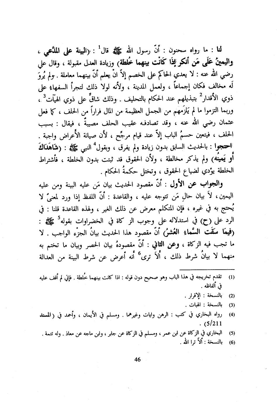 لَنَا مَا رَوَاهُ سَحْنُونٌ أَنَّ رَسُولَ اللَّهِ - صَلَّى اللَّهُ عَلَيْهِ وَسَلَّم َ - قَالَ الْبَيِّنَةُ عَلَى الْمُدَّعِي وَالْيَمِينُ عَلَى مَنْ أَنْكَرَ إِذَا كَانَتْ بَيْنَهُمَا خُلْطَةٌ وَزِيَادَةُ الْعَدْلِ مَقْبُولَةٌ وَقَالَ عَلِيٌّ رَضِيَ اللَّهُ عَنْهُ لَا يَعْدِي الْحَاكِمُ عَلَى الْخَصْمِ إِلَّا أَنْ يَعْلَمَ أَنَّ بَيْنَهُمَا مُعَامَلَةً وَلَمْ يُرْوَ لَهُ مُخَالِفٌ فَكَانَ إِجْمَاعًا ولعمل الْمَدِينَةِ وَلِأَنَّهُ لَوْلَا ذَلِكَ لَتَجَرَّأَ السُّفَهَاءُ عَلَى ذَوِي الْأَقْدَارِ بِتَبْذِيلِهِمْ عِنْدَ الْحُكَّامِ بِالتَّحْلِيفِ وَذَلِكَ شاق على ذَوي الهيآت وَرُبَّمَا الْتَزَمُوا مَا لَمْ يَلْزَمْهُمْ مِنَ الْجُمَلِ الْعَظِيمَةِ مِنَ الْمَالِ فِرَارًا مِنَ الْحَلِفِ كَمَا فَعَلَ عُثْمَانُ رَضِيَ اللَّهُ عَنْهُ وَقَدْ تُصَادِفُهُ عَقِيبَ الْحَلِفِ مُصِيبَةٌ فَيُقَالُ بِسَبَبِ الْحَلِفِ فَيَتَعَيَّنُ حَسْمُ الْبَابِ إِلَّا عِنْدَ قِيَامِ مُرَجِّحٍ لِأَنَّ صِيَانَةَ الْأَعْرَاضِ وَاجِبَةٌ احْتَجُّوا بِالْحَدِيثِ السَّابِقِ بِدُونِ زِيَادَةٍ وَلَمْ يُفَرَّقْ وَبِقَوْلِ النَّبِيِّ - صَلَّى اللَّهُ عَلَيْهِ وَسَلَّم َ - شَاهِدَاكَ أَوْ يَمِينُهُ وَلَمْ يَذْكُرْ مُخَالَطَةً وَلِأَنَّ الْحُقُوقَ قَدْ ثَبَتَتْ بِدُونِ الْخُلْطَةِ فَاشْتِرَاطُ الْخُلْطَةِ يُؤَدِّي لِضَيَاعِ الْحُقُوقِ وَتَخْتَلُّ حِكْمَةُ الْحُكَّامِ وَالْجَوَابُ عَنِ الْأَوَّلِ أَنَّ مَقْصُودَ الْحَدِيثِ بَيَانُ مَنْ عَلَيْهِ الْبَيِّنَةُ وَمَنْ عَلَيْهِ الْيَمِينُ لَا بَيَانُ حَالِ مَنْ تَتَوَجَّهُ عَلَيْهِ وَالْقَاعِدَةُ أَنَّ اللَّفْظَ إِذَا وَرَدَ لِمَعْنًى لَا يُحْتَجُّ بِهِ فِي غَيْرِهِ فَإِنَّ الْمُتَكَلِّمَ مُعْرِضٌ عَنْ ذَلِكَ الْغَيْرِ وَلِهَذِهِ الْقَاعِدَةِ قُلْنَا فِي الرَّدِّ عَلَى ح فِي استدلاله على وجوب الزَّكَاة فِي الخضروات بقوله - صَلَّى اللَّهُ عَلَيْهِ وَسَلَّم َ - فِيمَا سَقَتِ السَّمَاءُ الْعُشْرُ إِنَّ مَقْصُودَ هَذَا الْحَدِيثِ بَيَانُ الْجُزْءِ الْوَاجِبِ لَا مَا تَجِبُ فِيهِ الزَّكَاةُ وَعَنِ الثَّانِي أَنَّ مَقْصُودَهُ بَيَانُ الْحصْر وَبَيَان مَا تختم بِهِ مِنْهُمَا لَا بَيَانُ شَرْطِ ذَلِكَ أَلَا تَرَى أَنَّهُ أَعْرَضَ عَنْ شَرْطِ الْبَيِّنَةِ مِنَ الْعَدَالَةِ