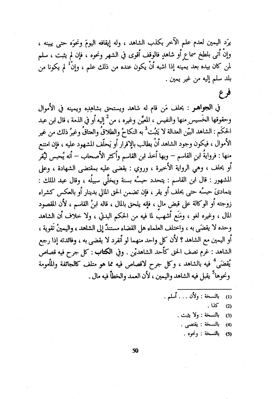 فِي الْجَوَاهِرِ يَحْلِفُ مَنْ قَامَ لَهُ شَاهد وَيسْتَحق بِشَهَادَة وَيَمِينِهِ فِي الْأَمْوَالِ وَحُقُوقِهَا الْخَسِيسِ مِنْهَا وَالنَّفِيسِ الْمعِين وَغَيره من إِلَيْهِ أَوْ فِي الذِّمَّةِ قَالَ ابْنُ عَبْدِ الْحَكَمِ الشَّاهِدُ الْبَيِّنُ الْعَدَالَةِ لَا يَثْبُتُ بِهِ النِّكَاحُ وَالطَّلَاقُ وَالْعَتَاقُ وَغَيْرُ ذَلِكَ مِنْ غَيْرِ الْأَمْوَالِ فَيَكُونُ وُجُودُ الشَّاهِدِ أَنْ يُطَالَبَ بِالْإِقْرَارِ أَوْ يحلف الْمَشْهُود عَلَيْهِ فَإِن امْتنع مِنْهَا فَرِوَايَةُ ابْنِ الْقَاسِمِ وَبِهَا أَخَذَ ابْنُ الْقَاسِمِ وَأَكْثَرُ الْأَصْحَابِ أَنَّهُ يُحْبَسُ لِيُقِرَّ أَوْ يَحْلِفَ وَهِيَ الرِّوَايَةُ الْأَخِيرَةُ وَرُوِيَ يُقْضَى عَلَيْهِ بِمُقْتَضَى الشَّهَادَةِ وَعَلَى الْمَشْهُورِ قَالَ ابْنُ الْقَاسِمِ يَتَحَدَّدُ حَبْسُهُ بِسَنَةٍ وَيُخْلَى سَبِيلُهُ وَقَالَ عَبْدُ الْمَلِكِ يَتَمَادَى حَبْسُهُ حَتَّى يَحْلِفَ أَوْ يُقِرَّ فَإِنْ تضمن الْحق المالي بِدِينَار اَوْ بِالْعَكْسِ كَشِرَاءِ زَوْجَتِهِ أَوِ الْوَكَالَةِ عَلَى قَبْضِ مَالٍ فَإِنَّهُ يُلْحَقُ بِالْمَالِ قَالَهُ ابْنُ الْقَاسِمِ لِأَنَّ الْمَقْصُود المَال وَغَيره لَغْو وَمنع أَشْهَبُ لِمَا فِيهِ مِنَ الْحُكْمِ الْبَدَنِيِّ وَلَا خِلَافَ أَنَّ الشَّاهِدَ وَحْدَهُ لَا يُقْضَى بِهِ وَاخْتَلَفَ الْعُلَمَاءُ هَلِ الْقَضَاءُ مُسْتَنِدٌ إِلَى الشَّاهِدِ وَالْيَمِينُ تَقْوِيَةٌ أَوِ الْيَمِينُ مَعَ الشَّاهِدِ لِأَنَّ كُلَّ وَاحِدٍ مِنْهُمَا لَوِ انْفَرَدَ لَا يُقْضَى بِهِ وَفَائِدَتُهُ إِذَا رَجَعَ الشَّاهِدُ غَرِمَ نِصْفَ الْحَقِّ كَأَحَدِ الشَّاهِدَيْنِ وَفِي الْكِتَابِ كُلُّ جُرْحٍ فِيهِ قصاص يقْضى فِيهِ بِالشَّاهِدِ وَكُلُّ جُرْحٍ لَا قِصَاصَ فِيهِ مِمَّا هُوَ متْلف كالجائفة والمأمومة وَنَحْوهَا يُقْبَلُ فِيهِ الشَّاهِدُ وَالْيَمِينُ لِأَنَّ الْعَمْدَ وَالْخَطَأَ فِيهِ مَال