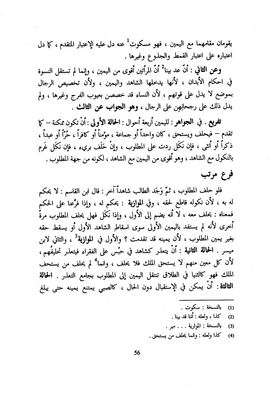 فِي الْجَوَاهِرِ لِلْيَمِينِ أَرْبَعَةُ أَحْوَالٍ الْحَالَةُ الْأُولَى أَنْ تَكُونَ مُمْكِنَةً كَمَا تَقَدَّمَ فَيَحْلِفُ وَيَسْتَحِقُّ كَانَ وَاحِدًا أَوْ جَمَاعَةً مُؤْمِنًا أَوْ كَافِرًا حُرًّا أَوْ عَبْدًا ذَكَرًا أَوْ أُنْثَى فَإِنْ نَكَلَ رُدَّتْ عَلَى الْمَطْلُوبِ وَإِنْ حلف بَرِيء فَإِنْ نَكَلَ غَرِمَ بِالنُّكُولِ مَعَ الشَّاهِدِ وَهُوَ أَقْوَى مِنَ الْيَمِينِ مَعَ الشَّاهِدِ لِكَوْنِهِ مِنْ جِهَةِ الْمَطْلُوبِ