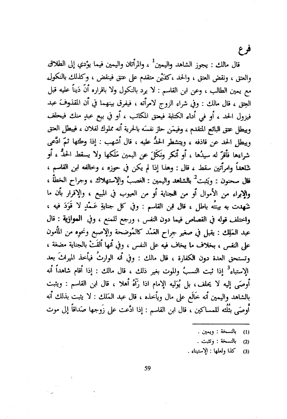 قَالَ مَالِكٌ يَجُوزُ الشَّاهِدُ وَالْيَمِينُ وَالْمَرْأَتَانِ وَالْيَمِين فِيمَا يُؤَدِّي إِلَى الطَّلَاق وَالْعِتْق وَنَقْضِ الْعِتْقِ وَالْحَدِّ كَدَيْنٍ مُتَقَدِّمٍ عَلَى عِتْقٍ فَيُنْقَضُ وَكَذَلِكَ بِالنُّكُولِ مَعَ يَمِينِ الطَّالِبِ وَعَنِ ابْنِ الْقَاسِمِ لَا يُرَدُّ بِالنُّكُولِ وَلَا بِإِقْرَارِهِ أَنَّ دَيْنًا عَلَيْهِ قَبْلَ الْعِتْقِ قَالَ مَالِكٌ وَفِي شِرَاء الزَّوْج لامْرَأَته فَيُفَرق بَينهمَا فِي أَنَّ الْمَقْذُوفَ عَبْدٌ فَيَزُولُ الْحَدُّ أَوْ فِي أَدَاءِ الْكِتَابَةِ فَيُعْتَقُ الْمُكَاتَبُ أَوْ فِي بَيْعِ عَبْدٍ مِنْكَ فَيَحْلِفُ وَيَبْطُلُ عِتْقُ الْبَائِعِ الْمُتَقَدِّمِ وَفِيمَنْ حَازَ نَفْسَهُ بِالْحُرِّيَّةِ أَنَّهُ مَمْلُوكٌ لِفُلَانٍ فَيَبْطُلُ الْعِتْقُ وَيَبْطُلُ الْحَدُّ عَنْ قَاذِفِهِ وَيَتَشَطَّرُ الْحَدُّ عَلَيْهِ قَالَ أَشْهَبُ إِذَا وَطِئَهَا ثُمَّ ادَّعَى شِرَاءَهَا فَأَقَرَّ لَهُ سَيِّدُهَا أَوْ أَنْكَرَ وَنَكَلَ عَنِ الْيَمِينِ مَلَكَهَا وَلَا يَسْقُطُ الْحَدُّ أَوْ شَاهِدًا وَامْرَأَتَيْنِ سَقَطَ قَالَ وَهَذَا إِذَا لَمْ يَكُنْ فِي حَوْزِهِ وَخَالَفَهُ ابْنُ الْقَاسِمِ قَالَ سَحْنُونٌ وَيَثْبُتُ بِالشَّاهِدِ وَالْيَمِينِ الْغَصْبُ والإستهلاك وَجِرَاحُ الْخَطَأِ وَالْإِبْرَاءُ مِنَ الْأَمْوَالِ أَوْ مِنَ الْجِنَايَةِ أَوْ مِنَ الْعُيُوبِ فِي الْمَبِيعِ وَالْإِقْرَارُ بِأَنَّ مَا شَهِدَتْ بِهِ بَيِّنَتُهُ بَاطِلٌ قَالَ ابْنُ الْقَاسِمِ وَفِي كُلِّ جِنَايَةِ عَمْدٍ لَا قَود فِيهِ وَاخْتَلَفَ قَوْلُهُ فِي الْقِصَاصِ فِيمَا دُونَ النَّفْسِ وَرَجَعَ لِلْمَنْعِ وَفِي الْمَوَّازِيَّةِ قَالَ عَبْدُ الْمَلِكِ يُقْبَلُ فِي صَغِيرِ جِرَاحِ الْعَمْدِ كَالْمُوضِحَةِ وَالْإِصْبَعِ وَنَحْوِهِ مِنَ الْمَأْمُونِ عَلَى النَّفْسِ بِخِلَافِ مَا يُخَافُ فِيهِ عَلَى النَّفْسِ وَفِي أَنَّهَا أَلْقَتْ بِالْجِنَايَةِ مُضْغَةً وَتَسْتَحِقُّ الْعِدَّةَ دُونَ الْكَفَّارَةِ قَالَ مَالِكٌ وَفِي أَنَّهُ الْوَارِثُ فَيَأْخُذُ الْمِيرَاثَ بَعْدَ الِاسْتِبَاءِ إِذَا ثَبَتَ النَّسَبُ وَالْمَوْتُ بِغَيْرِ ذَلِكَ قَالَ مَالِكٌ إِذَا أَقَامَ شَاهِدًا أَنَّهُ أَوْصَى إِلَيْهِ لَا يَحْلِفُ بَلْ يُوَلِّيهِ الْإِمَامُ إِذَا رَآهُ أَهْلًا قَالَ ابْنُ الْقَاسِمِ وَيَثْبُتُ بِالشَّاهِدِ وَالْيَمِينِ أَنَّهُ خَالِعٌ عَلَى مَالٍ وَيَأْخُذُهُ قَالَ عَبْدُ الْمَلِكِ لَا يَثْبُتُ بِذَلِكَ أَنَّهُ أَوْصَى بِثُلُثِهِ لِلْمَسَاكِينِ قَالَ ابْنُ الْقَاسِمِ إِذَا ادَّعَتْ عَلَى زَوْجِهَا صَدَاقًا إِلَى مَوْتٍ