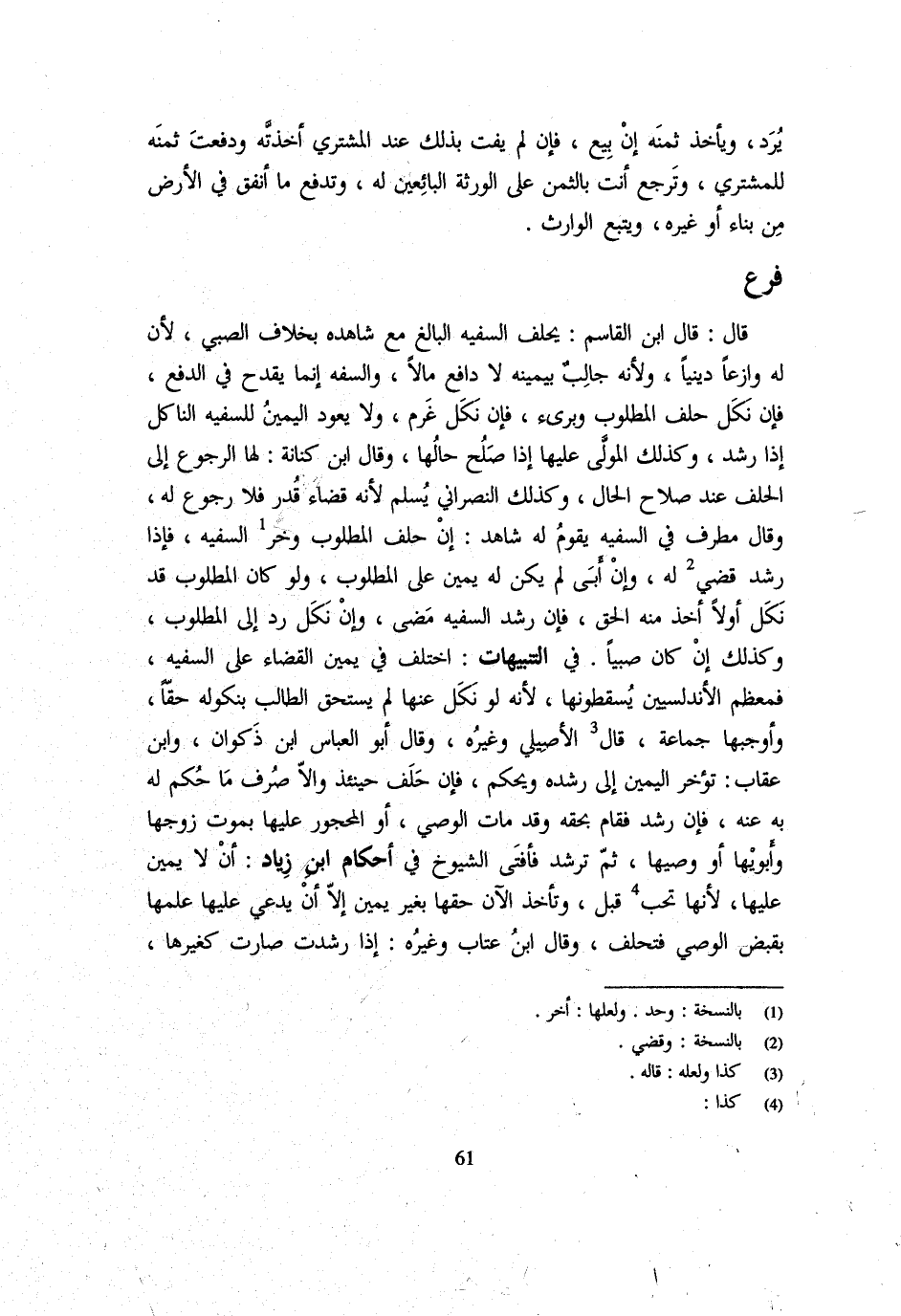 قَالَ قَالَ ابْنُ الْقَاسِمِ يَحْلِفُ السَّفِيهُ الْبَالِغُ مَعَ شَاهِدِهِ بِخِلَافِ الصَّبِيِّ لِأَنَّ لَهُ وَازِعًا دِينِيًّا وَلِأَنَّهُ جَالِبٌ بِيَمِينِهِ لَا دَافِعٌ مَالًا وَالسَّفَهُ إِنَّمَا يَقْدَحُ فِي الدَّفْعِ فَإِنْ نَكَلَ حَلَفَ الْمَطْلُوبُ وَبَرِئَ فَإِنْ نَكَلَ غَرِمَ وَلَا يَعُودُ الْيَمِينُ لِلسَّفِيهِ النَّاكِلِ إِذَا رَشَدَ وَكَذَلِكَ الْمُوَلَّى عَلَيْهَا إِذَا صَلَحَ حَالُهَا وَقَالَ ابْنُ كِنَانَةَ لَهَا الرُّجُوعُ إِلَى الْحَلِفِ عِنْدَ صَلَاحِ الْحَالِ وَكَذَلِكَ النَّصْرَانِيُّ يُسْلِمُ لِأَنَّهُ قَضَاءُ قُدِرَ فَلَا رُجُوعَ لَهُ وَقَالَ مُطَرِّفٌ فِي السَّفِيهِ يَقُومُ لَهُ شَاهِدٌ إِنْ حَلَفَ الْمَطْلُوب وخر السَّفِيهُ فَإِذَا رَشَدَ قُضِيَ لَهُ وَإِنْ أَبَى لَمْ يَكُنْ لَهُ يَمِينٌ عَلَى الْمَطْلُوبِ وَلَوْ كَانَ الْمَطْلُوبُ قَدْ نَكَلَ أَوَّلًا أُخِذَ مِنْهُ الْحق فَإِن رشد السَّفِيه مَضَى وَإِنْ نَكَلَ رُدَّ إِلَى الْمَطْلُوبِ وَكَذَلِكَ إِنْ كَانَ صَبِيًّا فِي التَّنْبِيهَاتِ اخْتُلِفَ فِي يَمِينِ الْقَضَاءِ عَلَى السَّفِيهِ فَمُعْظَمُ الْأَنْدَلُسِيِّينَ يُسْقِطُونَهَا لِأَنَّهُ لَوْ نَكَلَ عَنْهَا لَمْ يَسْتَحِقَّ الطَّالِبُ بِنُكُولِهِ حَقًّا وَأَوْجَبَهَا جَمَاعَةٌ قَالَ الْأَصِيلِيُّ وَغَيْرُهُ وَقَالَ أَبُو الْعَبَّاس ابْن ذَكْوَانَ وَابْنُ عُقَابٍ تُؤَخَّرُ الْيَمِينُ إِلَى رُشْدِهِ وَيحكم فَإِنْ حَلَفَ حِينَئِذٍ وَإِلَّا صُرِفَ مَا حُكِمَ لَهُ بِهِ عَنْهُ فَإِنْ رَشَدَ فَقَامَ بِحَقِّهِ وَقد مَاتَ الْوَصِيّ اَوْ الْمَحْجُور عَلَيْهَا بِمَوْت زَوجهَا وأبويها أَوْ وَصِيُّهَا ثُمَّ تَرْشُدُ فَأَفْتَى الشُّيُوخُ فِي أَحْكَامِ ابْنِ زِيَادٍ أَنْ لَا يَمِينَ عَلَيْهَا لِأَنَّهَا تحب قَبْلُ وَتَأْخُذُ الْآنَ حَقَّهَا بِغَيْرِ يَمِينٍ إِلَّا أَنْ يَدَّعِيَ عَلَيْهَا عِلْمَهَا بِقَبْضِ الْوَصِيِّ فَتَحْلِفُ وَقَالَ ابْنُ عَتَّابٍ وَغَيْرُهُ إِذَا رَشَدَتْ صَارَتْ كَغَيْرِهَا