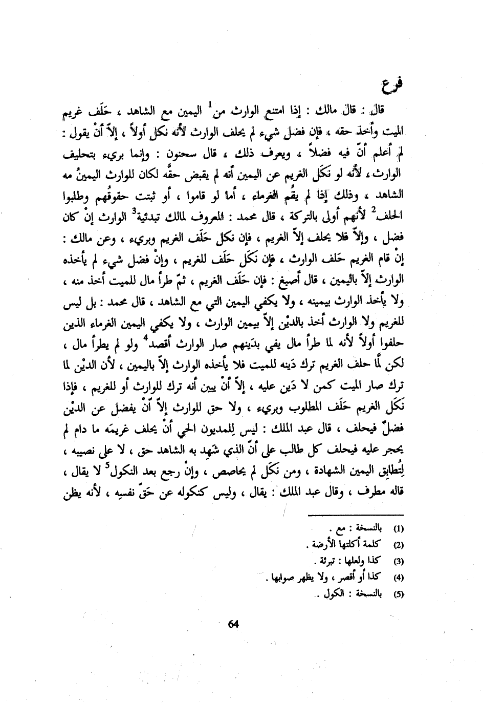 قَالَ قَالَ مَالِكٌ إِذَا امْتَنَعَ الْوَارِثُ مِنَ الْيَمِينِ مَعَ الشَّاهِدِ حَلَفَ غَرِيمُ الْمَيِّتِ وَأَخَذَ حَقَّهُ فَإِنْ فَضَلَ شَيْءٌ لَمْ يَحْلِفِ الْوَارِثُ لِأَنَّهُ نَكَلَ أَوَّلًا إِلَّا أَنْ يَقُولَ لَمْ أَعْلَمْ أَنَّ فِيهِ فَضْلًا وَيُعْرَفُ ذَلِكَ قَالَ سَحْنُون وَإِنَّمَا بَرِيء بِتَحْلِيفِ الْوَارِثِ لِأَنَّهُ لَوْ نَكَلَ الْغَرِيمُ عَنِ الْيَمِينِ أَنَّهُ لَمْ يَقْبِضْ حَقَّهُ لَكَانَ لِلْوَارِثِ الْيَمين مَه الشَّاهِدِ وَذَلِكَ إِذَا لَمْ يَقُمِ الْغُرَمَاءُ أَمَّا لَوْ قَامُوا أَوْ ثَبَتَتْ حُقُوقُهُمْ وَطَلَبُوا الْحَلِفَ لِأَنَّهُمْ أَوْلَى بِالتَّرِكَةِ قَالَ مُحَمَّدٌ الْمَعْرُوفُ لِمَالِكٍ تبدئيه الْوَارِثِ إِنْ كَانَ فَضْلٌ وَإِلَّا فَلَا يَحْلِفُ إِلَّا الْغَرِيم فَإِن نكل حلف الْغَرِيم وبريء وَعَنْ مَالِكٍ إِنْ قَامَ الْغَرِيمُ حَلَفَ الْوَارِثُ فَإِن نكل حلف للْغَرِيم وَإِنْ فَضَلَ شَيْءٌ لَمْ يَأْخُذْهُ الْوَارِثُ إِلَّا بِالْيَمِينِ قَالَ أَصْبَغُ فَإِنْ حَلَفَ الْغَرِيمُ ثُمَّ طَرَأَ مَالٌ لِلْمَيِّتِ أُخِذَ مِنْهُ وَلَا يَأْخُذُ الْوَارِثُ بِيَمِينِهِ وَلَا يَكْفِي الْيَمِينُ الَّتِي مَعَ الشَّاهِدِ قَالَ مُحَمَّدٌ بَلْ لَيْسَ لِلْغَرِيمِ وَلَا الْوَارِث أَخذ بِالدّينِ إِلَّا بِيَمِينِ الْوَارِثِ وَلَا يَكْفِي الْيَمِينُ الْغُرَمَاءَ الَّذِينَ حَلَفُوا أَوَّلًا لِأَنَّهُ لَمَّا طَرَأَ مَالٌ يَفِي بِدَيْنِهِمْ صَارَ الْوَارِثُ أَقْصَدَ وَلَوْ لَمْ يَطْرَأْ مَالٌ لَكِنْ لَمَّا حَلَفَ الْغَرِيمُ تُرِكَ دَيْنُهُ لِلْمَيِّتِ فَلَا يَأْخُذُهُ الْوَارِثُ إِلَّا بِالْيَمِينِ لِأَنَّ الدَّيْنَ لَمَّا تُرِكَ صَارَ الْمَيِّتُ كَمَنْ لَا دَيْنَ عَلَيْهِ إِلَّا أَنْ يُبَيِّنَ أَنَّهُ تَرَكَ لِلْوَارِثِ أَوْ لِلْغَرِيمِ فَإِذَا نَكَلَ الْغَرِيمُ حلف الْمَطْلُوب وبريء وَلَا حَقَّ لِلْوَارِثِ إِلَّا أَنْ يَفْضُلَ عَنِ الدَّيْنِ فَضْلٌ فَيَحْلِفُ قَالَ عَبْدُ الْمَلِكِ لَيْسَ لِلْمَدْيُونِ الْحَيِّ أَنْ يَحْلِفَ غَرِيمُهُ مَا دَامَ لَمْ يَحْجُرْ عَلَيْهِ فَيَحْلِفُ كُلُّ طَالِبٍ عَلَى أَنَّ الَّذِي شَهِدَ بِهِ الشَّاهِدُ حَقٌّ لَا عَلَى نَصِيبِهِ لِتُطَابِقَ الْيَمِينُ الشَّهَادَةَ وَمَنْ نَكَلَ لَمْ يُحَاصِصْ وَإِنْ رَجَعَ بَعْدَ النُّكُولِ لَا يُقَال قَالَ مُطَرِّفٌ وَقَالَ عَبْدُ الْمَلِكِ يُقَالُ وَلَيْسَ كَنُكُولِهِ عَنْ حَقِّ نَفْسِهِ لِأَنَّهُ يَظُنُّ