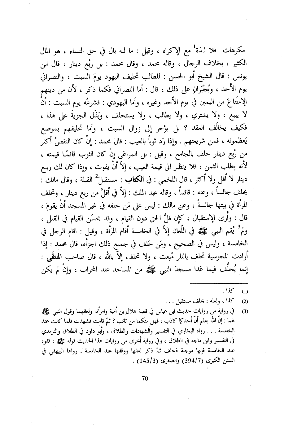 مكرهات فَلَا لَذَّة مَعَ الْإِكْرَاهِ وَقِيلَ مَا لَهُ بَالٌ فِي حَقِّ النِّسَاءِ هُوَ الْمَالُ الْكَثِيرُ بِخِلَافِ الرِّجَالِ وَقَالَهُ مُحَمَّدٌ وَقَالَ مُحَمَّدٌ بَلْ رُبُعُ دِينَارٍ قَالَ ابْنُ يُونُسَ قَالَ الشَّيْخُ أَبُو الْحَسَنِ للطَّالِب تَحْلِيف الْيَهُود يَوْم السبت وَالنَّصْرَانِيّ يَوْم الْأَحَد لِأَنَّ مِنْ دِينِهِمُ الِامْتِنَاعُ مِنَ الْيَمِينِ فِي يَوْمِ الْأَحَدِ وَغَيْرِهِ وَأَمَّا الْيَهُودِيُّ فَشَرْعُهُ يَوْمُ السبت أَن لَا يَبِيعَ وَلَا يَشْتَرِيَ وَلَا يُطَالَبَ وَلَا يُسْتَحْلَفَ وَبَذْلُ الْجِزْيَةِ عَلَى هَذَا فَكَيْفَ يُخَالِفُ الْعَقْدَ بَلْ يُؤَخَّرُ إِلَى زَوَالِ السَّبْتِ وَأَمَّا تَحْلِيفُهُمْ بِمَوْضِعٍ يُعَظِّمُونَهُ فَمِنْ شَرِيعَتِهِمْ وَإِذَا رَدَّ ثَوْبًا بِالْعَيْبِ قَالَ مُحَمَّدٌ إِنْ كَانَ النَّقْصُ أَكْثَرَ مِنْ رُبُعِ دِينَارٍ حَلَفَ بِالْجَامِعِ وَقِيلَ بَلِ الْمُرَاعَى إِنْ كَانَ الثَّوْبُ قَائِمًا قِيمَتَهُ لِأَنَّهُ يَطْلُبُ الثَّمَنَ فَلَا يُنْظَرُ إِلَى قِيمَةِ الْعَيْبِ إِلَّا أَنْ يَفُوتَ وَإِذَا كَانَ لَكَ رُبُعُ دِينَارٍ لَا أَقَلَّ وَلَا أَكْثَرَ قَالَ اللَّخْمِيُّ فِي الْكِتَابِ مُسْتَقْبِلَ الْقِبْلَةِ وَقَالَ مَالِكٌ يَحْلِفُ جَالِسًا وَعَنْهُ قَائِمًا وَقَالَهُ عَبْدُ الْمَلِكِ إِلَّا فِي أَقَلَّ مِنْ رُبُعِ دِينَارٍ وَتَحْلِفُ الْمَرْأَةُ فِي بَيْتِهَا جَالِسَةً وَعَنْ مَالِكٍ لَيْسَ عَلَى مَنْ حَلَّفَهُ فِي غَيْرِ الْمَسْجِدِ أَنْ يَقُومَ قَالَ وَأرى الإستقبال كَإِن قَلَّ الْحَقُّ دُونَ الْقِيَامِ وَقَدْ يَحْسُنُ الْقِيَامُ فِي الْقَتْلِ وَلَمْ يُقِمِ النَّبِيُّ - صَلَّى اللَّهُ عَلَيْهِ وَسَلَّم َ - فِي اللِّعَانِ إِلَّا فِي الْخَامِسَةِ أَقَامَ الْمَرْأَةَ وَقِيلَ أَقَامَ الرَّجُلَ فِي الْخَامِسَةِ وَلَيْسَ فِي الصَّحِيح وَمن حلف فِي جَمِيعِ ذَلِكَ أَجْزَأَهُ قَالَ مُحَمَّدٌ إِذَا أَرَادَتِ الْمَجُوسِيَّةُ تَحْلِفُ بِالنَّارِ مُنِعَتْ وَلَا تَحْلِفُ إِلَّا بِاللَّهِ قَالَ صَاحِبُ الْمُنْتَقَى إِنَّمَا يُحْلَفُ فِيمَا عَدَا مَسْجِدِ النَّبِيِّ - صَلَّى اللَّهُ عَلَيْهِ وَسَلَّم َ - مِنَ الْمَسَاجِدِ عِنْدَ الْمِحْرَابِ وَإِنْ لَمْ يَكُنْ