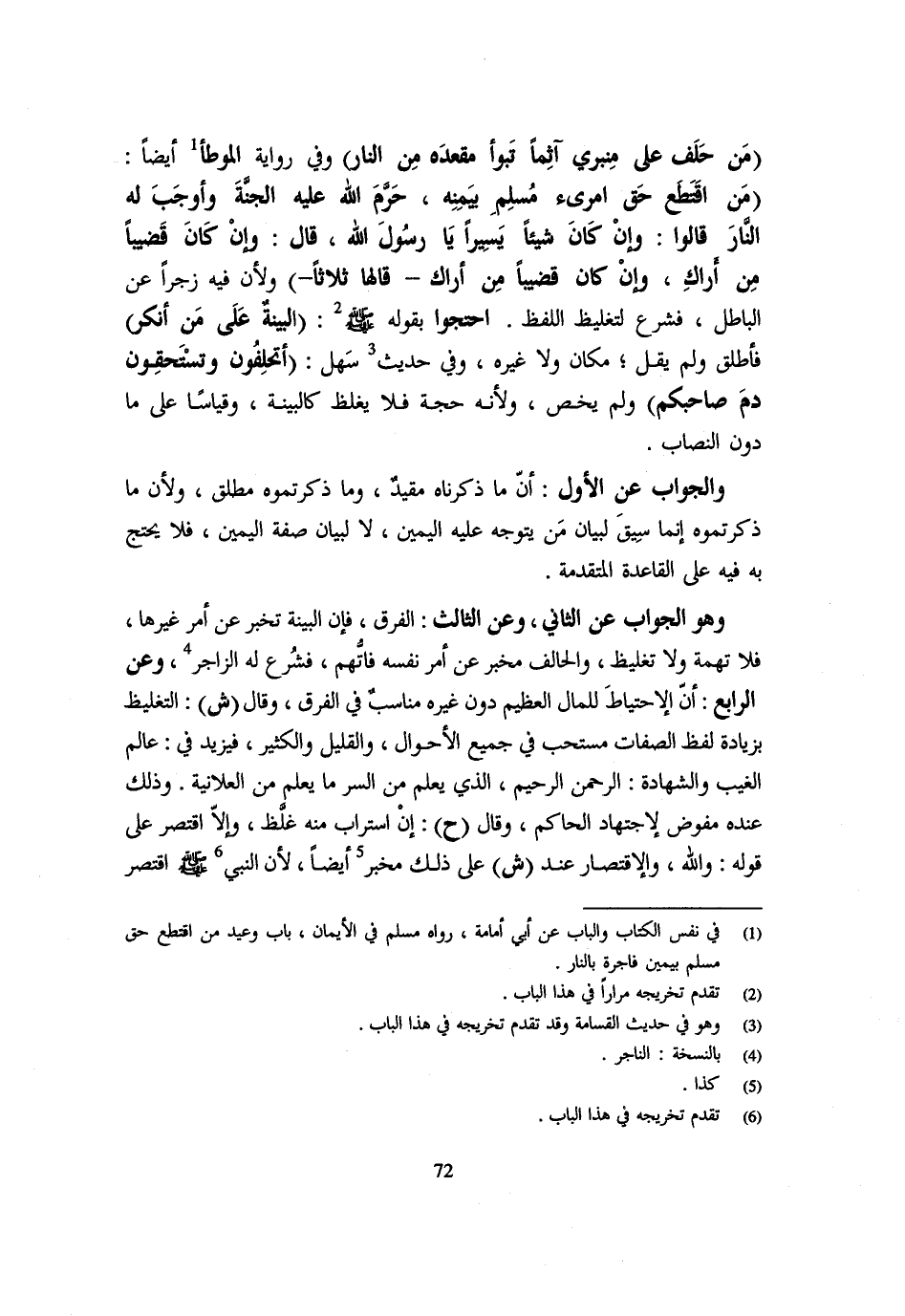 مَنْ حَلَفَ عَلَى مِنْبَرِي آثِمًا تَبَوَّأَ مَقْعَدَهُ مِنَ النَّارِ وَفِي رِوَايَةِ الْمُوَطَّأِ أَيْضًا مَنِ اقتطع حق أمرىء مُسلم بيمنه حَرَّمَ اللَّهُ عَلَيْهِ الْجَنَّةَ وَأَوْجَبَ لَهُ النَّارَ قَالُوا وَإِنْ كَانَ شَيْئًا يَسِيرًا يَا رَسُولَ اللَّهِ قَالَ وَإِنْ كَانَ قَضِيبًا مِنْ أَرَاكٍ وَإِنْ كَانَ قَضِيبًا مِنْ أَرَاكٍ قَالَهَا ثَلَاثًا وَلِأَنَّ فِيهِ زَجْرًا عَنِ الْبَاطِلِ فَشُرِعَ لِتَغْلِيظِ اللَّفْظِ احْتَجُّوا بِقَوْلِهِ - صَلَّى اللَّهُ عَلَيْهِ وَسَلَّم َ - الْبَيِّنَة عَلَى مَنْ أَنْكَرَ فَأَطْلَقَ وَلَمْ يَقُلْ مَكَانٌ وَلَا غَيره وَفِي حَدِيث سَهْلٍ أَتَحْلِفُونَ وَتَسْتَحِقُّونَ دَمَ صَاحِبِكُمْ وَلَمْ يَخُصَّ وَلِأَنَّهُ حُجَّةٌ فَلَا يُغَلَّظُ كَالْبَيِّنَةِ وَقِيَاسًا عَلَى مَا دُونَ النِّصَابِ وَالْجَوَابُ عَنِ الْأَوَّلِ أَنَّ مَا ذَكرْنَاهُ مُقَيّد وَمَا ذكرتموه مُطلق وَلِأَن مَا ذَكَرْتُمُوهُ إِنَّمَا سِيقَ لِبَيَانِ مَنْ يَتَوَجَّهُ عَلَيْهِ الْيَمِينُ لَا لِبَيَانِ صِفَةِ الْيَمِينِ فَلَا يُحْتَجُّ بِهِ فِيهِ عَلَى الْقَاعِدَةِ الْمُتَقَدِّمَةِ وَهُوَ الْجَواب عَن الثَّانِي وَعَن الثَّالِث الْفرق فَإِن الْبَيِّنَةَ تُخْبِرُ عَنْ أَمْرِ غَيْرِهَا فَلَا تُهْمَةَ وَلَا تَغْلِيظَ وَالْحَالِفُ مُخْبِرٌ عَنْ أَمْرِ نَفْسِهِ فَاتُّهِمَ فَشُرِعَ لَهُ الزَّاجِرُ وَعَنِ الرَّابِعِ أَنَّ الِاحْتِيَاطَ لِلْمَالِ الْعَظِيمِ دُونَ غَيْرِهِ مُنَاسِبٌ فِي الْفَرْقِ وَقَالَ ش التَّغْلِيظُ بِزِيَادَةِ لَفْظِ الصِّفَاتِ مُسْتَحَبٌّ فِي جَمِيعِ الْأَحْوَالِ وَالْقَلِيلِ وَالْكَثِيرِ فَيَزِيدُ فِي عَالِمِ الْغَيْبِ وَالشَّهَادَةِ الرَّحْمَنِ الرَّحِيمِ الَّذِي يَعْلَمُ مِنَ السِّرِّ مَا يَعْلَمُ مِنَ الْعَلَانِيَةِ وَذَلِكَ عِنْدَهُ مُفَوَّضٌ لِاجْتِهَادِ الْحَاكِمِ وَقَالَ ح إِنِ اسْتَرَابَ مِنْهُ غَلَّظَ وَإِلَّا اقْتَصَرَ عَلَى قَوْلِهِ وَالله والإقتصار عِنْد ش على ذَلِك مخبر أَيْضًا لِأَنَّ النَّبِيَّ - صَلَّى اللَّهُ عَلَيْهِ وَسَلَّم َ - اقْتصر