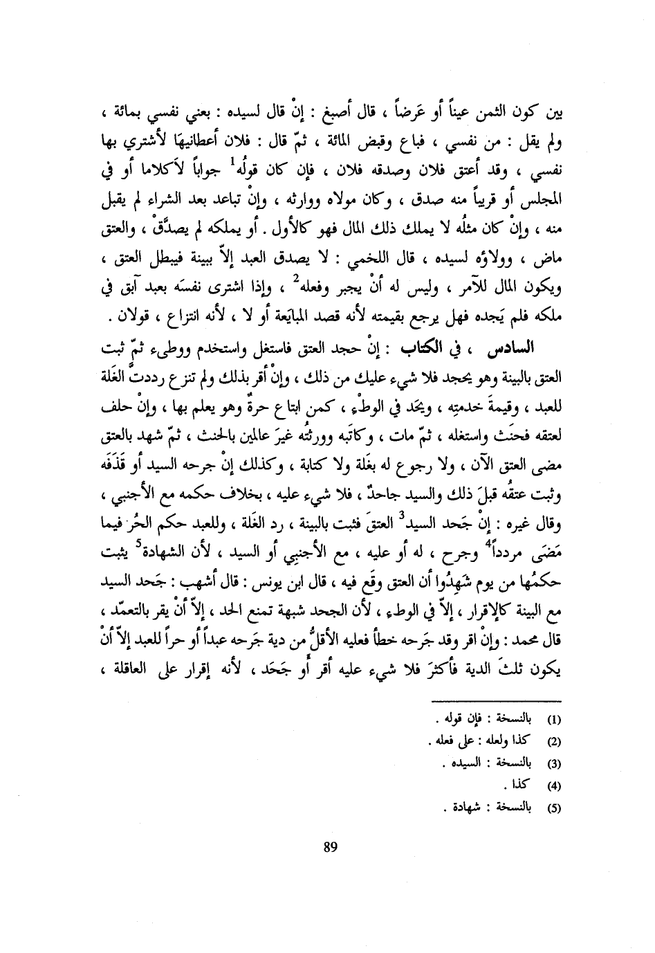 بَيْنَ كَوْنِ الثَّمَنِ عَيْنًا أَوْ عَرَضًا قَالَ أَصْبَغُ إِنْ قَالَ لِسَيِّدِهِ بِعْنِي نَفْسِي بِمِائَةٍ وَلَمْ يَقُلْ مِنْ نَفْسِي فَبَاعَ وَقَبَضَ الْمِائَةَ ثُمَّ قَالَ فَلَان أَعْطَانِيهَا لِأَشْتَرِيَ بِهَا نَفْسِي وَقد أعتق فُلَانٌ وَصَدَّقَهُ فُلَانٌ فَإِنْ كَانَ قَوْلُهُ جَوَابًا لَا كَلَامًا أَوْ فِي الْمَجْلِسِ أَوْ قَرِيبًا مِنْهُ صدق وَكَانَ مَوْلَاهُ ووارثه وَإِنْ تَبَاعَدَ بَعْدَ الشِّرَاءِ لَمْ يُقْبَلْ مِنْهُ وَإِنْ كَانَ مِثْلُهُ لَا يَمْلِكُ ذَلِكَ الْمَالَ فَهُوَ كَالْأَوَّلِ أَوْ يَمْلِكُهُ لَمْ يُصَدَّقْ وَالْعِتْقُ مَاضٍ وَوَلَاؤُهُ لِسَيِّدِهِ قَالَ اللَّخْمِيُّ لَا يُصَدَّقُ الْعَبْدُ إِلَّا بِبَيِّنَةٍ فَيَبْطُلُ الْعِتْقُ وَيَكُونُ الْمَالُ لِلْأَمْرِ وَلَيْسَ لَهُ أَن يجْبر وَفعله وَإِذَا اشْتَرَى نَفْسَهُ بِعَبْدٍ آبِقٍ فِي مِلْكِهِ فَلَمْ يَجْدِهِ فَهَلْ يَرْجِعُ بِقِيمَتِهِ لِأَنَّهُ قَصَدَ الْمُبَايَعَةَ أَوْ لَا لِأَنَّهُ انْتِزَاعٌ قَوْلَانِ السَّادِسُ فِي الْكتاب إِن حجد الْعتْق فاستغل واستخدم ووطىء ثمَّ ثَبت الْعتْق بِالْبَيِّنَةِ وَهُوَ يحجد فَلَا شَيْء عَلَيْك من ذَلِك وَإِن أقرّ بذلك وَلم تنْزع رددت الْغلَّة للْعَبد وَقِيمَة خِدْمَتِهِ وَيُحَدُّ فِي الْوَطْءِ كَمَنِ ابْتَاعَ حُرَّةً وَهُوَ يعلم بهَا وَإِن حلف لعتقه فَحَنِثَ وَاسْتَغَلَّهُ ثُمَّ مَاتَ وَكَاتَبَهُ وَوَرَثَتُهُ غَيْرُ عَالِمِينَ بِالْحِنْثِ ثُمَّ شَهِدَ بِالْعِتْقِ مَضَى الْعِتْقُ الْآنَ وَلَا رُجُوعَ لَهُ بِغَلَّةٍ وَلَا كِتَابَةٍ وَكَذَلِكَ إِنْ جَرَحَهُ السَّيِّدُ أَوْ قَذَفَهُ وَثَبَتَ عِتْقُهُ قَبْلَ ذَلِكَ وَالسَّيِّدُ جَاحِدٌ فَلَا شَيْءَ عَلَيْهِ بِخِلَافِ حُكْمِهِ مَعَ الْأَجْنَبِيِّ وَقَالَ غَيْرُهُ إِنْ جَحَدَ السَّيِّدُ الْعِتْقَ فَثَبَتَ بِالْبَيِّنَةِ رَدَّ الْغلَّة وَلِلْعَبْدِ حكم الْحر فِيمَا مضى مرددا وجرح لَهُ أَوْ عَلَيْهِ مَعَ الْأَجْنَبِيِّ أَوِ السَّيِّدِ لِأَنَّ الشَّهَادَةَ يَثْبُتُ حُكْمُهَا مِنْ يَوْمِ شَهِدُوا أَنَّ الْعِتْقَ وَقَعَ فِيهِ قَالَ ابْنُ يُونُسَ قَالَ أَشْهَبُ جَحْدُ السَّيِّدِ مَعَ الْبَيِّنَةِ كَالْإِقْرَارِ إِلَّا فِي الْوَطْءِ لِأَنَّ الْجَحْدَ شُبْهَةٌ تَمْنَعُ الْحَدَّ إِلَّا أَنْ يُقِرَّ بِالتَّعَمُّدِ قَالَ مُحَمَّدٌ وَإِنْ أَقَرَّ وَقَدْ جَرَحَهُ خَطَأً فَعَلَيْهِ الْأَقَلُّ مِنْ دِيَةِ جَرْحِهِ عَبْدًا أَوْ حُرًّا لِلْعَبْدِ إِلَّا أَنْ يَكُونَ ثُلُثَ الدِّيَةِ فَأَكْثَرَ فَلَا شَيْءَ عَلَيْهِ أَقَرَّ أَوْ جَحَدَ لِأَنَّهُ إِقْرَارٌ على الْعَاقِلَة