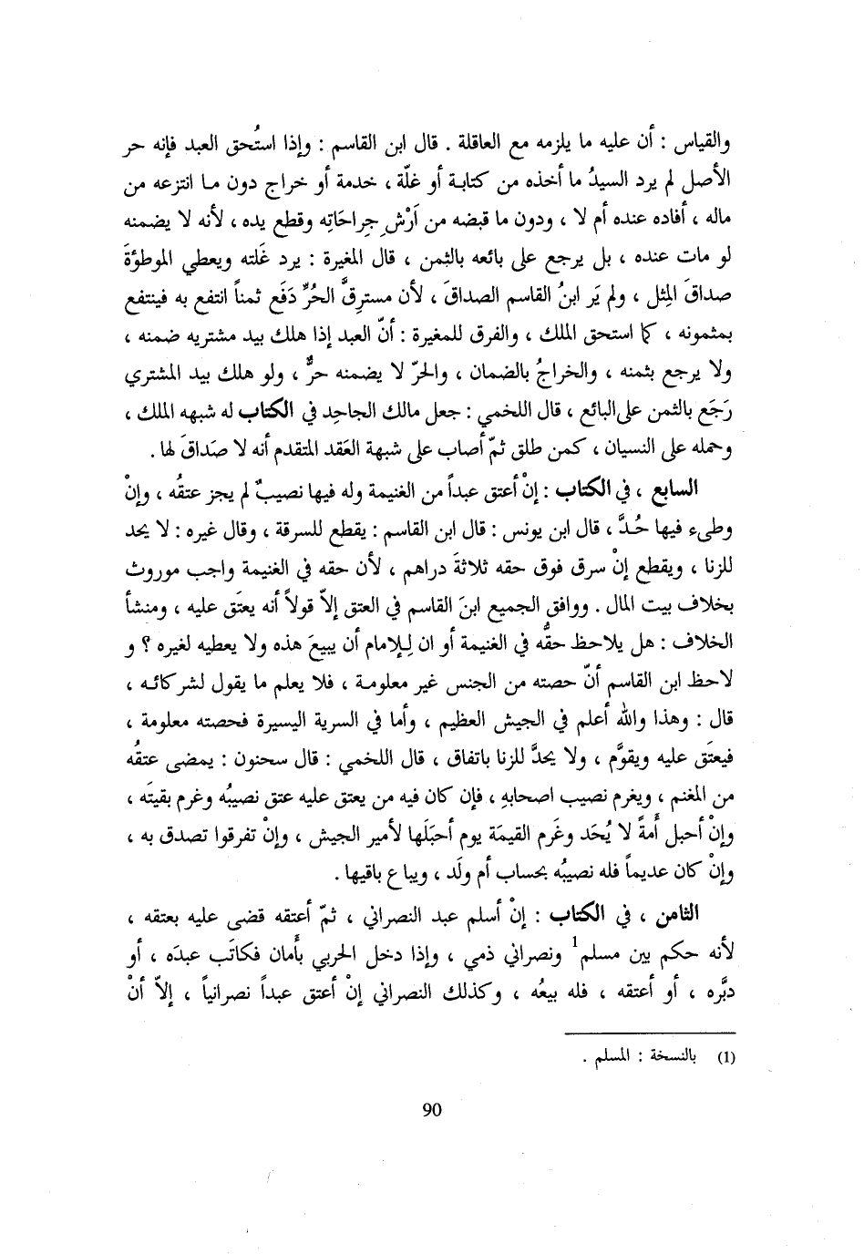 وَالْقِيَاسُ أَنَّ عَلَيْهِ مَا يَلْزَمُهُ مَعَ الْعَاقِلَةِ قَالَ ابْنُ الْقَاسِمِ وَإِذَا اسْتَحَقَّ الْعَبْدُ فَإِنَّهُ حُرُّ الْأَصْلِ لَمْ يُرِدِ السَّيِّدُ مَا أَخَذَهُ مِنْ كِتَابَةٍ أَوْ غَلَّةٍ خِدْمَةٌ أَوْ خَرَاجٌ دون مَا انتزعه من مَاله أَفَادَهُ عِنْده أَمْ لَا وَدُونَ مَا قَبَضَهُ مَنْ أَرْشِ جِرَاحَاتِهِ وَقَطْعِ يَدِهِ لِأَنَّهُ لَا يَضْمَنُهُ لَوْ مَاتَ عِنْدَهُ بَلْ يَرْجِعُ عَلَى بَائِعِهِ بِالثَّمَنِ قَالَ الْمُغيرَة يرد غَلَّته وَيُعْطِي الموطؤة صَدَاقَ الْمِثْلِ وَلَمْ يَرَ ابْنُ الْقَاسِمِ الصَّدَاقَ لِأَن مُسْتَرَقُّ الْحُرِّ دَفَعَ ثَمَنًا انْتَفَعَ بِهِ فَيَنْتَفِعُ بمثمونه كَمَا اسْتَحَقَّ الْمِلْكَ وَالْفَرْقُ لِلْمُغِيرَةِ أَنَّ الْعَبْدَ إِذَا هَلَكَ بِيَدِ مُشْتَرِيهِ ضَمِنَهُ وَلَا يَرْجِعُ بِثَمَنِهِ وَالْخَرَاجُ بِالضَّمَانِ وَالْحُرُّ لَا يَضْمَنُهُ حُرٌّ وَلَوْ هَلَكَ بِيَدِ الْمُشْتَرِي رَجَعَ بِالثَّمَنِ عَلَى الْبَائِعِ قَالَ اللَّخْمِيُّ جَعَلَ مَالِكٌ الْجَاحِدَ فِي الْكِتَابِ لَهُ شُبْهَةُ الْمِلْكِ وَحَمَلَهُ عَلَى النِّسْيَانِ كَمَنْ طَلَّقَ ثُمَّ أَصَابَ عَلَى شُبْهَةِ الْعَقْدِ الْمُتَقَدِّمِ أَنَّهُ لَا صَدَاقَ لَهَا السَّابِعُ فِي الْكِتَابِ إِنْ أَعْتَقَ عَبْدًا مِنَ الْغَنِيمَةِ وَلَهُ فِيهَا نَصِيبٌ لَمْ يَجُزْ عِتْقُهُ وَإِنْ وَطِئَ فِيهَا حُدَّ قَالَ ابْنُ يُونُسَ قَالَ ابْنُ الْقَاسِمِ يقطع للسرقة وَقَالَ غَيره لَا يحد للزِّنَا وَيُقْطَعْ إِنْ سَرَقَ فَوْقَ حَقِّهِ ثَلَاثَةَ دَرَاهِمَ لِأَنَّ حَقَّهُ فِي الْغَنِيمَةِ وَاجِبٌ مَوْرُوثٌ بِخِلَافِ بَيْتِ الْمَالِ وَوَافَقَ الْجَمِيعُ ابْنَ الْقَاسِمِ فِي الْعتْق إِلَّا قولا أَنَّهُ يَعْتِقُ عَلَيْهِ وَمَنْشَأُ الْخِلَافِ هَلْ يُلَاحَظُ حَقُّهُ فِي الْغَنِيمَةِ أَوْ أَنَّ لِلْإِمَامِ أَنْ يَبِيع هَذِه وَلَا يُعْطِيهِ لغيره وَلَا حَظّ ابْنُ الْقَاسِمِ أَنَّ حِصَّتَهُ مِنَ الْجِنْسِ غَيْرُ مَعْلُومَةٍ فَلَا يُعْلَمُ مَا يَقُولُ لِشُرَكَائِهِ قَالَ وَهَذَا وَاللَّهُ أَعْلَمُ فِي الْجَيْشِ الْعَظِيمِ وَأَمَّا فِي السَّرِيَّةِ الْيَسِيرَةِ فَحِصَّتُهُ مَعْلُومَةٌ فَيَعْتِقُ عَلَيْهِ وَيقوم وَلَا يحد للزِّنَا بِاتِّفَاقٍ قَالَ اللَّخْمِيُّ قَالَ سَحْنُونٌ يَمْضِي عِتْقُهُ مِنَ الْمَغْنَمِ وَيَغْرَمُ نَصِيبَ أَصْحَابِهِ فَإِنْ كَانَ فِيهِ مَنْ يُعْتَقُ عَلَيْهِ عَتَقَ نَصِيبُهُ وَغَرَمَ بَقِيَّتَهُ وَإِنْ أَحْبَلَ أَمَةً لَا يُحَدُّ وَغَرِمَ الْقِيمَةَ يَوْمَ أَحْبَلَهَا لِأَمِيرِ الْجَيْشِ وَإِنْ تَفَرَّقُوا تَصَدَّقَ بِهِ وَإِنْ كَانَ عَدِيمًا فَلَهُ نَصِيبُهُ بِحِسَابِ أُمِّ وَلَدٍ وَيُبَاعُ بَاقِيهَا الثَّامِنُ فِي الْكِتَابِ إِنْ أَسْلَمَ عَبْدُ النَّصْرَانِيِّ ثُمَّ أَعْتَقَهُ قَضَى عَلَيْهِ بِعِتْقِهِ لِأَنَّهُ حُكْمٌ بَيْنَ مُسْلِمٍ وَنَصْرَانِيٍّ ذِمِّيٍّ وَإِذَا دَخَلَ الْحَرْبِيُّ بِأَمَانٍ فَكَاتَبَ عَبْدَهُ أَوْ دَبَّرَهُ أَوْ أَعْتَقَهُ فَلَهُ بَيْعُهُ وَكَذَلِكَ النَّصْرَانِيُّ إِنْ أَعْتَقَ عَبْدًا نَصْرَانِيًّا إِلَّا أَن