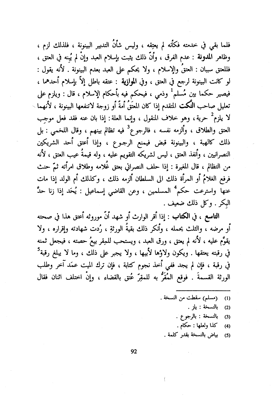 فَلَمَّا بَقِيَ فِي خِدْمَتِهِ فَكَأَنَّهُ لَمْ يُعْتِقْهُ وَلَيْسَ شَأْنُ التَّدْبِيرِ الْبَيْنُونَةَ فَلِذَلِكَ لَزِمَ وَظَاهِرُ الْمُدَوَّنَةِ عَدَمُ الْفَرْقِ وَأَنَّ ذَلِكَ يَثْبُتُ بِإِسْلَامِ الْعَبْدِ وَإِنْ لَمْ يَبِنْهُ فِي الْعِتْقِ فَلِلْعِتْقِ سَبَبَانِ الْعِتْقُ وَالْإِسْلَامُ وَلَا يُحْكَمُ عَلَى الْعَبْدِ بِعَدَمِ الْبَيْنُونَةِ لِأَنَّهُ يَقُولُ لَوْ كَانَتِ الْبَيْنُونَةُ لَرَجَعَ فِي الْعِتْقِ وَفِي الْمَوَّازِيَّةِ عِتْقُهُ بَاطِلٌ إِلَّا بِإِسْلَامِ أَحَدِهِمَا فَيَصِيرُ حُكْمًا بَيْنَ مُسْلِمٍ وَذِمِّيٍّ فَيُحْكَمُ فِيهِ بِأَحْكَامِ الْإِسْلَامِ قَالَ وَيَلْزَمُ عَلَى تَعْلِيلِ صَاحِبِ النُّكَتِ الْمُتَقَدِّمِ إِذَا كَانَ الْمُعْتق أمة اَوْ زَوْجَة لاتنفعها الْبَيْنُونَة لِأَنَّهُمَا لَا يلْزم حُرِّيَّةٌ وَهُوَ خِلَافُ الْمَنْقُولِ وَإِنَّمَا الْعِلَّةُ إِذَا بَانَ عَنْهُ فَقَدْ فَعَلَ مُوجِبَ الْعِتْقِ وَالطَّلَاقِ وَأَلْزَمَهُ نَفْسَهُ فَالرُّجُوعُ فِيهِ تَظَالُمٌ بَيْنَهُمْ وَقَالَ اللَّخْمِيُّ بَلْ ذَلِكَ كَالْهِبَةِ وَالْبَيْنُونَةُ قَبْضٌ فَيُمْنَعُ الرُّجُوعُ وَإِذَا أَعْتَقَ أَحَدُ الشَّرِيكَيْنِ النَّصْرَانِيَّيْنِ وَأَنْفَذَ الْعِتْقَ لَيْسَ لِشَرِيكِهِ التَّقْوِيمُ عَلَيْهِ وَلَهُ قِيمَةُ عَيْبِ الْعِتْقِ لِأَنَّهُ مِنَ التَّظَالُمِ قَالَ الْمُغِيرَةُ إِذَا حَلَفَ النَّصْرَانِيُّ بِعِتْقِ غُلَامِهِ وَطَلَاقِ امْرَأَتِهِ ثُمَّ حَنِثَ فَرَفَعَ الْغُلَامُ أَوِ الْمَرْأَةُ ذَلِكَ إِلَى السُّلْطَانِ أَلْزَمَهُ ذَلِكَ وَكَذَلِكَ أُمُّ الْوَلَدِ إِذَا مَاتَ عَنْهَا وَاسْتَرْعَتْ حُكْمَ الْمُسْلِمِينَ وَعَنِ الْقَاضِي إِسْمَاعِيلَ يُحَدُّ إِذَا زَنَا حَدَّ الْبِكْرِ وَكُلُّ ذَلِكَ ضَعِيفٌ التَّاسِعُ فِي الْكِتَابِ إِذَا أقرّ الْوَارِث اَوْ شهد أَن موروثه أَعْتَقَ هَذَا فِي صِحَّتِهِ أَوْ مَرَضِهِ وَالثُّلُثُ يَحْمِلُهُ وَأَنْكَرَ ذَلِكَ بَقِيَّةُ الْوَرَثَةِ رُدَّتْ شَهَادَتُهُ وَإِقْرَارُهُ وَلَا يُقَوَّمُ عَلَيْهِ لِأَنَّهُ لَمْ يُعْتَقْ وَرَقَّ الْعَبْدُ وَيُسْتَحَبُّ لِلْمُقِرِّ بَيْعُ حِصَّتِهِ فَيُجْعَلُ ثمنه فِي رقبته يعتقها وَيكون ولاؤها لأَبِيهَا وَلَا يجْبر على ذَلِك ومالا يبلغ رَقَبَة فِي رَقَبَة فَإِن لم يجد فَفِي أَخذ نُجُوم كِتَابَة فَإِن ترك الْمَيِّت عمد آخر وَطلب الْوَرَثَة الْقِسْمَة فَوَقع الْمقر بِهِ لِلْمُقِرِّ عَتَقَ بِالْقَضَاءِ وَإِنِ اخْتَلَفَ اثْنَانِ فَقَالَ