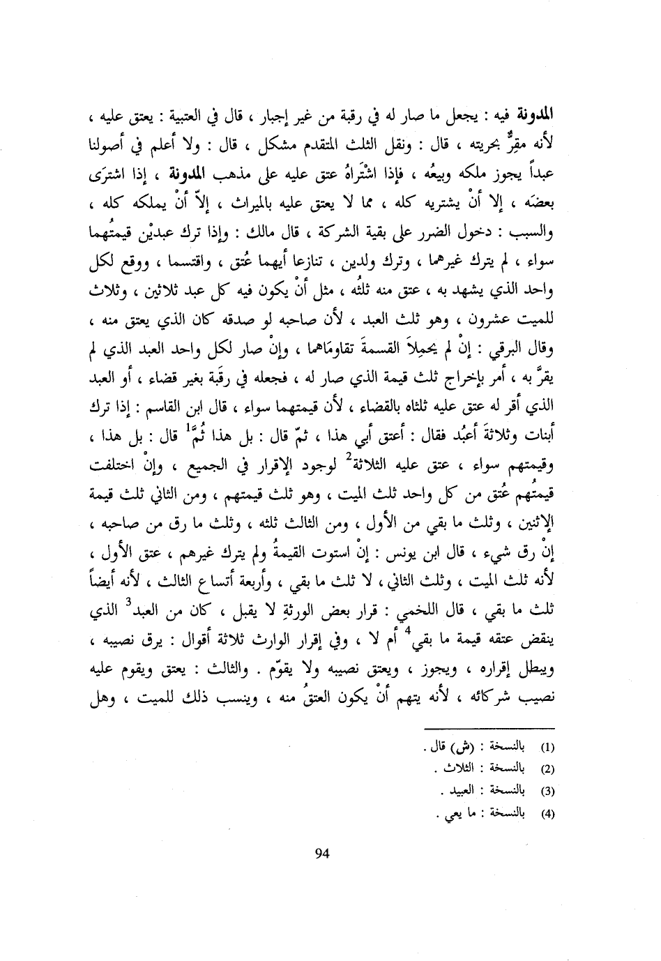 الْمُدَوَّنَةِ فِيهِ يُجْعَلُ مَا صَارَ لَهُ فِي رَقَبَةٍ مِنْ غَيْرِ إِجْبَارٍ قَالَ فِي الْعُتْبِيَّةِ يَعْتِقُ عَلَيْهِ لِأَنَّهُ مُقِرٌّ بِحُرِّيَّتِهِ قَالَ وَنَقْلُ الثُّلُثِ الْمُتَقَدِّمِ مُشْكِلٌ قَالَ وَلَا أَعْلَمُ فِي أُصُولِنَا عَبْدًا يَجُوزُ مِلْكُهُ وَبَيْعُهُ فَإِذَا اشْتَرَاهُ عَتَقَ عَلَيْهِ عَلَى مَذْهَبِ الْمُدَوَّنَةِ إِذَا اشْتَرَى بَعْضَهُ إِلَّا أَنْ يَشْتَرِيَهُ كُلَّهُ مِمَّا لَا يَعْتِقُ عَلَيْهِ بِالْمِيرَاثِ إِلَّا أَنْ يَمْلِكَهُ كُلَّهُ وَالسَّبَبُ دُخُولُ الضَّرَرِ عَلَى بَقِيَّةِ الشَّرِكَةِ قَالَ مَالِكٌ وَإِذَا تَرَكَ عَبْدَيْنِ قِيمَتُهُمَا سَوَاءٌ لَمْ يَتْرُكْ غَيْرَهُمَا وَتَرَكَ وَلَدَيْنِ تَنَازَعَا أَيُّهُمَا عَتَقَ واقتسما وَوَقع لكل وَاحِد الَّذِي يشْهد بِهِ عتق مِنْهُ ثلثه مثل أَن يكون فِيهِ كل عبد ثَلَاثِينَ وَثَلَاث للْمَيت عشرُون وَهُوَ ثلث الْعَبْدِ لِأَنَّ صَاحِبَهُ لَوْ صَدَّقَهُ كَانَ الَّذِي يَعْتِقُ مِنْهُ وَقَالَ الْبَرْقِيُّ إِنْ لَمْ يَحْمِلَا الْقِسْمَةَ تَقَاوَمَاهُمَا وَإِنْ صَارَ لِكُلِّ وَاحِدٍ الْعَبْدُ الَّذِي لَمْ يُقِرَّ بِهِ أَمَرَ بِإِخْرَاجِ ثُلُثِ قيمَة الَّذِي صَار لَهُ فَجعله فِي رَقَبَةٍ بِغَيْرِ قَضَاءٍ أَوِ الْعَبْدِ الَّذِي أَقَرَّ لَهُ عَتَقَ عَلَيْهِ ثُلُثَاهُ بِالْقَضَاءِ لِأَنَّ قِيمَتَهُمَا سَوَاءٌ قَالَ ابْنُ الْقَاسِمِ إِذَا تَرَكَ أبنات وَثَلَاثَةَ أَعْبُدٍ فَقَالَ أَعْتَقَ أَبِي هَذَا ثُمَّ قَالَ بَلْ هَذَا ثُمَّ قَالَ بَلْ هَذَا وَقِيمَتُهُمْ سَوَاءٌ عَتَقَ عَلَيْهِ الثَّلَاثَةَ لِوُجُودِ الْإِقْرَارِ فِي الْجَمِيعِ وَإِنِ اخْتَلَفَتْ قِيمَتُهُمْ عُتِقَ مِنْ كل وَاحِد ثلث الْمَيِّت وَهُوَ ثلث قيمتهم وَمِنَ الثَّانِي ثُلُثُ قِيمَةِ الِاثْنَيْنِ وَثُلُثُ مَا بَقِيَ مِنَ الْأَوَّلِ وَمِنَ الثَّالِثِ ثُلُثُهُ وَثُلُثُ مَا رق من صَاحبه إِنْ رَقَّ شَيْءٌ قَالَ ابْنُ يُونُسَ إِنِ اسْتَوَتِ الْقِيمَةُ وَلَمْ يَتْرُكَ غَيْرَهُمْ عَتَقَ الْأَوَّلُ لِأَنَّهُ ثُلُثُ الْمَيِّتِ وَثُلُثُ الثَّانِي لَا ثُلُثُ مَا بَقِيَ وَأَرْبَعَةُ أَتْسَاعِ الثَّالِثِ لِأَنَّهُ أَيْضًا ثلث مَا بَقِي قَالَ اللَّخْمِيّ قَرَار بَعْضِ الْوَرَثَةِ لَا يُقْبَلُ كَانَ مِنَ الْعَبْدِ الَّذِي ينْقض عِتْقَهُ قِيمَةُ مَا بَقِيَ أَمْ لَا وَفِي إِقْرَارِ الْوَارِثِ ثَلَاثَةُ أَقْوَالٍ يَرِقُّ نَصِيبُهُ وَيَبْطُلُ إِقْرَارُهُ وَيَجُوزُ وَيَعْتِقُ نَصِيبُهُ وَلَا يُقَوَّمُ وَالثَّالِثُ يَعْتِقُ وَيُقَوَّمُ عَلَيْهِ نَصِيبُ شُرَكَائِهِ لِأَنَّهُ يُتَّهَمُ أَنْ يَكُونَ الْعِتْقُ مِنْهُ وَيُنْسَبُ ذَلِكَ لِلْمَيِّتِ وَهل