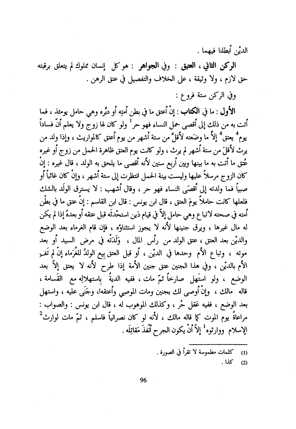 الْأَوَّلُ مَا فِي الْكِتَابِ إِنْ أَعْتَقَ مَا فِي بَطْنِ أَمَتِهِ أَوْ دَبَّرَهُ وَهِيَ حَامِلٌ يَوْمَئِذٍ فَمَا أَتَتْ بِهِ مِنْ ذَلِكَ إِلَى أَقْصَى حَمْلِ النِّسَاءِ فَهُوَ حُرٌّ وَلَوْ كَانَ لَهَا زَوْجٌ وَلَا يَعْلَمُ أَنَّ فَسَادًا يَوْمَ يَعْتِقُ إِلَّا مَا وَضَعَتْهُ لِأَقَلَّ مِنْ سِتَّةِ أَشْهُرٍ مِنْ يَوْمِ أَعْتَقَ كَالْمَوَارِيثِ وَإِذَا وُلِدَ مَنْ يَرِثُ لِأَقَلَّ مِنْ سِتَّةِ أَشْهُرٍ لَمْ يَرِثْ وَلَوْ كَانَتْ يَوْمَ الْعِتْقِ ظَاهِرَةَ الْحَمْلِ مِنْ زَوْجٍ أَوْ غَيْرِهِ عَتَقَ مَا أَتَتْ بِهِ مَا بَيْنَهَا وَبَيْنَ أَرْبَعِ سِنِينَ لِأَنَّهُ أَقْصَى مَا يُلْحَقُ بِهِ الْوَلَدُ قَالَ غَيْرُهُ إِنْ كَانَ الزَّوْجُ مُرْسَلًا عَلَيْهَا وَلَيْسَتْ بَيِّنَةَ الْحَمْلِ انْتَظَرَتْ إِلَى سِتَّةِ أَشْهُرٍ وَإِنْ كَانَ غَائِبًا أَوْ صَبِيًّا فَمَا وَلَدَتْهُ إِلَى أَقْصَى النِّسَاءِ فَهُوَ حُرٌّ وَقَالَ أَشْهَبُ لَا يسترق الْوَلَد بِالشَّكِّ فلعلها كَانَت حَامِلا يَوْمَ الْعِتْقِ قَالَ ابْنُ يُونُسَ قَالَ ابْنُ الْقَاسِمِ إِنْ عتق مَا فِي بطن أمته فِي صِحَّته لاتباع وَهِيَ حَامِلٌ إِلَّا فِي قِيَامِ دَيْنٍ اسْتَحْدَثَهُ قَبْلَ عِتْقِهِ أَوْ بَعْدَهُ إِذَا لَمْ يَكُنْ لَهُ مَالٌ غَيْرَهَا وَيَرِقُّ جَنِينُهَا لِأَنَّهُ لَا يَجُوزُ اسْتِثْنَاؤُهُ فَإِنْ قَامَ الْغُرَمَاءُ بَعْدَ الْوَضْعِ وَالِدَّيْنِ بَعْدَ الْعِتْقِ عَتَقَ الْوَلَدُ مِنْ رَأْسِ الْمَالِ وَلَدَتْهُ فِي مَرَضِ السَّيِّدِ أَوْ بَعْدَ مَوْتِهِ وَتُبَاعُ الْأُمُّ وَحْدَهَا فِي الدَّيْنِ أَوْ قَبْلَ الْعِتْقِ بِيعَ الْوَلَدُ لِلْغُرَمَاءِ إِنْ لَمْ تف الْأُم بِالدّينِ وَفِي هَذَا الْجَنِينِ عِتْقُ جَنِينِ الْأَمَةِ إِذَا طُرِحَ لِأَنَّهُ لَا يَعْتِقُ إِلَّا بَعْدَ الْوَضْعِ وَلَوِ اسْتَهَلَّ صَارِخًا ثُمَّ مَاتَ فَفِيهِ الدِّيَةُ بِاسْتِهْلَالِهِ مَعَ الْقَسَامَةِ قَالَهُ مَالِكٌ وَإِنْ أَوْصَى لَكَ بجنين وَمَات الْمُوصي وَأعْتقهُ وَجَنَى عَلَيْهِ وَاسْتَهَلَّ بَعْدَ الْوَضْعِ فَفِيهِ عَقْلُ حُرٍّ وَكَذَلِكَ الْمَوْهُوبُ لَهُ قَالَ ابْنُ يُونُسَ وَالصَّوَابُ مُرَاعَاةُ يَوْمِ الْمَوْتِ كَمَا قَالَهُ مَالِكٌ لِأَنَّهُ لَوْ كَانَ نَصْرَانِيًّا فَأَسْلَمَ ثُمَّ مَاتَ لوَارث الْإِسْلَام ووارثوه إِلَّا أَنْ يَكُونَ الْجُرْحُ أَنْفَذَ مَقَاتِلَهُ