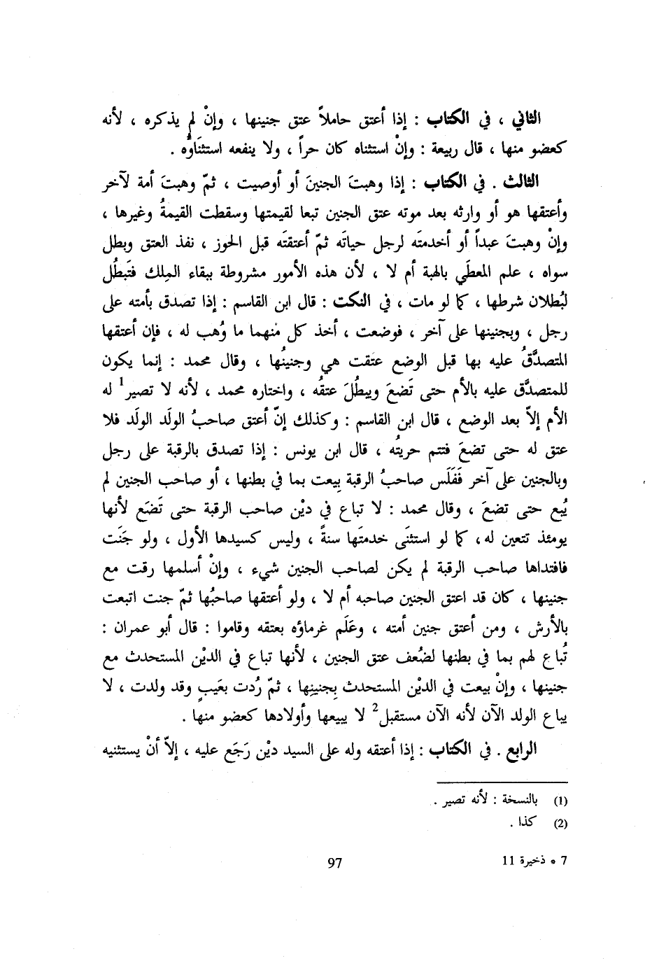 الثَّانِي فِي الْكِتَابِ إِذَا أَعْتَقَ حَامِلًا عُتِقَ جَنِينُهَا وَإِنْ لَمْ يَذْكُرْهُ لِأَنَّهُ كَعُضْوٍ مِنْهَا قَالَ رَبِيعَةُ وَإِنِ اسْتَثْنَاهُ كَانَ حُرًّا وَلَا يَنْفَعُهُ اسْتِثْنَاؤُهُ الثَّالِثُ فِي الْكِتَابِ إِذَا وَهَبْتَ الْجَنِين اَوْ أوصيت ثُمَّ وَهَبْتَ أُمَّهُ لِآخَرَ وَأَعْتَقَهَا هُوَ أَوْ وَارثه بعد مَوته عتق الْجَنِين تبعا لقيمتها وَسَقَطَتِ الْقِيمَةُ وَغَيْرُهَا وَإِنْ وَهَبْتَ عَبْدًا أَوْ أَخَدَمْتَهُ لِرَجُلٍ حَيَاتَهُ ثُمَّ أَعْتَقْتَهُ قَبْلَ الْحَوْزِ نَفَذَ الْعِتْقُ وَبَطَلَ سِوَاهُ عَلِمَ الْمُعْطِي بِالْهِبَةِ أَمْ لَا لِأَنَّ هَذِهِ الْأُمُورَ مَشْرُوطَةٌ بِبَقَاءِ الْمِلْكِ فَتَبْطُلُ لِبُطْلَانِ شَرْطِهَا كَمَا لَوْ مَاتَ فِي النُّكَتِ قَالَ ابْنُ الْقَاسِمِ إِذَا تَصَدَّقَ بِأَمَتِهِ عَلَى رَجُلٍ وَبِجَنِينِهَا عَلَى آخَرَ فَوَضَعَتْ أَخَذَ كُلٌّ مِنْهُمَا مَا وُهِبَ لَهُ فَإِنْ أَعْتَقَهَا الْمُتَصَدِّقُ عَلَيْهِ بِهَا قَبْلَ الْوَضْعِ عُتِقَتْ هِيَ وَجَنِينُهَا وَقَالَ مُحَمَّدٌ إِنَّمَا يَكُونُ لِلْمُتَصَدِّقِ عَلَيْهِ بِالْأُمِّ حَتَّى تَضَعَ وَيَبْطُلَ عِتْقُهُ وَاخْتَارَهُ مُحَمَّدٌ لِأَنَّهُ لَا تَصِيرُ لَهُ الْأُمُّ إِلَّا بَعْدَ الْوَضْعِ قَالَ ابْنُ الْقَاسِمِ وَكَذَلِكَ إِنْ أعتق صَاحب الْوَلَدَ فَلَا عِتْقَ لَهُ حَتَّى تَضَعَ فَتَتِمُّ حُرِّيَّتُهُ قَالَ ابْنُ يُونُسَ إِذَا تَصَدَّقَ بِالرَّقَبَةِ عَلَى رَجُلٍ وَبِالْجَنِينِ عَلَى آخَرَ فَفَلَّسَ صَاحِبُ الرَّقَبَةِ بِيعَتْ بِمَا فِي بَطْنِهَا أَوْ صَاحِبُ الْجَنِينِ لَمْ يُبَعْ حَتَّى تَضَعَ وَقَالَ مُحَمَّدٌ لَا تُبَاعُ فِي دَيْنِ صَاحِبِ الرَّقَبَةِ حَتَّى تَضَعَ لِأَنَّهَا يَوْمَئِذٍ تَتَعَيَّنُ لَهُ كَمَا لَوِ اسْتَثْنَى خِدْمَتَهَا سَنَةً وَلَيْسَ كَسَيِّدِهَا الْأَوَّلِ وَلَوْ جَنَّتْ فَافْتَدَاهَا صَاحِبُ الرَّقَبَةِ لَمْ يَكُنْ لِصَاحِبِ الْجَنِينِ شَيْءٌ وَإِنْ أَسْلَمَهَا رَقَّتْ مَعَ جَنِينِهَا كَانَ قَدْ أَعْتَقَ الْجَنِينُ صَاحِبَهُ أَمْ لَا وَلَوْ أَعْتَقَهَا صَاحِبُهَا ثُمَّ جَنَّتِ اتُّبِعَتْ بِالْأَرْشِ وَمَنْ أَعْتَقَ جَنَيْنَ أَمَتِهِ وَعَلِمَ غُرَمَاؤُهُ بِعِتْقِهِ وَقَامُوا قَالَ أَبُو عِمْرَانَ تُبَاعُ لَهُمْ بِمَا فِي بَطْنِهَا لِضَعْفِ عِتْقِ الْجَنِينِ لِأَنَّهَا تُبَاعُ فِي الدَّيْنِ الْمُسْتَحْدَثِ مَعَ جَنِينِهَا وَإِنْ بِيعَتْ فِي الدَّيْنِ الْمُسْتَحْدَثِ بِجَنِينِهَا ثُمَّ رُدَّتْ بِعَيْبٍ وَقَدْ وَلَدَتْ لَا يُبَاعُ الْوَلَدُ الْآنَ لِأَنَّهُ الْآن مُسْتَقْبل لَا يَبِيعهَا أَوْلَادهَا كَعُضْوٍ مِنْهَا الرَّابِعُ فِي الْكِتَابِ إِذَا أَعْتَقَهُ وَلَهُ عَلَى السَّيِّدِ دَيْنٌ رَجَعَ عَلَيْهِ إِلَّا أَن يستثنيه