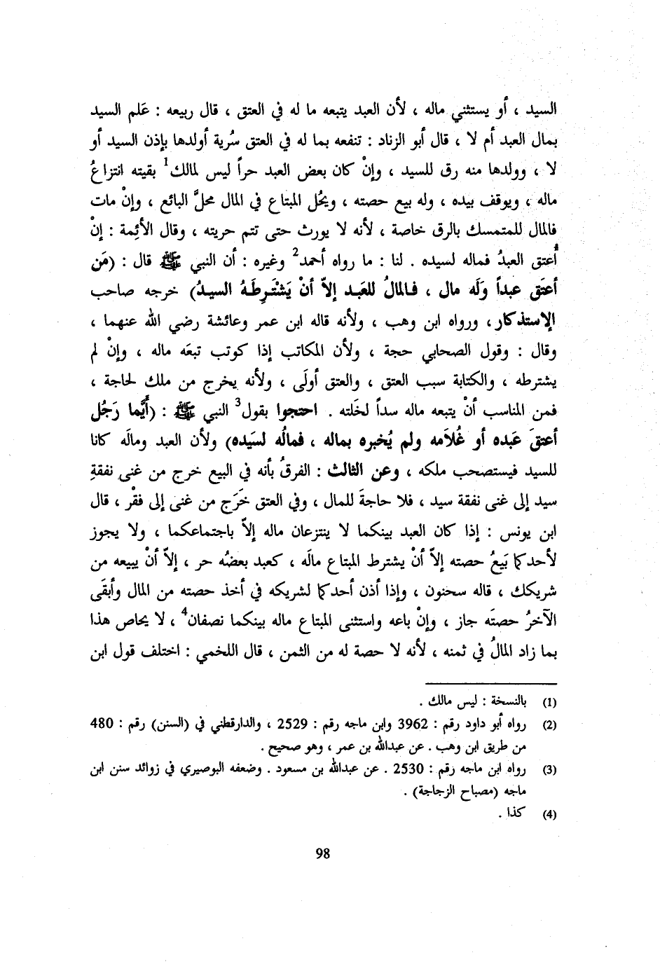 السَّيِّدُ أَوْ يَسْتَثْنِيَ مَالَهُ لِأَنَّ الْعَبْدَ يَتْبَعُهُ مَا لَهُ فِي الْعِتْقِ قَالَ رَبِيعَةُ عَلِمَ السَّيِّدُ بِمَالِ الْعَبْدِ أَمْ لَا قَالَ أَبُو الزِّنَاد تَنْفَعهُ بِمَا لَهُ فِي الْعِتْقِ سُرِّيَّةٌ أَوْلَدَهَا بِإِذْنِ السَّيِّدِ أَوْ لَا وَوَلَدُهَا مِنْهُ رِقٌّ لِلسَّيِّدِ وَإِنْ كَانَ بَعْضُ الْعَبْدِ حُرًّا لَيْسَ لِمَالِكِ بَقِيَّتِهِ انْتِزَاعُ مَالِهِ وَيُوقَفُ بِيَدِهِ وَلَهُ بَيْعُ حِصَّتِهِ وَيَحِلُّ الْمُبْتَاعُ فِي الْمَالِ مَحَلَّ الْبَائِعِ وَإِنْ مَاتَ فَالْمَالُ لِلْمُتَمَسِّكِ بِالرِّقِّ خَاصَّةً لِأَنَّهُ لَا يُوَرَّثُ حَتَّى تَتِمَّ حُرِّيَّتُهُ وَقَالَ الْأَئِمَّةُ إِنْ أَعْتَقَ الْعَبْدُ فَمَالُهُ لِسَيِّدِهِ لَنَا مَا رَوَاهُ أَحْمَدُ وَغَيْرُهُ أَنَّ النَّبِيَّ - صَلَّى اللَّهُ عَلَيْهِ وَسَلَّم َ - قَالَ مَنْ أَعْتَقَ عَبْدًا وَلَهُ مَالٌ فَالْمَالُ لِلْعَبْدِ إِلَّا أَنْ يَشْتَرِطَهُ السَّيِّدُ خَرَّجَهُ صَاحِبُ الِاسْتِذْكَارِ وَرَوَاهُ ابْنُ وَهْبٍ وَلِأَنَّهُ قَالَهُ ابْنُ عُمَرَ وَعَائِشَةُ رَضِيَ اللَّهُ عَنْهُمَا وَقَالَ وَقَوْلُ الصَّحَابِيِّ حُجَّةٌ وَلِأَنَّ الْمُكَاتَبَ إِذَا كُوتِبَ تَبِعَهُ مَالُهُ وَإِنْ لَمْ يَشْتَرِطْهُ وَالْكِتَابَةُ سَبَبُ الْعِتْقِ وَالْعِتْق أولى وَلِأَنَّهُ يخرج من ملك لحَاجَة فَمِنَ الْمُنَاسِبِ أَنْ يَتْبَعَهُ مَالُهُ سَدًّا لَخَلَّتِهِ احْتَجُّوا بِقَوْلِ النَّبِيِّ - صَلَّى اللَّهُ عَلَيْهِ وَسَلَّم َ - أَيُّمَا رَجُلٍ أَعْتَقَ عَبْدَهُ أَوْ غُلَامَهُ وَلَمْ يُخْبِرْهُ بِمَالِهِ فَمَالُهُ لِسَيِّدِهِ وَلِأَنَّ الْعَبْدَ وَمَالَهُ كَانَا لِلسَّيِّدِ فَيَسْتَصْحِبُ مِلْكُهُ وَعَنِ الثَّالِثِ الْفَرْقُ بِأَنَّهُ فِي الْبَيْعِ خَرَجَ مِنْ غِنَى نَفَقَةِ سَيِّدٍ إِلَى غِنَى نَفَقَةِ سَيِّدٍ فَلَا حَاجَةَ لِلْمَالِ وَفِي الْعِتْقِ خَرَجَ مِنْ غِنًى إِلَى فَقْرٍ قَالَ ابْنُ يُونُسَ إِذَا كَانَ الْعَبْدُ بَيْنكُمَا لَا ينتزعان مَالَهُ إِلَّا بِاجْتِمَاعِكُمَا وَلَا يَجُوزُ لِأَحَدِكُمَا بَيْعُ حِصَّتِهِ إِلَّا أَنْ يَشْتَرِطَ الْمُبْتَاعُ مَالَهُ كَعَبْدٍ بعضه حر إِلَّا أَن يَبِيعهُ مِنْ شَرِيكِكَ قَالَهُ سَحْنُونٌ وَإِذَا أَذِنَ أَحَدُكُمَا لِشَرِيكِهِ فِي أَخْذِ حِصَّتِهِ مِنَ الْمَالِ وَأَبْقَى الْآخَرُ حِصَّتَهُ جَازَ وَإِنْ بَاعَهُ وَاسْتَثْنَى الْمُبْتَاعُ مَالَهُ بَيْنَكُمَا نِصْفَانِ لَا يُحَاصُّ هَذَا بِمَا زَادَ الْمَالُ فِي ثَمَنِهِ لِأَنَّهُ لَا حِصَّةَ لَهُ مِنَ الثَّمَنِ قَالَ اللَّخْمِيُّ اخْتَلَفَ قَوْلُ ابْنِ