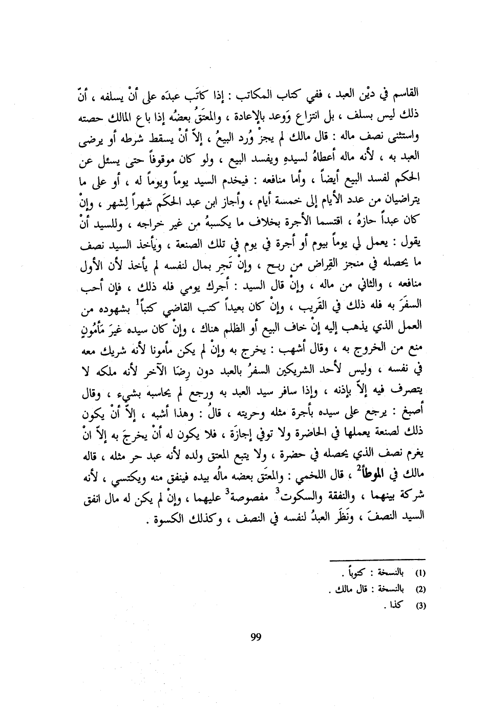 الْقَاسِمِ فِي دَيْنِ الْعَبْدِ فَفِي كِتَابِ الْمُكَاتَبِ إِذَا كَاتَبَ عَبْدَهُ عَلَى أَنْ يُسْلِفَهُ أَنَّ ذَلِكَ لَيْسَ بِسَلَفٍ بَلِ انْتِزَاعٌ وَوَعْدٌ بِالْإِعَادَةِ وَالْمُعْتَقُ بَعْضُهُ إِذَا بَاعَ الْمَالِكُ حِصَّتَهُ وَاسْتَثْنَى نِصْفَ مَالِهِ قَالَ مَالِكٌ لَمْ يَجُزْ وَرُدَّ الْبَيْعُ إِلَّا أَنْ يَسْقُطَ شَرْطُهُ أَوْ يَرْضَى الْعَبْدُ بِهِ لِأَنَّهُ مَالُهُ أَعْطَاهُ لِسَيِّدِهِ وَيَفْسُدُ الْبَيْعُ وَلَوْ كَانَ مَوْقُوفًا حَتَّى يُسْأَلَ عَنِ الْحُكْمِ لَفَسَدَ الْبَيْعُ أَيْضًا وَأَمَّا مَنَافِعُهُ فَيَخْدِمُ السَّيِّدُ يَوْمًا وَيَوْمًا لَهُ أَوْ عَلَى مَا يَتَرَاضَيَانِ مِنْ عَدَدِ الْأَيَّامِ إِلَى خَمْسَةِ أَيَّامٍ وَأَجَازَ ابْنُ عَبْدِ الْحَكَمِ شَهْرًا لِشَهْرٍ وَإِنْ كَانَ عبدا حازه اقْتَسَمَا الْأُجْرَةَ بِخِلَافِ مَا يَكْسِبُهُ مِنْ غَيْرِ خَرَاجِهِ وَلِلسَّيِّدِ أَنْ يَقُولَ يَعْمَلُ لِي يَوْمًا بِيَوْم أَو أُجْرَة فِي يَوْمٍ فِي تِلْكَ الصَّنْعَةِ وَيَأْخُذُ السَّيِّدُ نِصْفَ مَا يُحَصِّلُهُ فِي مُنْجَزِ الْقِرَاضِ مِنْ رِبْحٍ وَإِنْ تَجَرَ بِمَالٍ لِنَفْسِهِ لَمْ يَأْخُذْ لِأَنَّ الْأَوَّلَ مَنَافِعُهُ وَالثَّانِي مِنْ مَالِهِ وَإِنْ قَالَ السَّيِّد أجرك يَوْمِي فَلَهُ ذَلِكَ فَإِنْ أَحَبَّ السَّفَرَ بِهِ فَلَهُ ذَلِكَ فِي الْقَرِيبِ وَإِنْ كَانَ بَعِيدًا كَتَبَ الْقَاضِي كُتُبًا بِشُهُودِهِ مِنَ الْعَمَلِ الَّذِي يَذْهَبُ إِلَيْهِ إِنْ خَافَ الْبَيْعَ أَوِ الظُّلْمَ هُنَاكَ وَإِنْ كَانَ سَيِّدُهُ غَيْرَ مَأْمُونٍ مُنِعَ مِنَ الْخُرُوجِ بِهِ وَقَالَ أَشْهَبُ يَخْرُجُ بِهِ وَإِنْ لَمْ يَكُنْ مَأْمُونًا لِأَنَّهُ شَرِيكٌ مَعَهُ فِي نَفْسِهِ وَلَيْسَ لِأَحَدِ الشَّرِيكَيْنِ السَّفَرُ بِالْعَبْدِ دُونَ رِضَا الْآخَرِ لِأَنَّهُ مِلْكُهُ لَا يَتَصَرَّفُ فِيهِ إِلَّا بِإِذْنِهِ وَإِذَا سَافَرَ سَيِّدُ الْعَبْدِ بِهِ وَرَجَعَ لَمْ يُحَاسِبْهُ بِشَيْءٍ وَقَالَ أَصْبَغُ يَرْجِعُ عَلَى سَيِّدِهِ بِأُجْرَةِ مِثْلِهِ وَحُرِّيَّتِهِ قَالَ وَهَذَا أَشْبَهُ إِلَّا أَنْ يَكُونَ ذَلِكَ لِصَنْعَةٍ يعملها فِي الْحَاضِرَة وَلَا توفّي إجَازَة فَلَا يَكُونُ لَهُ أَنْ يَخْرُجَ بِهِ إِلَّا أَنْ يَغْرَمَ نِصْفَ الَّذِي يُحَصِّلُهُ فِي حَضَرِهِ وَلَا يَتْبَعُ الْمُعْتَقَ وَلَدُهُ لِأَنَّهُ عَبْدُ حُرٍّ مِثْلِهِ قَالَهُ مَالِكٌ فِي الْمُوَطَّأِ قَالَ اللَّخْمِيُّ وَالْمُعْتَقُ بَعْضُهُ مَالُهُ بِيَدِهِ فَيُنْفِقُ مِنْهُ وَيَكْتَسِي لِأَنَّهُ شركَة بَينهمَا وَالنَّفقَة وَالسُّكُوت مفصوصة عَلَيْهِمَا وَإِنْ لَمْ يَكُنْ لَهُ مَالٌ أَنْفَقَ السَّيِّدُ النِّصْفَ وَنَظَرَ الْعَبْدُ لِنَفْسِهِ فِي النِّصْفِ وَكَذَلِكَ الْكسْوَة