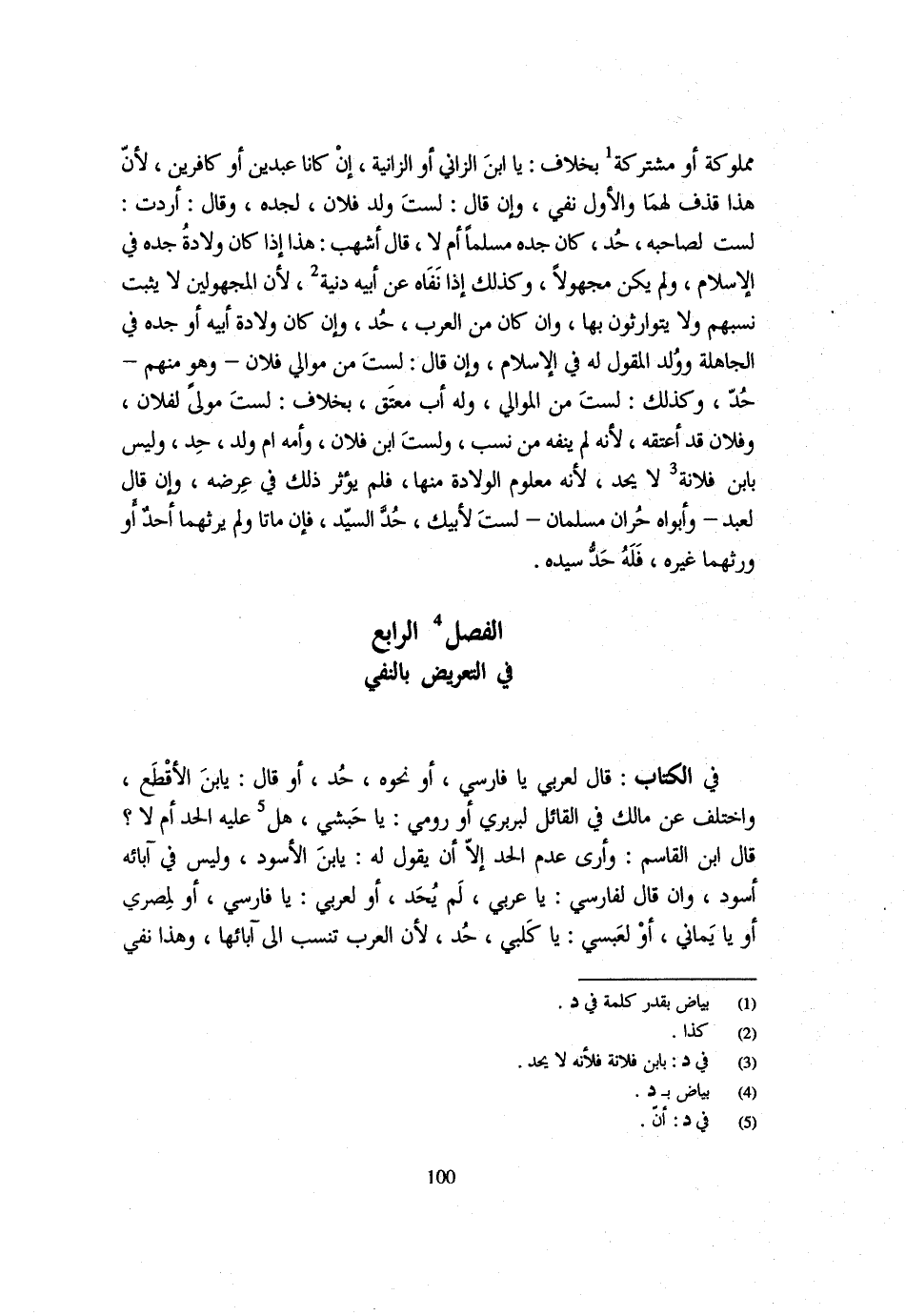 فِي الْكِتَابِ قَالَ لِعَرَبِيٍّ يَا فَارِسِيُّ أَوْ نَحوه حد أَو قَالَ يَا بن الْأَقْطَعِ وَاخْتُلِفَ عَنْ مَالِكٍ فِي الْقَائِلِ لِبَرْبَرِيٍّ أَوْ رُومِيٍّ يَا حَبَشِيُّ هَلْ عَلَيْهِ الْحَدُّ أم لَا قَالَ ابْن الْقَاسِم وَأرى عج الْحَد إِلَّا أَن يَقُول لَهُ يَابْنَ الْأَسْوَدِ وَلَيْسَ فِي آبَائِهِ أَسْوَدُ وَإِنْ قَالَ لِفَارِسِيٍّ يَا عَرَبِيُّ لَمْ يُحَدَّ أَوْ لِعَرَبِيٍّ يَا فَارسي أَو لمصري أَو يَا يَمَانِيُّ أَوْ لِعَبْسِيٍّ يَا كَلْبِيُّ حُدَّ لِأَنَّ الْعَرَبَ تُنْسَبُ إِلَى آبَائِهَا وَهَذَا نَفْيٌ