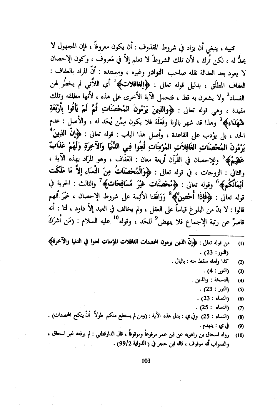 تَنْبِيه يَنْبَغِي أَنْ يُزَادَ فِي شُرُوطِ الْمَقْذُوفِ أَنْ يَكُونَ مَعْرُوفًا فَإِنَّ الْمَجْهُولَ لَا يُحَدُّ لَهُ لَكِنْ تُرِكَ لِأَنَّ تِلْكَ الشُّرُوطَ لَا تُعْلَمُ إِلَّا فِي مَعْرُوفٍ وَكَوْنُ الْإِحْصَانِ لَا يَعُودُ بَعْدَ الْعَدَالَةِ نَقَلَهُ صَاحِبُ النَّوَادِرِ وَغَيْرُهُ وَمُسْتَنَدُهُ أَنَّ الْمُرَادَ بِالْعَفَافِ الْعَفَافُ الْمُطْلَقُ بِدَلِيلِ قَوْله تَعَالَى {الْغَافِلَات} أَيِ اللَّاتِي لَمْ يَخْطُرْ لَهُنَّ الْفَسَادُ وَلَا يَشْعُرْنَ بِهِ قَطُّ فَتُحْمَلُ الْآيَةُ الْأُخْرَى عَلَى هَذِهِ لِأَنَّهَا مُطْلَقَةٌ وَتِلْكَ مُقَيَّدَةٌ وَهِيَ قَوْله تَعَالَى {وَالَّذِينَ يَرْمُونَ الْمُحْصَنَاتِ ثُمَّ لَمْ يَأْتُوا بأَرْبعَة شُهَدَاء} وَهَذَا قد شهر بِالزِّنَا وَفعله فَلَا يكون مِمَّن يحجّ لَهُ وَالْأَصْلُ عَدَمُ الْحَدِّ بَلْ يُؤَدَّبُ عَلَى الْقَاعِدَةِ وَأَصْلُ هَذَا الْبَابِ قَوْله تَعَالَى {إِنَّ الَّذِينَ يَرْمُونَ الْمُحْصَنَاتِ الْغَافِلاتِ الْمُؤْمِنَاتِ لُعِنُوا فِي الدُّنْيَا وَالْآخِرَة وَلَهُم عَذَاب عَظِيم} وَلِلْإِحْصَانِ فِي الْقُرْآنِ أَرْبَعَةُ مَعَانٍ الْعَفَافُ وَهُوَ الْمُرَادُ بِهَذِهِ الْآيَةِ وَالثَّانِي الزَّوْجَاتُ فِي قَوْله تَعَالَى {محصنات غير مسافحات} وَالثَّالِثُ الْحُرِّيَّةُ فِي قَوْله تَعَالَى {فَإِذَا أُحْصِنَّ} وَوَافَقَنَا الْأَئِمَّةُ عَلَى شُرُوطِ الْإِحْصَانِ غَيْرَ أَنَّهُمْ قَالُوا لابد مِنَ الْبُلُوغِ قِيَاسًا عَلَى الْعَقْلِ وَلَمْ يُخَالِفْ فِي الْعَبْدِ إِلَّا دَاوُدُ لَنَا أَنَّهُ قَاصِرٌ عَنْ رُتْبَةِ الْإِجْمَاعِ فَلَا يَنْهَضُ لِلْحَدِّ وَقَوْلُهُ عَلَيْهِ السَّلَامُ (مَنْ أَشْرَكَ
