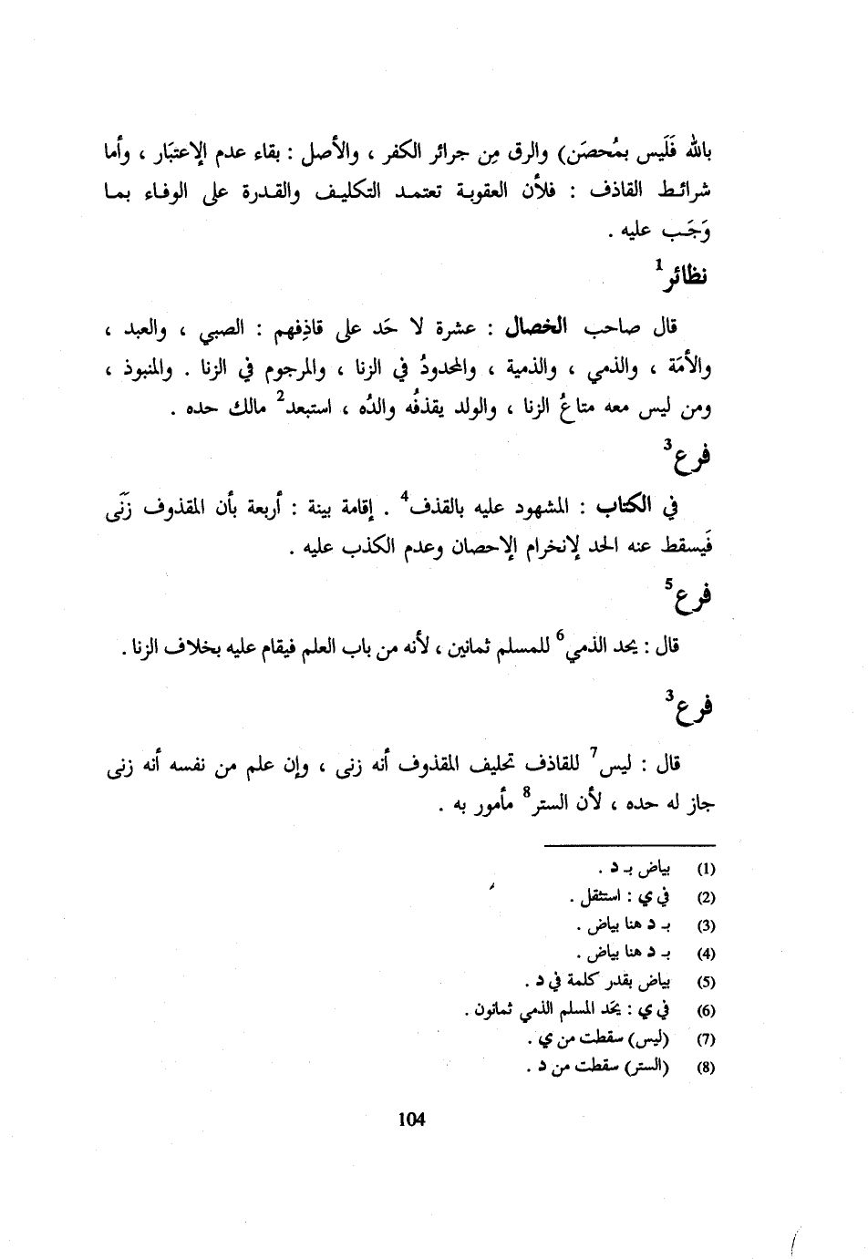 نَظَائِرُ قَالَ صَاحِبُ الْخِصَالِ عَشَرَةٌ لَا حَدَّ عَلَى قَاذِفِهِمُ الصَّبِيُّ وَالْعَبْدُ وَالْأمة وَالذِّمِّيّ والذمية وَالْمَحْدُودُ فِي الزِّنَا وَالْمَرْجُومُ فِي الزِّنَا وَالْمَنْبُوذُ وَمَنْ لَيْسَ مَعَهُ مَتَاعُ الزِّنَا وَالْوَلَدُ يَقْذِفُهُ وَالِدُهُ اسْتَبْعَدَ مَالِكٌ حَدَّهُ