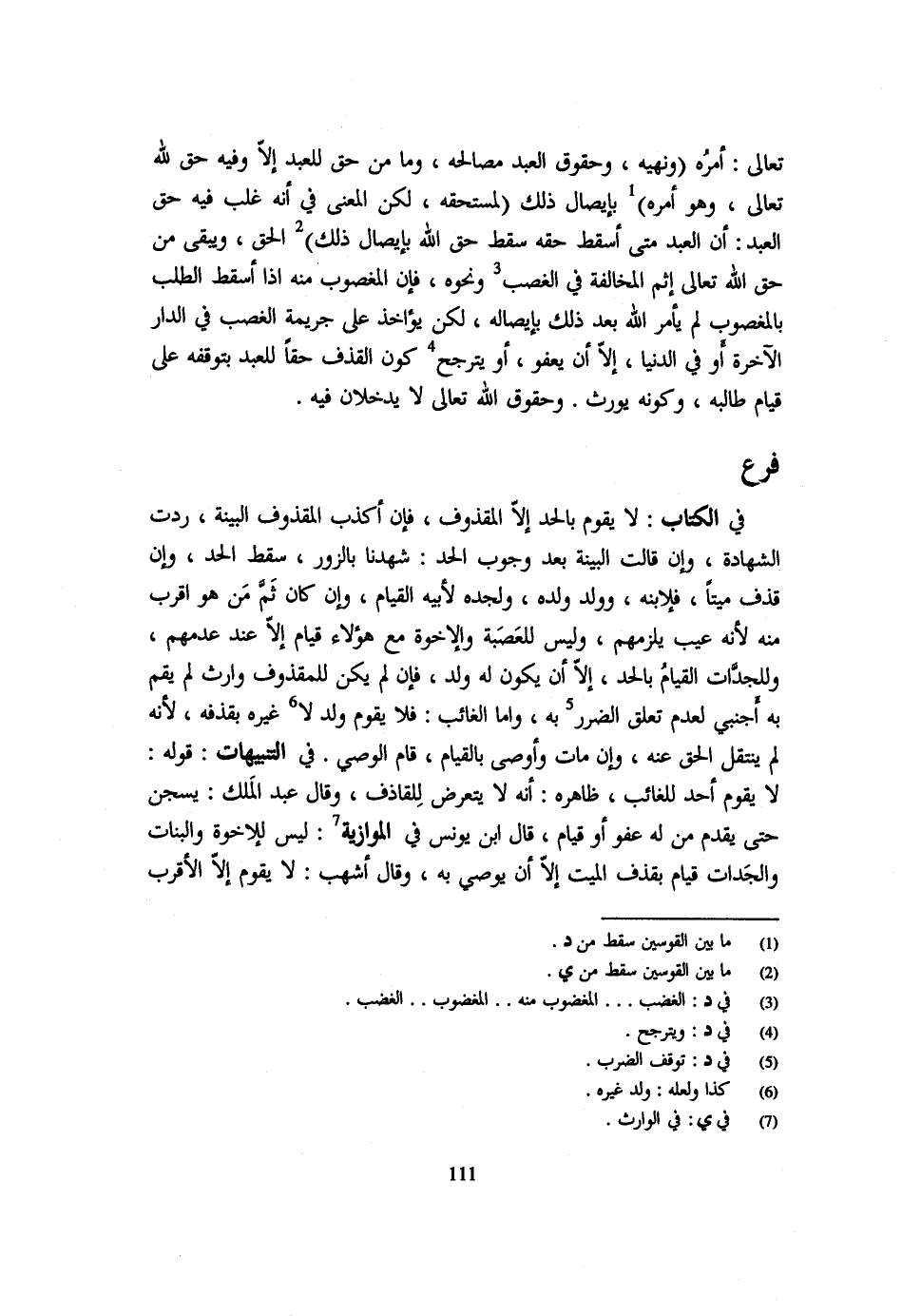 تَعَالَى أَمْرُهُ (وَنَهْيُهُ وَحُقُوقُ الْعَبْدِ مَصَالِحُهُ وَمَا مِنْ حَقٍّ لِلْعَبْدِ إِلَّا وَفِيهِ حَقٌّ لِلَّهِ تَعَالَى وَهُوَ أَمْرُهُ) بِإِيصَالِ ذَلِكَ (لِمُسْتَحِقِّهِ لَكِنَّ الْمَعْنَى فِي أَنَّهُ غَلَبَ فِيهِ حَقُّ الْعَبْدِ أَن العَبْد مَتى أسْقطه حَقُّهُ سَقَطَ حَقُّ اللَّهِ بِإِيصَالِ ذَلِكَ) الْحَقِّ وَيَبْقَى مِنْ حَقِّ اللَّهِ تَعَالَى إِثْمُ الْمُخَالَفَةِ فِي الْغَصْبِ وَنَحْوِهِ فَإِنَّ الْمَغْصُوبَ مِنْهُ إِذَا أَسْقَطَ الطَّلَبَ بِالْمَغْصُوبِ لَمْ يَأْمُرِ اللَّهُ بَعْدَ ذَلِكَ بِإِيصَالِهِ لَكِنْ يُؤَاخَذُ عَلَى جَرِيمَةِ الْغَصْبِ فِي الدَّارِ الْآخِرَةِ أَوْ فِي الدُّنْيَا إِلَّا أَنْ يَعْفُوَ أَوْ يَتَرَجَّحَ كَوْنُ الْقَذْفِ حَقًّا للْعَبد بتوقفه على قايم طَالبه وَكَونه يُورث وَحُقُوق الله تعلى لَا يَدْخُلَانِ فِيهِ