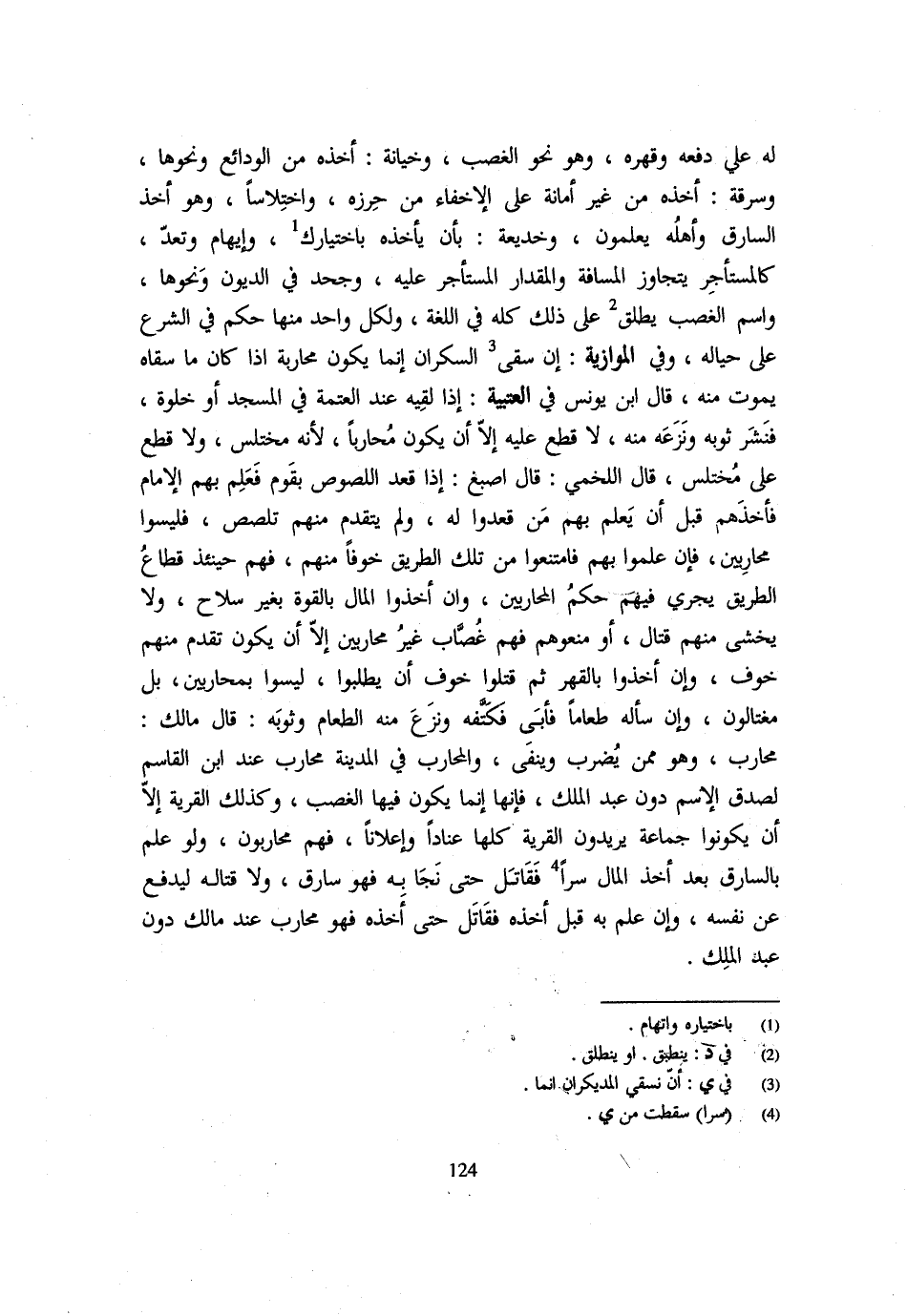 لَهُ عَلَى دَفْعِهِ وَقَهْرِهِ وَهُوَ نَحْوُ الْغَصْبِ وخيانة أَخذه من الودائع وَنَحْوهَا وسرقة أَخْذُهُ مِنْ غَيْرِ أَمَانَةٍ عَلَى الْإِخْفَاءِ مَنْ حرزه اختلاسا وَهُوَ أَخْذُ السَّارِقِ وَأَهْلُهُ يَعْلَمُونَ وَخَدِيعَةٌ بِأَنْ يَأْخُذَهُ بِاخْتِيَارِكَ وَإِيهَامٍ وَتَعَدٍّ كَالْمُسْتَأْجِرِ يَتَجَاوَزُ الْمَسَافَةَ ولمقدار الْمُسْتَأْجِرِ عَلَيْهِ وَجَحَدَ فِي الدُّيُونِ وَنَحْوِهَا وَاسْمُ الْغَصْبِ يُطْلَقُ عَلَى ذَلِكَ كُلِّهِ فِي اللُّغَةِ وَلكُل وَاحِد مِنْهَا حكم فِي الشَّرْع حلى حِيَالِهِ وَفِي الْمَوَّازِيَّةِ إِنْ سَقَى السَّكْرَانَ إِنَّمَا يَكُونُ مُحَارَبَةً إِذَا كَانَ مَا سَقَاهُ يَمُوتُ مِنْهُ قَالَ ابْنُ يُونُسَ فِي الْعُتْبِيَّةِ إِذَا لَقِيَهُ عِنْدَ الْعَتَمَةِ فِي الْمَسْجِدِ أَوْ خَلْوَةٍ فنشر ثَوْبه ونزعه مِنْهُ لَا قطع لعيه إِلَّا أَنْ يَكُونَ مُحَارِبًا لِأَنَّهُ مُخْتَلِسٌ وَلَا قَطْعَ عَلَى مُخْتَلِسٍ قَالَ اللَّخْمِيُّ قَالَ أَصْبَغُ إِذَا قَعَدَ اللُّصُوصُ بِقَوْمٍ فَعَلِمَ بِهِمِ الْإِمَامُ فَأَخَذَهُمْ قَبْلَ أَنْ يَعْلَمَ بِهِمْ مَنْ قَعَدُوا لَهُ وَلَمْ يَتَقَدَّمْ مِنْهُمْ تَلَصُّصٌ فَلَيْسُوا مُحَارِبِينَ فَإِنْ عَلِمُوا بِهِمْ فَامْتَنَعُوا مِنْ تِلْكَ الطَّرِيقِ خَوْفًا مِنْهُمْ فَهُمْ حِينَئِذٍ قُطَّاعُ الطَّرِيقِ يَجْرِي فِيهِمْ حُكْمُ الْمُحَارِبِينَ وَإِنْ أَخَذُوا الْمَالَ بِالْقُوَّةِ بِغَيْرِ سِلَاحٍ وَلَا يُخْشَى مِنْهُمْ قِتَالٌ أَوْ مَنَعُوهُمْ فَهُمْ غُصَّابٌ غَيْرُ مُحَارِبِينَ إِلَّا أَنْ يَكُونَ تَقَدَّمَ مِنْهُمْ خَوْفٌ وَإِنْ أَخَذُوا بِالْقَهْرِ ثُمَّ قَتَلُوا خَوْفَ أَنْ يُطْلَبُوا لَيْسُوا بِمُحَارِبِينَ بَلْ مُغْتَالُونَ وَإِنْ سَأَلَهُ طَعَامًا فَأَبَى فَكَتَّفَهُ وَنَزَعَ مِنْهُ الطَّعَامَ وَثَوْبَهُ قَالَ مَالِكٌ مُحَارِبٌ وَهُوَ مِمَّنْ يُضْرَبُ وَيُنْفَى وَالْمُحَارِبُ فِي الْمَدِينَةِ مُحَارِبٌ عِنْدَ ابْنِ الْقَاسِمِ لِصِدْقِ الِاسْمِ دُونَ عَبْدِ الْمَلِكِ فَإِنَّهَا إِنَّمَا يَكُونُ فِيهَا الْغَصْبُ وَكَذَلِكَ الْقَرْيَةُ إِلَّا أَنْ يَكُونُوا جَمَاعَةً يُرِيدُونَ الْقَرْيَةَ كُلَّهَا عِنَادًا وَإِعْلَانًا فَهُمْ مُحَارِبُونَ وَلَوْ عُلِمَ بِالسَّارِقِ بَعْدَ أَخْذِ الْمَالِ سِرًّا فَقَاتَلَ حَتَّى نجا بِهِ فَهُوَ سَارِق وَلَا قِتَالُهُ لِيَدْفَعَ عَنْ نَفْسِهِ وَإِنْ عُلِمَ بِهِ قبل أَخذه فقاتل حَتَّى نجا بِهِ فَهُوَ سَارِق وَلَا قِتَالُهُ لِيَدْفَعَ عَنْ نَفْسِهِ وَإِنْ عُلِمَ بِهِ قَبْلَ أَخْذِهِ فَقَاتَلَ حَتَّى أَخَذَهُ فَهُوَ مُحَارِبٌ عِنْدَ مَالِكٍ دُونَ عَبْدِ الْمَلِكِ
