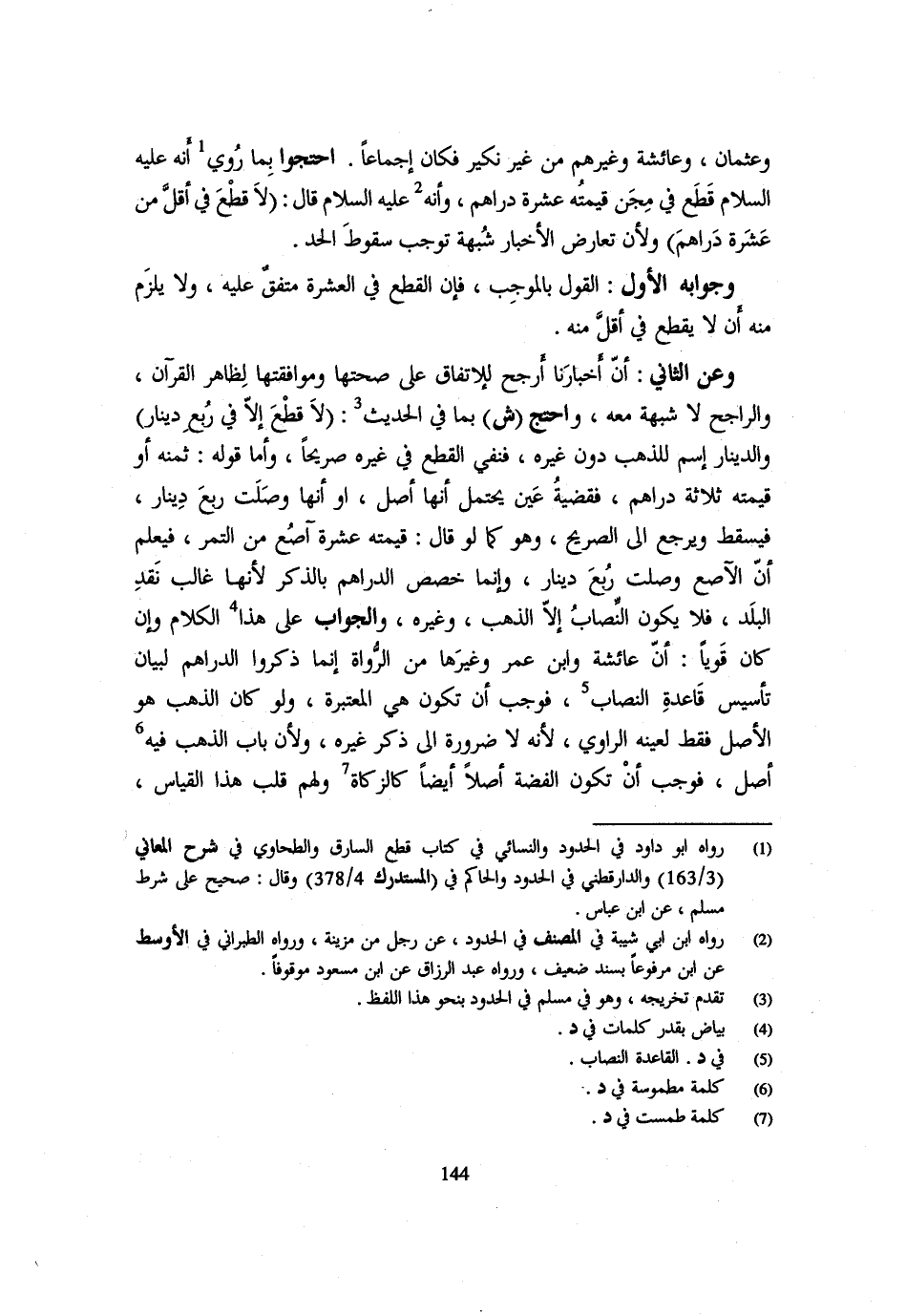 وَعُثْمَانَ وَعَائِشَةَ وَغَيْرِهِمْ مِنْ غَيْرِ نَكِيرٍ فَكَانَ إِجْمَاعًا احْتَجُّوا بِمَا رُوِيَ أَنَّهُ عَلَيْهِ السَّلَامُ قَطَعَ فِي مِجَنٍّ قِيمَتُهُ عَشَرَةُ دَرَاهِمَ وَأَنَّهُ عَلَيْهِ السَّلَامُ قَالَ (لَا قَطْعَ فِي أَقَلَّ مِنْ عَشَرَةِ دَرَاهِمَ) وَلِأَنَّ تَعَارُضَ الْأَخْبَارِ شُبْهَةٌ توجب سُقُوط الْحَد وَجَوَابه الْأَوَّلِ الْقَوْلُ بِالْمُوجِبِ فَإِنَّ الْقَطْعَ فِي الْعَشَرَةِ مُتَّفق عَلَيْهِ وَلَا يلْزم مِنْهُ أَن لَا يَقْطَعَ فِي أَقَلَّ مِنْهُ وَعَنِ الثَّانِي أَنَّ أَخْبَارَنَا أَرْجَحُ لِلِاتِّفَاقِ عَلَى صِحَّتِهَا وَمُوَافَقَتِهَا لِظَاهِرِ الْقُرْآنِ وَالرَّاجِحُ لَا شُبْهَةَ مَعَهُ وَاحْتَجَّ (ش) بِمَا فِي الْحَدِيثِ (لَا قَطْعَ إِلَّا فِي ربع دِينَار) وَالدِّينَار اسْم لِلذَّهَبِ دُونَ غَيْرِهِ فَنَفْيُ الْقَطْعِ فِي غَيْرِهِ صَرِيحًا وَأَمَّا قَوْلُهُ ثَمَنُهُ أَوْ قِيمَتُهُ ثَلَاثَةُ دَرَاهِمَ فَقَضِيَّةُ عَيْنٍ يُحْتَمَلُ أَنَّهَا أَصْلٌ أَوْ أَنَّهَا وَصَلَتْ رُبْعَ دِينَارٍ فَيَسْقُطُ وَيُرْجَعُ إِلَى الصَّرِيحِ وَهُوَ كَمَا لَوْ قَالَ قِيمَتُهُ عَشَرَةُ آصُعٍ مِنَ التَّمْرِ فَيُعْلَمُ أَنَّ الْآصُعَ وَصَلَتْ رُبْعَ دِينَارٍ وَإِنَّمَا خَصَّصَ الدَّرَاهِمَ بِالذِّكْرِ لِأَنَّهَا غَالِبُ نَقْدِ الْبَلَدِ فَلَا يَكُونُ النِّصَابُ إِلَّا الذَّهَبَ وَغَيْرَهُ وَالْجَوَابُ عَلَى هَذَا الْكَلَامِ وَإِنْ كَانَ قَوِيا أَن عَائِشَة وَابْن عمر وَغَيرهَا مِنَ الرُّوَاةِ إِنَّمَا ذَكَرُوا الدَّرَاهِمَ لِبَيَانِ تَأْسِيسِ قَاعِدَةِ النِّصَابِ فَوَجَبَ أَنْ تَكُونَ هِيَ الْمُعْتَبَرَةُ وَلَوْ كَانَ الذَّهَبُ هُوَ الْأَصْلُ فَقَطْ لَعَيَّنَهُ الرَّاوِي لِأَنَّهُ لَا ضَرُورَةَ إِلَى ذِكْرِ غَيْرِهِ وَلِأَنَّ بَابَ الذَّهَبِ فِيهِ أَصْلٌ فَوَجَبَ أَنْ تَكُونَ الْفِضَّةُ أَصْلًا أَيْضًا كَالزَّكَاةِ َولَهُمْ قَلْبُ هَذَا الْقيَاس
