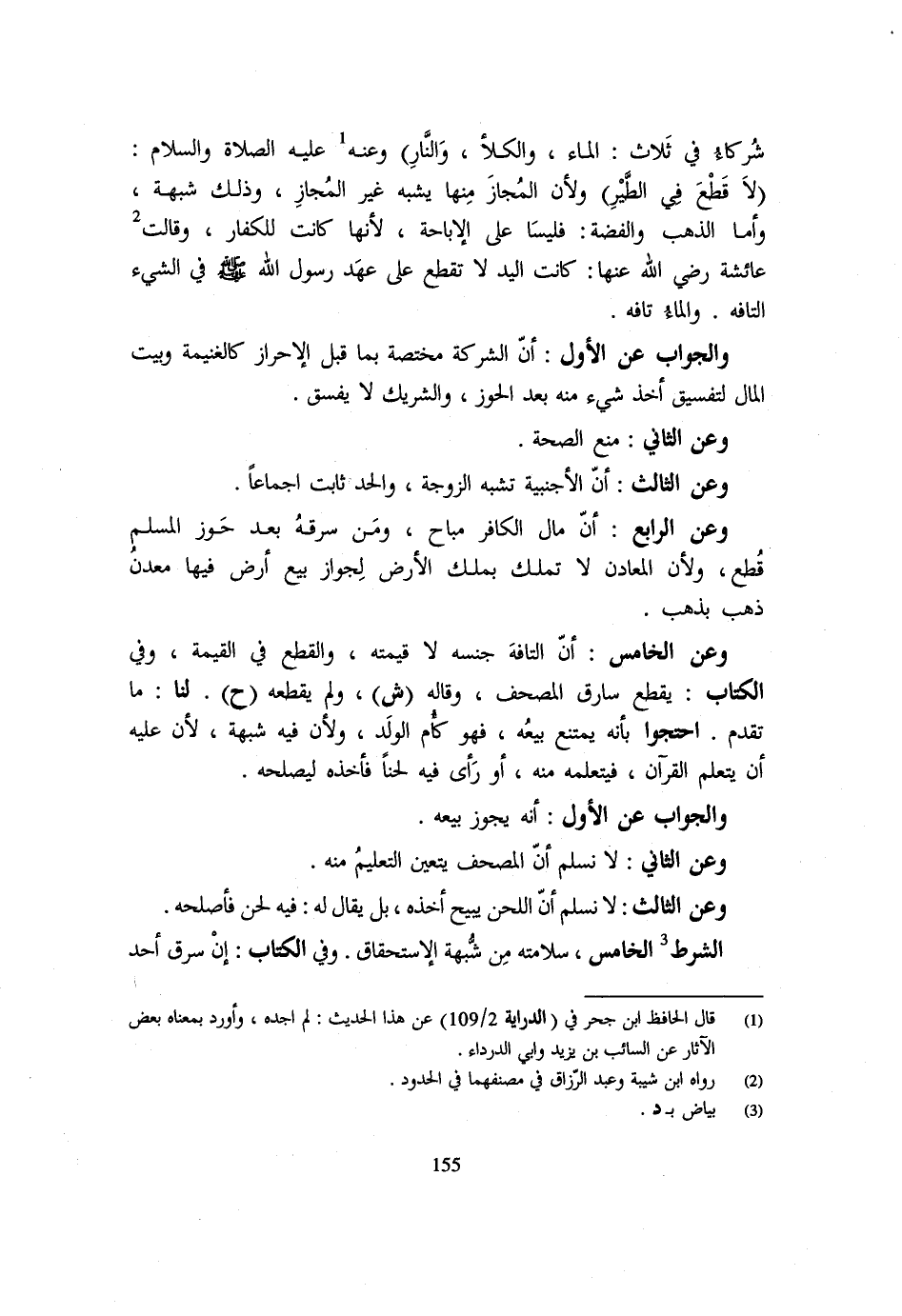 شُرَكَاءُ فِي ثَلَاثٍ الْمَاءِ وَالْكَلَأِ وَالنَّارِ) وَعَنْهُ عَلَيْهِ الصَّلَاةُ وَالسَّلَامُ (لَا قَطْعَ فِي الطَّيْرِ وَلِأَنَّ الْمَجَازَ مِنْهَا يُشْبِهُ غَيْرَ الْمَجَازِ وَذَلِكَ شُبْهَة وَأما الذَّهَب وَالْفِضَّة فليسا على الْإِبَاحَة لِأَنَّهَا كنت لِلْكُفَّارِ وَقَالَتْ عَائِشَةُ رَضِيَ اللَّهُ عَنْهَا كَانَتِ الْيَدُ لَا تُقطَعُ عَلَى عَهْدِ رَسُولِ اللَّهِ - صَلَّى اللَّهُ عَلَيْهِ وَسَلَّم َ - فِي الشَّيْءِ التَّافِهِ وَالْمَاءُ تَافِهٌ وَالْجَوَابُ عَنِ الْأَوَّلِ أَنَّ الشَّرِكَةَ مُخْتَصَّةٌ بِمَا قَبْلَ الْإِحْرَازِ كَالْغَنِيمَةِ وَبَيْتِ الْمَالِ لِتَفْسِيقِ أَخْذِ شَيْءٍ مِنْهُ بَعْدَ الْحَوْزِ وَالشَّرِيكُ لَا يُفَسَّقُ وَعَنِ الثَّانِي مَنْعُ الصِّحَّةِ وَعَنِ الثَّالِثِ أَنَّ الْأَجْنَبِيَّةَ تُشْبِهُ الزَّوْجَةَ وَالْحَدُّ ثَابِتٌ إِجْمَاعًا وَعَنِ الرَّابِعِ أَنَّ مَالَ الْكَافِرِ مُبَاحٌ وَمَنْ سَرَقَهُ بَعْدَ حَوْزِ الْمُسْلِمِ قُطِعَ وَلِأَنَّ الْمَعَادِنَ لَا تُمْلَكُ بِمِلْكِ الْأَرْضِ لِجَوَازِ بَيْعِ أَرْضٍ فِيهَا مَعْدِنُ ذَهَبٍ بِذَهَبٍ وَعَنِ الْخَامِسِ أَنَّ التَّافِهَ جِنْسُهُ لَا قِيمَتُهُ وَالْقَطْعُ فِي الْقِيمَةِ وَفِي الْكِتَابِ يُقْطَعُ سَارِقُ الْمُصْحَفِ وَقَالَهُ (ش) وَلَمْ يَقْطَعْهُ (ح) لَنَا مَا تَقَدَّمَ احْتَجُّوا بِأَنَّهُ يَمْتَنِعُ بَيْعُهُ فَهُوَ كَأُمِّ الْوَلَدِ وَلِأَنَّ فِيهِ شُبْهَةٌ لِأَنَّ عَلَيْهِ أَنْ يَتَعَلَّمَ الْقُرْآنَ فَيَتَعَلَّمُهُ مِنْهُ أَوْ رَأَى فِيهِ لَحْنًا فَأَخَذَهُ لِيُصْلِحَهُ وَالْجَوَابُ عَنِ الْأَوَّلِ أَنَّهُ يَجُوزُ بَيْعُهُ وَعَنِ الثَّانِي لَا نُسَلِّمُ أَنَّ الْمُصْحَفَ يَتَعَيَّنُ التَّعْلِيمُ مِنْهُ وَعَنِ الثَّالِثِ لَا نُسَلِّمُ أَنَّ اللَّحْنَ يُبِيحُ أَخْذَهُ بَلْ يُقَالُ لَهُ فِيهِ لَحْنٌ فَأَصْلَحَهُ الشَّرْطُ الْخَامِس سَلَامَته من شُبْهَة الِاسْتِحْقَاق وَفِي الْكِتَابِ إِنْ سَرَقَ أَحَدُ