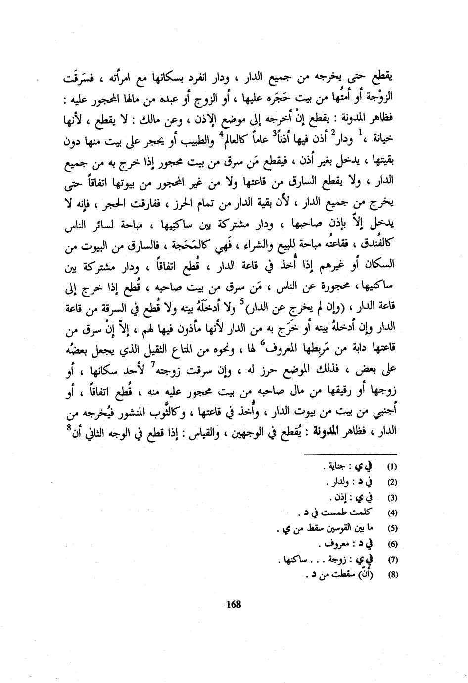 يُقْطَعُ حَتَّى يُخْرِجَهُ مِنْ جَمِيعِ الدَّارِ وَدَارٌ انْفَرد بساكنها مَعَ امْرَأَتِهِ فَسَرَقَتِ الزَّوْجَةُ أَوْ أَمَتُهَا مِنْ بَيْتٍ حَجَرَهُ عَلَيْهَا أَوِ الزَّوْجُ أَوْ عَبْدُهُ مِنْ مَالِهَا الْمَحْجُورِ عَلَيْهِ فَظَاهِرُ الْمُدَوَّنَةِ يُقْطَعُ إِنْ أَخْرَجَهُ إِلَى مَوْضِعِ الْإِذْنِ وَعَنْ مَالِكٍ لَا يُقْطَعُ لِأَنَّهَا خِيَانَةٌ وَدَارٌ أُذِنِ فِيهَا إِذْنًا عَامًا كَالْعَالِمِ وَالطَّبِيبِ أَوْ يُحْجَرُ عَلَى بَيْتٍ مِنْهَا دُونَ بَقِيَّتِهَا يَدْخُلُ بِغَيْرِ إِذْنٍ فَيُقْطَعُ مَنْ سَرَقَ مِنْ بَيْتٍ مَحْجُورٍ إِذَا خَرَجَ بِهِ مِنْ جَمِيعِ الدَّارِ وَلَا يُقْطَعُ السَّارِقُ مِنْ قَاعَتِهَا وَلَا مِنْ غَيْرِ الْمَحْجُورِ مِنْ بُيُوتِهَا اتِّفَاقًا حَتَّى يَخْرُجَ مِنْ جَمِيعِ الدَّارِ لِأَنَّ بَقِيَّةَ الدَّارِ مِنْ تَمَامِ الْحِرْزِ فَفَارَقَتِ الْحَجْرَ فَإِنَّهُ لَا يَدْخُلُ إِلَّا بِإِذْنِ صَاحِبِهَا وَدَارٌ مُشْتَرَكَةٌ بَيْنَ سَاكِنِيهَا مُبَاحَةٌ لِسَائِرِ النَّاسِ كَالْفُنْدُقِ فَقَاعَتُهُ مُبَاحَةٌ لِلْبَيْعِ وَالشِّرَاءِ فَهِيَ كَالْمَحَجَّةِ فَالسَّارِقُ مِنَ الْبُيُوتِ مِنَ السُّكَّانِ أَوْ غَيرهم إِذا أَخذ فِي عاقة الدَّارِ قُطِعَ اتِّفَاقًا وَدَارٌ مُشْتَرَكَةٌ بَيْنَ سَاكِنِيهَا مَحْجُورَةٌ عَنِ النَّاسِ مَنْ سَرَقَ مَنْ بَيْتِ صَاحِبِهِ قُطِعَ إِذَا خَرَجَ إِلَى قَاعَةِ الدَّارِ (وَإِن لم يخرج بِهِ من الدَّارِ) وَلَا أَدْخَلَهُ بَيْتَهُ وَلَا قَطْعَ فِي السّرقَة من قاعة الدَّار وَإِن أدخلته بَيْتَهُ أَوْ خَرَجَ بِهِ مِنَ الدَّارِ لِأَنَّهَا مَأْذُون فِيهَا لَهُم غلا إِنْ سَرَقَ مِنْ قَاعَتِهَا دَابَّةً مِنْ مَرْبِطِهَا الْمَعْرُوفِ لَهَا وَنَحْوِهِ مِنَ الْمَتَاعِ الثَّقِيلِ الَّذِي يُجْعَلُ بَعْضُهُ عَلَى بَعْضٍ فَذَلِكَ الْمَوْضِعُ حِرْزٌ لَهُ وَإِنْ سَرَقَتْ زَوْجَتُهُ لِأَحَدِ سُكَّانِهَا أَوْ زَوْجُهَا أَوْ رَقِيقُهَا مَنْ مَالِ صَاحِبِهِ مِنْ بَيْتٍ مَحْجُورٍ عَلَيْهِ مِنْهُ قُطِعَ اتِّفَاقًا أَوْ أَجْنَبِيٌّ مِنْ بَيْتٍ مِنْ بُيُوتِ الدَّارِ وَأُخِذَ فِي قَاعَتِهَا وَكَالثَّوْبِ الْمَنْشُورِ فَيُخْرِجُهُ مِنَ الدَّارِ فَظَاهِرُ الْمُدَوَّنَةِ يُقْطَعُ فِي الْوَجْهَيْنِ وَالْقِيَاسُ إِذَا قُطِعَ فِي الْوَجْهِ الثَّانِي أَنْ