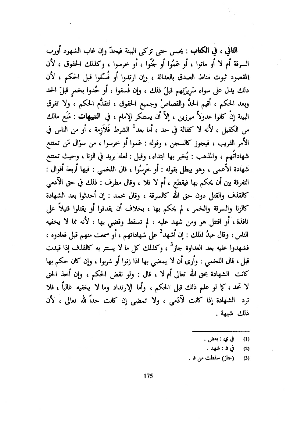الثَّانِي فِي الْكِتَابِ يُحْبَسُ حَتَّى تُزَكَّى الْبَيِّنَةُ فَيُحَدُّ وَإِنْ غَابَ الشُّهُودُ أَوْ رَبُّ السَّرِقَةِ أَمْ لَا أَوْ مَاتُوا أَوْ عَمُوا أَوْ جُنُّوا أَوْ خَرِسُوا وَكَذَلِكَ الْحُقُوقُ لِأَنَّ الْمَقْصُودَ ثُبُوتُ مَنَاطِ الصِّدْقِ بِالْعَدَالَةِ وَإِنِ ارْتَدُّوا أَوْ فَسَقُوا قَبْلَ الْحُكْمِ لِأَنَّ ذَلِكَ يَدُلُّ عَلَى سَوَاء سَرِيرَتِهِمْ قَبْلَ ذَلِكَ وَإِنْ فَسَقُوا أَوْ حُدُّوا بِخَمْرٍ قَبْلَ الْحَدِّ وَبَعْدَ الْحُكْمِ أُقِيمَ الْحَدُّ وَالْقِصَاصُ وَجَمِيعُ الْحُقُوقِ لِتَقَدُّمِ الْحُكْمِ وَلَا تُفَرِّقُ الْبَيِّنَةُ إِنْ كَانُوا عُدُولًا مُبَرِّزِينَ إِلَّا أَنْ يستنكر الإِمَام فِي التَّنْبِيهَاتِ مَنَعَ مَالِكٌ مِنَ الْكَفِيلِ لِأَنَّهُ لَا كَفَالَةَ فِي حَدٍّ أَمَّا بَعْدَ الشَّرْطِ فَلَازِمَةٌ أَوْ مِنَ النَّاسِ فِي الْأَمْرِ الْقَرِيبِ فَيجوز كالسحن وَقَوْلُهُ عَمُوا أَوْ خَرِسُوا مِنْ سُؤَالِ مَنْ تَمْتَنِعُ شَهَادَاتُهُمْ وَالْمَذْهَبُ يُخْبَرُ بِهَا ابْتِدَاءً وَقِيلَ لَعَلَّهُ يُرِيدُ فِي الزِّنَا وَحَيْثُ تَمْتَنِعُ شَهَادَةُ الْأَعْمَى وَهُوَ يَبْطُلُ بِقَوْلِهِ أَوْ خَرِسُوا قَالَ اللَّخْمِيُّ فِيهَا أَرْبَعَةُ أَقْوَالٍ التَّفْرِقَةُ بَيْنَ أَنْ يُحْكَمَ بِهَا فَيُقْطَعُ أَمْ لَا فَلَا وَقَالَ مُطَرِّفٌ ذَلِكَ فِي حَقِّ الْآدَمِيِّ كَالْقَذْفِ وَالْقَتْلِ دُونَ حَقِّ اللَّهِ كَالسَّرِقَةِ وَقَالَ مُحَمَّدٌ إِنْ أَحْدَثُوا بَعْدَ الشَّهَادَةِ كَالزِّنَا وَالسَّرِقَةِ وَالْخَمْرِ لَمْ يحكم بهَا بِخِلَاف أَن يقذفوا أَن يَقْتُلُوا قَتِيلًا عَلَى نَافِذَةٍ أَوِ اقْتَتَلَ هُوَ وَمَنْ شَهِدَ عَلَيْهِ لَمْ تَسْقُطْ وَقُضِيَ بِهَا لِأَنَّهُ مِمَّا لَا يُخْفِيهِ النَّاسُ وَقَالَ عَبْدُ الْمَلِكِ إِنْ أُشْهِدَ عَلَى شَهَادَاتِهِمْ أَوْ سَمِعْتَ مِنْهُمْ قَبْلُ فَعَادُوهُ فَشَهِدُوا عَلَيْهِ بَعْدَ الْعَدَاوَةِ جَازَ وَكَذَلِكَ كُلُّ مَا لَا يُسْتَتَرُ بِهِ كَالْقَذْفِ إِذَا قُيِّدَتْ قَبْلُ قَالَ اللَّخْمِيُّ وَأَرَى أَنْ لَا يَمْضِيَ بِهَا إِذَا زَنَوْا أَوْ شَرِبُوا وَإِنْ كَانَ حُكِمَ بِهَا كَانَتِ الشَّهَادَةُ بِحَقِّ اللَّهِ تَعَالَى أَمْ لَا قَالَ وَلَوْ نقض الحكم وَإِن أَخذ الْحق لَا تحد كَمَا لَوْ عَلِمَ ذَلِكَ قَبْلَ الْحُكْمِ وَأَمَّا الِارْتِدَادُ وَمَا لَا يُخْفِيهِ غَالِبًا فَلَا تُرَدُّ الشَّهَادَةُ إِذَا كَانَتْ لِآدَمِيٍّ وَلَا تُمْضَى إِنْ كَانَتْ حَدًّا لِلَّهِ تَعَالَى لِأَنَّ ذَلِكَ شُبْهَةٌ