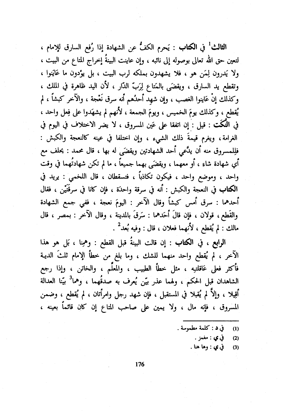 الثَّالِثُ فِي الْكِتَابِ يَحْرُمُ الْكَفُّ عَنِ الشَّهَادَةِ إِذَا رُفِعَ السَّارِقُ لِلْإِمَامِ لِتَعَيُّنِ حَقِّ اللَّهِ تَعَالَى بِوُصُولِهِ إِلَى نَائِبِهِ وَإِنْ عَايَنَتِ الْبَيِّنَةُ إِخْرَاجَ الْمَتَاعِ مِنَ الْبَيْتِ وَلَا يَدْرُونَ لِمَنْ هُوَ فَلَا يشْهدُونَ بِملكه لرب الْبَيْت بل يؤدون مَا عَايَنُوا وَتُقْطَعُ يَدُ السَّارِقِ وَيُقْضَى بِالْمَتَاعِ لِرَبِّ الدَّارِ لِأَنَّ الْيَدَ ظَاهِرَةٌ فِي الْمِلْكِ وَكَذَلِكَ إِنْ عَايَنُوا الْغَصْبَ وَإِنْ شَهِدَ أَحَدُهُمْ أَنَّهُ سَرَقَ نَعْجَةً وَالْآخَرُ كَبْشًا لَمْ يُقْطَعْ وَكَذَلِكَ يَوْم الْخَمِيس ويم الْجُمُعَةِ لِأَنَّهُمْ لَمْ يَشْهَدُوا عَلَى فِعْلٍ وَاحِدٍ فِي النُّكَتِ قِيلَ إِنِ اتَّفَقَا عَلَى عَيْنِ الْمَسْرُوقِ لَا يَضُرُّ الِاخْتِلَافُ فِي الْيَوْمِ فِي الْغَرَامَةِ وَيَغْرَمُ قِيمَةَ ذَلِكَ الشَّيْءِ وَإِنِ اخْتَلَفَا فيعينه كَالنَّعْجَةِ وَالْكَبْشِ فَلِلْمَسْرُوقِ مِنْهُ أَنْ يَدَّعِيَ أَحَدَ الشَّهَادَتَيْنِ وَيُقْضَى لَهُ بِهَا قَالَ مُحَمَّدٌ يَحْلِفُ مَعَ أَيِّ شَهَادَةٍ شَاءَ أَوْ مَعَهُمَا وَيُقْضَى بهما فَتَسْقُطَانِ قَالَ اللَّخْمِيُّ يُرِيدُ فِي الْكِتَابِ فِي النعجة والكبس أَنَّهُ فِي سَرِقَةٍ وَاحِدَةٍ فَإِنْ كَانَا فِي سَرِقَتَيْنِ فَقَالَ أَحَدُهُمَا سَرَقَ أَمْسِ كَبْشًا وَقَالَ الْآخَرُ الْيَوْمَ نَعْجَةً فَفِي جَمْعِ الشَّهَادَةِ وَالْقَطْعِ قَوْلَانِ فَإِنْ قَالَ أَحَدُهُمَا سَرَقَ بِالْمَدِينَةِ وَقَالَ الْآخَرُ بِمِصْرَ قَالَ مَالِكٌ لَمْ يُقْطَعْ لِأَنَّهُمَا فِعْلَانِ قَالَ وَفِيهِ بُعْدٌ الرَّابِعُ فِي الْكِتَابِ إِنْ قَالَتِ الْبَيِّنَةُ قَبْلَ الْقَطْعِ وَهِمْنَا بَلْ هُوَ هَذَا الْآخَرُ لَمْ يُقْطَعْ وَاحِدٌ مِنْهُمَا لِلشَّكِّ وَمَا بَلَغَ مِنْ خَطَأِ الْإِمَامِ ثُلُثَ الدِّيَةِ فَأَكْثَرَ فَعَلَى عَاقِلَتِهِ مِثْلَ خَطَأِ الطَّبِيبِ وَالْمُعَلِّمِ وَالْخَاتِنِ وَإِذَا رَجَعَ الشَّاهِدَانِ قَبْلَ الْحُكْمِ وَلَهُمَا عُذْرٌ بَيِّنٌ يُعْرَفُ بِهِ صِدْقُهُمَا وَهُمَا بَيِّنَا الْعَدَالَةِ أُقِيلَا وَإِلَّا لَمْ يُقْبَلَا فِي الْمُسْتَقْبَلِ فَإِنْ شَهِدَ رَجُلٌ وَامْرَأَتَانِ لَمْ يُقْطَعْ وَضُمِنَ الْمَسْرُوقُ فَإِنَّهُ مَالٌ وَلَا يَمِينَ عَلَى صَاحِبِ الْمَتَاعِ إِنْ كَانَ قَائِمًا بِعَيْنِهِ