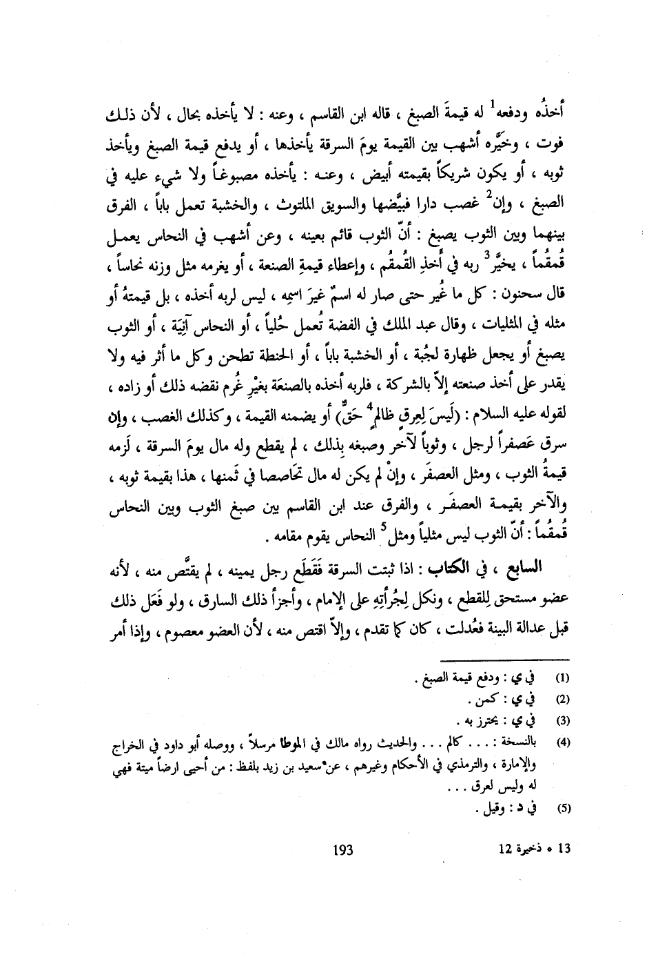 أَخْذُهُ وَدَفْعُهُ لَهُ قِيمَةَ الصَّبْغِ قَالَهُ ابْنُ الْقَاسِمِ وَعَنْهُ لَا يَأْخُذُهُ بِحَالٍ لِأَنَّ ذَلِكَ فَوْتٌ وَخَيَّرَهُ أَشْهَبُ بَيْنَ الْقِيمَةِ يَوْمَ السَّرِقَةِ يَأْخُذُهَا أَوْ يَدْفَعُ قِيمَةَ الصَّبْغِ وَيَأْخُذُ ثَوْبَهُ أَوْ يَكُونُ شَرِيكًا بِقِيمَتِهِ أَبْيَضَ وَعَنْهُ يَأْخُذُهُ أَوْ يَدْفَعُ قِيمَةَ الصَّبْغِ وَيَأْخُذُ ثَوْبَهُ أَوْ يَكُونُ شَرِيكًا بِقِيمَتِهِ أَبْيَضَ وَعَنْهُ يَأْخُذُهُ مَصْبُوغًا وَلَا شَيْءَ عَلَيْهِ فِي الصَّبْغِ وَإِنْ غَصَبَ دَارا فبيضها والسويق الملتوث وَالْخَشَبَةُ تُعْمَلُ بَابًا الْفَرْقُ بَيْنَهُمَا وَبَيْنَ الثَّوْبِ يُصْبَغُ أَنَّ الثَّوْبَ قَائِمٌ بِعَيْنِهِ وَعَن أَشْهَبَ فِي النُّحَاسِ يُعْمَلُ قُمْقُمًا يُخَيِّرُ رَبَّهُ فِي أَخْذِ الْقُمْقُمِ وَإِعْطَاءِ قِيمَةِ الصَّنْعَةِ أَوْ يُغَرِّمُهُ مِثْلَ وَزْنِهِ نُحَاسًا قَالَ سَحْنُونٌ كُلُّ مَا غير حَتَّى صال لَهُ اسْمٌ غَيْرَ اسْمِهِ لَيْسَ لِرَبِّهِ أَخْذُهُ بَلْ قِيمَتُهُ أَوْ مِثْلُهُ فِي الْمِثْلِيَّاتِ وَقَالَ عَبْدُ الْمَلِكِ فِي الْفِضَّةِ تُعْمَلُ حُلِيًّا أَوِ النُّحَاسِ آنِيَةً أَوِ الثَّوْبِ يُصْبَغُ أَوْ يُجْعَلُ ظِهَارَةً لِجُبَّةٍ أَوِ الْخَشَبَةِ بَابًا أَوِ الْحِنْطَةِ تُطْحَنُ وَكُلُّ مَا أَثَّرَ فِيهِ وَلَا يَقْدِرُ عَلَى أَخْذِ صَنْعَتِهِ إِلَّا بِالشَّرِكَةِ فَلِرَبِّهِ أَخْذُهُ بالصنعة بِغَيْر غرم نقضه ذَلِكَ أَوْ زَادَهُ لِقَوْلِهِ عَلَيْهِ السَّلَامُ (لَيْسَ لِعِرْقٍ ظَالِمٍ حَقٌّ) أَوْ يُضَمِّنُهُ الْقِيمَةَ وَكَذَلِكَ الْغَصْبُ وَإِنْ سَرَقَ عُصْفُرًا لِرَجُلٍ وَثَوْبًا لِآخَرَ وصبغه بذلك لم يقطع وَلَهُ مَالٌ يَوْمَ السَّرِقَةِ لَزِمَهُ قِيمَةُ الثَّوْبِ وَمِثْلُ الْعُصْفُرِ وَإِنْ لَمْ يَكُنْ لَهُ مَالٌ تحاصصا فِي ثمنهَا هَذَا بِقِيمَةِ ثَوْبِهِ وَالْآخَرُ بِقِيمَةِ الْعُصْفُرِ وَالْفَرْقُ عِنْدَ ابْنِ الْقَاسِمِ بَيْنَ صَبْغِ الثَّوْبِ وَبَيْنَ النُّحَاسِ قُمْقُمًا أَنَّ الثَّوْبَ لَيْسَ مِثْلِيًّا وَمِثْلُ النّحاس يقوم مقَامه السَّابِعُ فِي الْكِتَابِ إِذَا ثَبَتَتِ السَّرِقَةُ فَقَطَعَ رَجُلٌ يَمِينَهُ لَمْ يُقْتَصَّ مِنْهُ لِأَنَّهُ عُضْوٌ مُسْتَحِقٌّ لِلْقَطْعِ وَنُكِّلَ لِجُرْأَتِهِ عَلَى الْإِمَامِ وَأَجْزَأَ ذَلِكَ السَّارِقَ وَلَوْ فَعَلَ ذَلِكَ قَبْلَ عَدَالَةِ الْبَيِّنَةِ فَعُدِّلَتْ كَانَ كَمَا تَقَدَّمَ وَإِلَّا اقْتُصَّ مِنْهُ لِأَنَّ الْعُضْوَ مَعْصُومٌ وَإِذَا أَمَرَ
