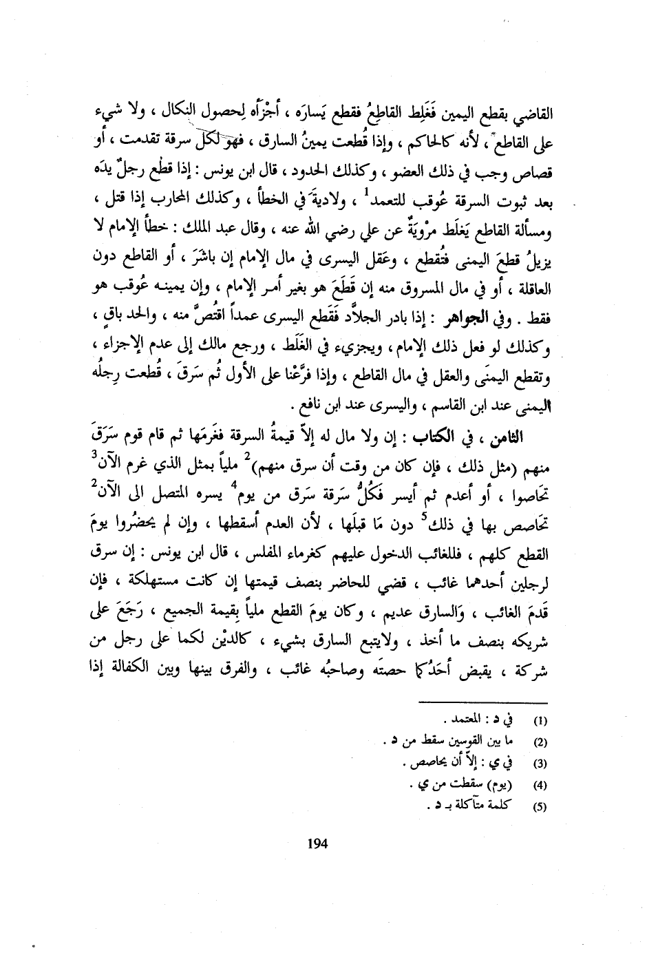 القَاضِي بِقطع الْيَمين فغلظ الْقَاطِعُ فَقَطَعَ يَسَارَهُ أَجَزَأَهُ لِحُصُولِ النَّكَالِ وَلَا شَيْءَ عَلَى الْقَاطِعِ لِأَنَّهُ كَالْحَاكِمِ وَإِذَا قُطِعَتْ يَمِينُ السَّارِقِ فَهُوَ لِكُلِّ سَرِقَةٍ تَقَدَّمَتْ أَوْ قِصَاصٍ وَجَبَ فِي ذَلِكَ الْعُضْوِ وَكَذَلِكَ الْحُدُودُ قَالَ ابْن يُونُس إِذا قطّ رجل يَده بعد ثُبُوت السّرقَة عُوقِبَ للتعمد وَلَا دِيَةَ فِي الْخَطَأِ وَكَذَلِكَ الْمُحَارِبُ إِذَا قُتِلَ وَمَسْأَلَةُ الْقَاطِعِ يَغْلَطُ مَرْوِيَّةٌ عَنْ عَلِيٍّ رَضِيَ اللَّهُ عَنْهُ وَقَالَ عَبْدُ الْمَلِكِ خَطَأُ الْإِمَامِ لَا يُزِيلُ قَطْعَ الْيُمْنَى فَتُقْطَعُ وَعَقْلُ الْيُسْرَى فِي مَالِ الْإِمَامِ إِنْ بَاشَرَ أَوِ الْقَاطِعِ دُونَ الْعَاقِلَةِ أَوْ فِي مَالِ الْمَسْرُوقِ مِنْهُ إِنْ قَطَعَ هُوَ بِغَيْرِ أَمْرِ الْإِمَامِ إِنْ بَاشَرَ أَوِ الْقَاطِعِ دُونَ الْعَاقِلَةِ أَوْ فِي مَالِ الْمَسْرُوقِ مِنْهُ إِنْ قَطَعَ هُوَ بِغَيْر أَمر الإِمَام وَإِن يمنه عُوقِبَ هُوَ فَقَطْ وَفِي الْجَوَاهِرِ إِذَا بَادَرَ الْجَلَّادُ فَقَطَعَ الْيُسْرَى عَمْدًا اقْتُصَّ مِنْهُ وَالْحَدُّ بَاقٍ وَكَذَلِكَ لَو فعل ذَلِك الإِمَام ويجزيء فِي الْغَلَطِ وَرَجَعَ مَالِكٌ إِلَى عَدَمِ الْإِجْزَاءِ وَتُقْطَعُ الْيُمْنَى وَالْعَقْلُ فِي مَالِ الْقَاطِعِ وَإِذَا فَرَّعْنَا عَلَى الْأَوَّلِ ثُمَّ سَرَقَ قُطِعَتْ رِجْلُهُ الْيُمْنَى وَالْعَقْلُ فِي مَالِ الْقَاطِعِ وَإِذَا فَرَّعْنَا عَلَى الْأَوَّلِ ثُمَّ سَرَقَ قُطِعَتْ رِجْلُهُ الْيُمْنَى عِنْدَ ابْنِ الْقَاسِمِ وَالْيُسْرَى عِنْدَ ابْنِ نَافِعٍ الثَّامِن فِي الْكتاب إِن وَلَا مَالَ لَهُ إِلَّا قِيمَةُ السَّرِقَةِ فَغَرِمَهَا ثُمَّ قَامَ قَوْمٌ سَرَقَ مِنْهُمْ (مِثْلَ ذَلِكَ فَإِنْ كَانَ مِنْ وَقْتِ أَنْ سَرَقَ مِنْهُمْ) مَلِيًّا بِمثل الَّذِي غرم الْآن بحاصص بِهَا فِي ذَلِكَ دُونَ مَا قَبْلَهَا لِأَنَّ الْعُدْمَ أَسْقَطَهَا وَإِنْ لَمْ يَحْضُرُوا يَوْمَ الْقَطْعِ كُلُّهُمْ فَلِلْغَائِبِ الدُّخُولُ عَلَيْهِمْ كَغُرَمَاءِ الْمُفْلِسِ قَالَ ابْنُ يُونُسَ إِنْ سَرَقَ لِرَجُلَيْنِ أَحَدُهُمَا غَائِبٌ قُضِيَ لِلْحَاضِرِ بِنِصْفِ قِيمَتِهَا إِنْ كَانَتْ مُسْتَهْلَكَةً فَإِنْ قَدَمَ الْغَائِبُ وَالسَّارِقُ عَدِيمٌ وَكَانَ يَوْمُ الْقَطْعِ مَلِيًّا بِقِيمَةِ الْجَمِيعِ رَجَعَ عَلَى شَرِيكِهِ بِنِصْفِ مَا أَخَذَ وَلَا يُتْبَعُ السَّارِقُ بِشَيْءٍ كَالدَّيْنِ لَكُمَا عَلَى رَجُلٍ مِنْ شَرِكَةٍ يَقْبِضُ أَحَدُكُمَا حِصَّتَهُ وَصَاحِبُهُ غَائِبٌ وَالْفَرْقُ بَيْنَهَا وَبَيْنَ الْكفَالَة إِذا