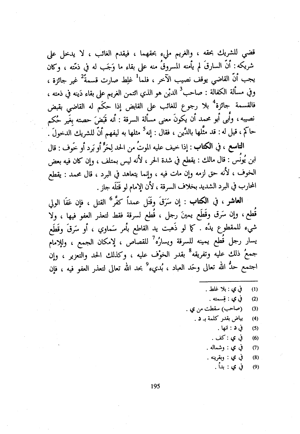 قُضِيَ لِلشَّرِيكِ بِحَقِّهِ وَالْغَرِيمُ مَلِيءٌ بِحَقِّهِمَا فَيُقَدَّمُ الْغَائِبُ لَا يُدْخِلُ عَلَى شَرِيكِهِ أَنَّ السَّارِقَ لَمْ يَأْمَنْهُ الْمَسْرُوقُ مِنْهُ عَلَى بَقَاءِ مَا وَجَبَ لَهُ فِي ذِمَّتِهِ وَكَانَ يَجِبُ أَنَّ الْقَاضِيَ يُوقِفُ نَصِيبَ الْآخَرِ فَلَمَّا غَلِطَ صَارَتْ قِسْمَةً غَيْرَ جَائِزَةٍ وَفِي مَسْأَلَةِ الْكَفَالَةِ صَاحِبُ الدَّيْنِ هُوَ الَّذِي ائْتَمَنَ الْغَرِيمَ عَلَى بَقَاءِ دَيْنِهِ فِي ذِمَّتِهِ فَالْقِسْمَةُ جَائِزَةٌ بِلَا رُجُوعٍ لِلْغَائِبِ عَلَى الْقَابِضِ إِذَا حَكَمَ لَهُ الْقَاضِي بِقَبْضِ نَصِيبِهِ وَأَبَى أَبُو مُحَمَّدٍ أَنْ يَكُونَ مَعْنَى مَسْأَلَةِ السَّرِقَةِ أَنَّهُ قَبَضَ حِصَّتَهُ بِغَيْرِ حُكْمِ حَاكِمٍ قِيلَ لَهُ قَدْ مَثَّلَهَا بِالدَّيْنِ فَقَالَ إِنَّهُ مَثَّلَهَا بِهِ لِيَفْهَمَ أَنَّ لِلشَّرِيكِ الدُّخُول التَّاسِعُ فِي الْكِتَابِ إِذَا خِيفَ عَلَيْهِ الْمَوْتُ مِنَ الْحَدِّ لِحَرٍّ أَوْ بَرْدٍ أَوْ خَوْفٍ قَالَ ابْنُ يُونُسَ قَالَ مَالِكٌ يُقْطَعُ فِي شِدَّةِ الْحَرِّ لِأَنَّهُ لَيْسَ بِمُتْلَفٍ وَإِنْ كَانَ فِيهِ بَعْضُ الْخَوْفِ لِأَنَّهُ حَقٌّ لَزِمَهُ وَإِنْ مَاتَ فِيهَا وَإِنَّمَا يَتَعَاهَدُ فِي الْبَرْدِ قَالَ مُحَمَّدٌ يُقْطَعُ الْمُحَارِبُ فِي الْبَرْدِ الشَّدِيدِ بِخِلَافِ السَّرِقَةِ لِأَنَّ الإِمَام لَو قَتله جَازَ الْعَاشِرُ فِي الْكِتَابِ إِنْ سَرَقَ وَقَتَلَ عَمْدًا كفر الْقَتْلَ فَإِنْ عَفَا الْوَلِيُّ قُطِعَ وَإِنْ سَرَقَ وَقطع يَمِين رجل قطع لسرقة فَقَطْ لِتَعَذُّرِ الْعَفْوِ فِيهَا وَلَا شَيْءَ لِلْمَقْطُوعِ يَدُهُ كَمَا لَوْ ذَهَبَتْ يَدُ الْقَاطِعِ بِأَمْرٍ سَمَاوِيٍّ أَوْ سَرَقَ وَقَطَعَ يَسَارَ رَجُلٍ قُطِعَ يَمِينُهُ لِلسَّرِقَةِ وَيَسَارُهُ لِلْقِصَاصِ لِإِمْكَانِ الْجَمْعِ وَلِلْإِمَامِ جمع ذَلِك عَلَيْهِ وتفريغه بِقَدْرِ الْخَوْفِ عَلَيْهِ وَكَذَلِكَ الْحَدُّ وَالتَّعْزِيرُ وَإِنِ اجْتمع حد الله تَعَالَى وحد الْعباد بديء بِحَدِّ اللَّهِ تَعَالَى لِتَعَذُّرِ الْعَفْوِ فِيهِ فَإِنْ