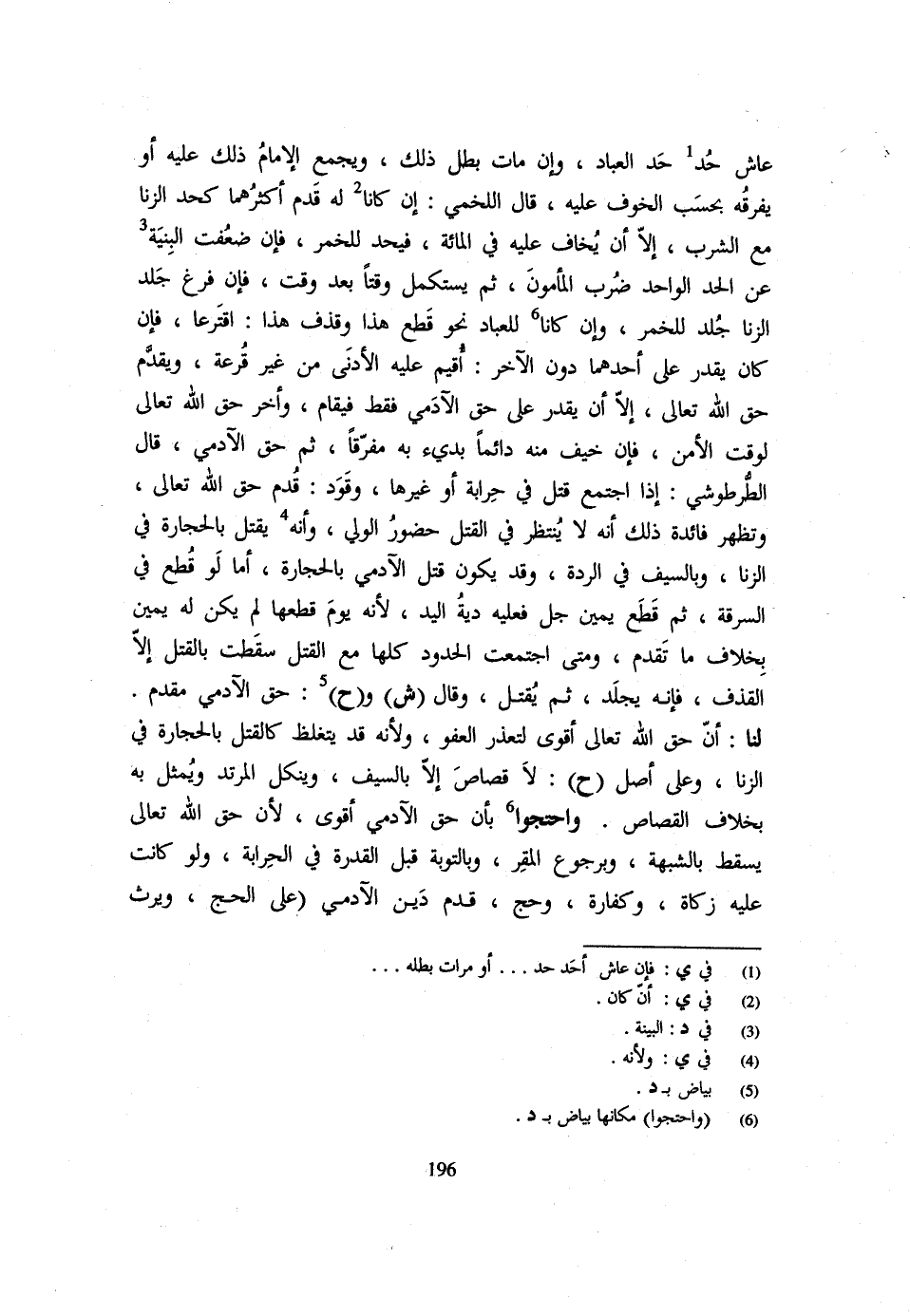 عَاشَ حُدَّ حَدَّ الْعِبَادِ وَإِنْ مَاتَ بَطَلَ ذَلِكَ وَيَجْمَعُ الْإِمَامُ ذَلِكَ عَلَيْهِ أَوْ يُفَرِّقُهُ بِحَسَبِ الْخَوْفِ عَلَيْهِ قَالَ اللَّخْمِيُّ إِنْ كَانَا لق قُدِّمَ أَكْثَرُهُمَا كَحَدِّ الزِّنَا مَعَ الشُّرْبِ إِلَّا أَنْ يُخَافَ عَلَيْهِ فِي الْمِائَةِ فَيُحَدُّ لِلْخَمْرِ فَإِنْ ضَعُفَتِ الْبِنْيَةُ عَنِ الْحَدِّ الْوَاحِدِ ضُرِبَ الْمَأْمُونَ ثُمَّ يَسْتَكْمِلُ وَقْتًا بَعْدَ وَقْتٍ فَإِنْ فَرَغَ جَلْدُ الزِّنَا جُلِدَ لِلْخَمْرِ وَإِنْ كَانَا لِلْعِبَادِ نَحْوِ قَطْعِ هَذَا وَقَذْفِ هَذَا اقْتَرَعَا فَإِنْ كَانَ يَقْدِرُ عَلَى أَحَدِهِمَا دُونَ الْآخَرِ أُقِيمَ عَلَيْهِ الْأَدْنَى مِنْ غَيْرِ قُرْعَةٍ وَيُقَدَّمُ حَقُّ اللَّهِ تَعَالَى إِلَّا أَنْ يَقْدِرَ عَلَى حَقِّ الْآدَمِيِّ فَقَطْ فَيُقَامُ وَأُخِّرَ حَقُّ اللَّهِ تَعَالَى لِوَقْتِ الْأَمْنِ فَإِنْ خِيفَ مِنْهُ دَائِمًا بديء بِهِ مُفَرَّقًا ثُمَّ حَقُّ الْآدَمِيِّ قَالَ الطَّرْطُوشِيُّ إِذَا اجْتَمَعَ قَتْلٌ فِي حِرَابَةٍ أَوْ غَيْرِهَا وَقَوَدٌ قُدِّمَ حَقُّ اللَّهِ تَعَالَى وَتَظْهَرُ فَائِدَةُ ذَلِكَ أَنَّهُ لَا يُنْتَظَرُ فِي الْقَتْلِ حُضُورُ الْوَلِيّ وَأَنه يقبل بِالْحِجَارَةِ فِي الزِّنَا وَبِالسَّيْفِ فِي الرِّدَّةِ وَقَدْ يَكُونُ قَتْلُ الْآدَمِيِّ بِالْحِجَارَةِ أَمَّا لَوْ قُطِعَ فِي السّرقَة ثمَّ قطع يَمِين جلّ فَعَلَيْهِ دِيَةُ الْيَدِ لِأَنَّهُ يَوْمَ قَطَعَهَا لَمْ يَكُنْ لَهُ يَمِينٌ بِخِلَافِ مَا تَقَدَّمَ وَمَتَى اجْتَمَعَتِ الْحُدُودُ كُلُّهَا مَعَ الْقَتْلِ سَقَطَتْ بِالْقَتْلِ إِلَّا الْقَذْفَ فَإِنَّهُ يُجْلَدُ ثُمَّ يُقْتَلُ وَقَالَ (ش) وَ (ح) حُقٌّ الْآدَمِيِّ مُقَدَّمٌ لَنَا أَنَّ حَقَّ اللَّهِ تَعَالَى أَقْوَى لِتَعَذُّرِ الْعَفْوِ وَلِأَنَّهُ قَدْ يَتَغَلَّظُ كَالْقَتْلِ بِالْحِجَارَةِ فِي الزِّنَا وَعَلَى أَصْلِ (ح) لَا قِصَاصَ إِلَّا بِالسَّيْفِ وَيُنَكَّلُ الْمُرْتَدُّ وَيُمَثَّلُ بِهِ بِخِلَافِ الْقِصَاصَ وَاحْتَجُّوا بِأَنَّ حَقَّ الْآدَمِيِّ أَقْوَى لِأَنَّ حَقَّ اللَّهِ تَعَالَى يَسْقُطُ بِالشُّبْهَةِ وَبِرُجُوعِ الْمُقِرِّ وَبِالتَّوْبَةِ قَبْلَ الْقُدْرَةِ فِي الْحِرَابَةِ وَلَوْ كَانَتْ عَلَيْهِ زَكَاةٌ وَكَفَّارَةٌ وَحَجٌّ قُدِّمَ دَيْنُ الْآدَمِيِّ (عَلَى الْحَجِّ وَيَرِث