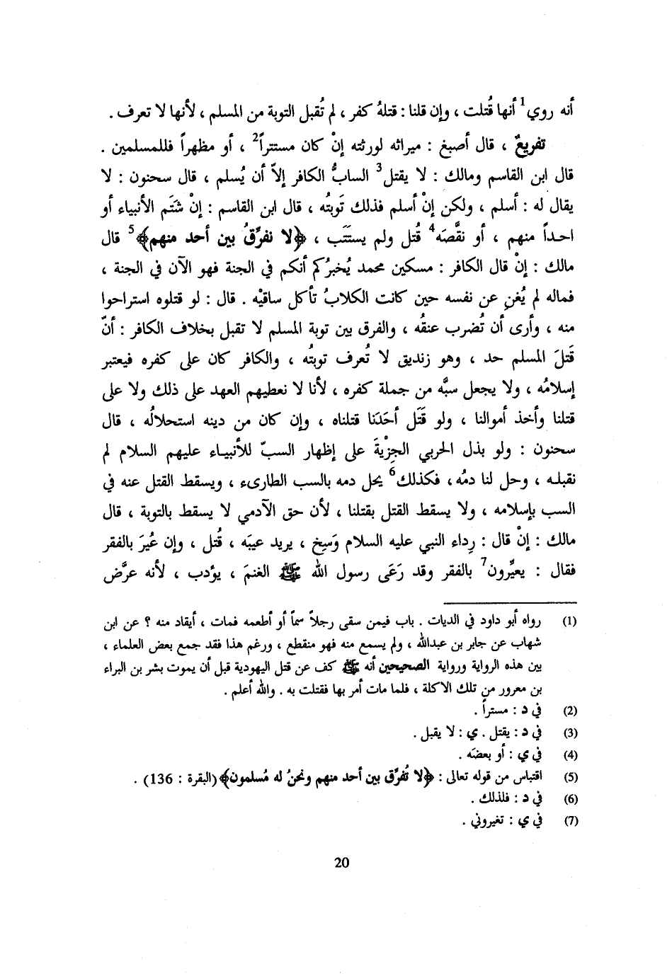 أَنَّهُ رُوِيَ أَنَّهَا قُتِلَتْ وَإِنْ قُلْنَا قَتْلُهُ كُفْرٌ لَمْ تُقْبَلِ التَّوْبَةُ مِنَ الْمُسْلِمِ لِأَنَّهَا لَا تُعْرَفُ تَفْرِيعٌ، قَالَ أَصْبَغُ مِيرَاثُهُ لِوَرَثَتِهِ إِنْ كَانَ مُسْتَتِرًا أَوْ مُظْهِرًا فَلِلْمُسْلِمِينَ قَالَ ابْن الْقَاسِم وَمَالك لَا يُقْتَلُ السَّابُّ الْكَافِرُ إِلَّا أَنْ يُسْلِمَ قَالَ سَحْنُونٌ لَا يُقَالُ لَهُ أَسْلِمْ وَلَكِنْ إِنْ أَسْلَمَ فَذَلِكَ تَوْبَتُهُ قَالَ ابْنُ الْقَاسِمِ إِنَّ شَتَمَ الْأَنْبِيَاءَ أَوْ أَحَدًا مِنْهُمْ أَوْ نَقَصَهُ قُتِلَ وَلَمْ يُسْتَتَبْ {لَا نُفَرِّقُ بَيْنَ أَحَدٍ مِنْهُم} قَالَ مَالِكٌ إِنْ قَالَ الْكَافِرُ مِسْكِينٌ مُحَمَّدٌ يُخْبِرُكُمْ أَنَّكُمْ فِي الْجَنَّةِ فَهُوَ الْآنَ فِي الْجنَّة فَمَاله لَمْ يُغْنِ عَنْ نَفْسِهِ حِينَ كَانَتِ الْكِلَابُ تَأْكُلُ سَاقَيْهِ قَالَ لَوْ قَتَلُوهُ اسْتَرَاحُوا مِنْهُ وَأَرَى أَنْ تُضْرَبَ عُنُقُهُ وَالْفَرْقُ بَيْنَ تَوْبَةِ الْمُسْلِمِ لَا تُقْبَلُ بِخِلَافِ الْكَافِرِ أَنَّ قَتْلَ الْمُسْلِمِ حَدٌّ وَهُوَ زِنْدِيقٌ لَا تُعْرَفُ تَوْبَتُهُ وَالْكَافِرُ كَانَ عَلَى كُفْرِهِ فَيُعْتَبَرُ إِسْلَامُهُ وَلَا يُجْعَلُ سَبُّهُ مِنْ جُمْلَةِ كُفْرِهِ لِأَنَّا لَا نُعْطِيهِمُ الْعَهْدَ عَلَى ذَلِكَ وَلَا عَلَى قَتْلِنَا وَأَخْذِ أَمْوَالِنَا وَلَوْ قَتَلَ أَحَدُنَا قَتَلْنَاهُ وَإِنْ كَانَ مِنْ دِينِهِ اسْتِحْلَالُهُ قَالَ سَحْنُونٌ وَلَوْ بذل الْحَرْبِيّ الْجِزْيَة على إطهار السَّبِّ لِلْأَنْبِيَاءِ عَلَيْهِمْ السَّلَامُ لَمْ نَقْبَلْهُ وَحَلَّ لنا دَمه فَكَذَلِك يُحَلُّ دَمُهُ بِالسَّبِّ الطَّارِئِ وَيَسْقُطُ الْقَتْلُ عَنْهُ فِي السب بِإِسْلَامِهِ وَلَا يسْقط الْقَتْل بِقَتْلِنَا لِأَنَّ حَقَّ الْآدَمِيِّ لَا يَسْقُطُ بِالتَّوْبَةِ قَالَ مَالِكٌ إِنْ قَالَ رِدَاءُ النَّبِيِّ عَلَيْهِ السَّلَامُ وَسِخٌ يُرِيدُ عَيْبَهُ قُتِلَ وَإِنْ عُيِّرَ بِالْفَقْرِ فَقَالَ يُعَيِّرُونَ بِالْفَقْرِ وَقَدْ رَعَى رَسُولُ الله - صَلَّى اللَّهُ عَلَيْهِ وَسَلَّم َ - الْغَنَمَ يُؤَدَّبُ لِأَنَّهُ عَرَّضَ