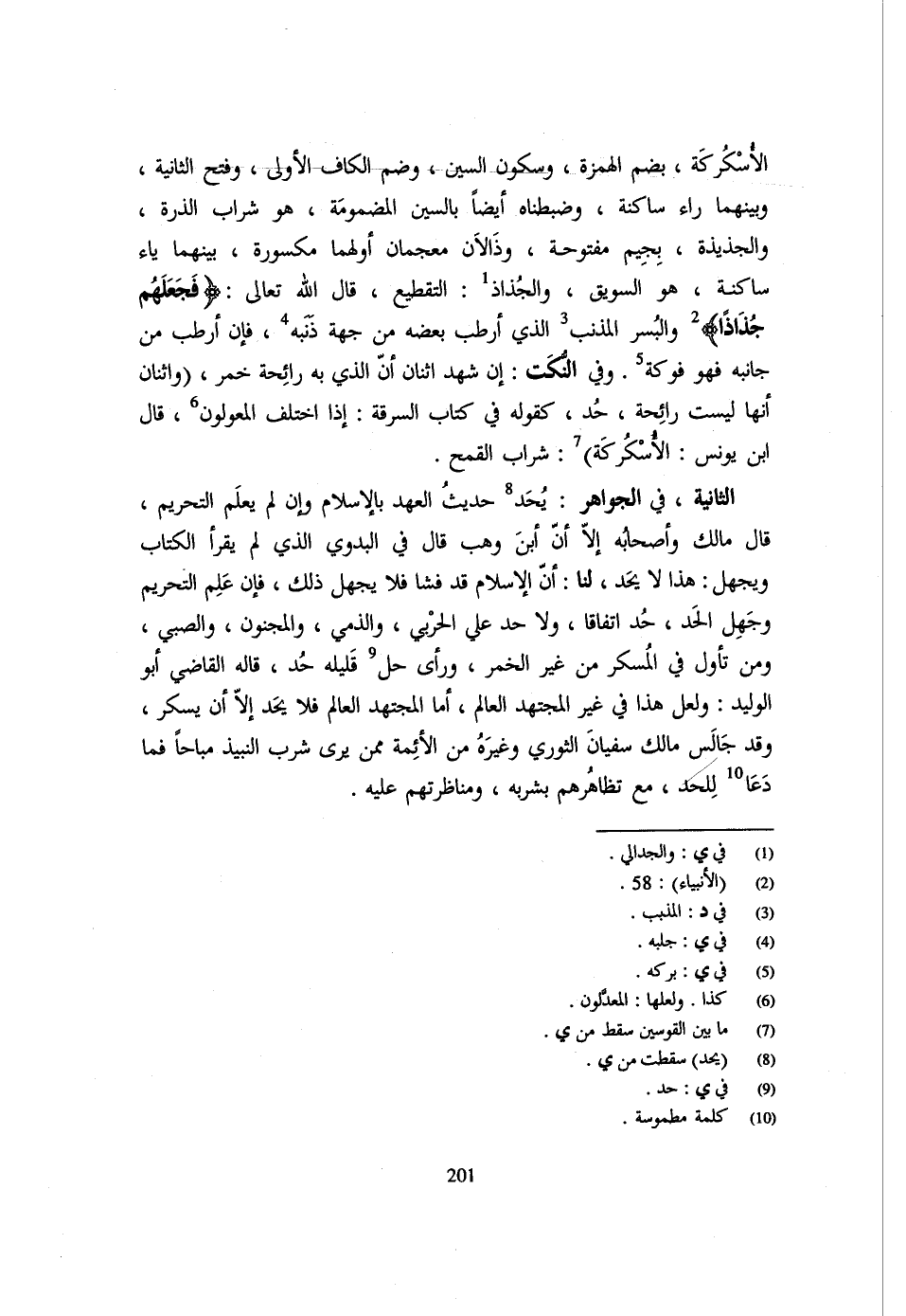 الْأُسْكُرْكَةُ بِضَمِّ الْهَمْزَةِ وَسُكُونِ السِّينِ وَضَمِّ الْكَافِ الْأُولَى وَفَتْحِ الثَّانِيَةِ وَبَيْنَهُمَا رَاءٌ سَاكِنَةٌ وَضَبَطْنَاهُ أَيْضًا بِالسِّينِ الْمَضْمُومَةِ هُوَ شَرَابُ الذُّرَةِ وَالْجَذِيذَةُ بجيم مَفْتُوحَة وذالان معجمات أَوَّلُهُمَا مَكْسُورَةٌ بَيْنَهُمَا يَاءٌ سَاكِنَةٌ هُوَ السَّوِيقُ وَالْجُذَاذُ التَّقْطِيعُ قَالَ اللَّهُ تَعَالَى {فَجَعَلَهُمْ جُذَاذًا} وَالْبُسْرُ الْمُذَنَّبُ الَّذِي أَرْطَبَ بَعْضُهُ مِنْ جِهَةِ ذَنَبِهِ فَإِنْ أَرَطَبَ مِنْ جَانِبِهِ فَهُوَ فَوْكَةٌ وَفِي النُّكَتِ إِنْ شَهِدَ اثْنَانِ أَنَّ الَّذِي بِهِ رَائِحَةُ خَمْرٍ (وَاثْنَانِ أَنَّهَا لَيْسَتْ رَائِحَةً حُدَّ كَقَوْلِهِ فِي كِتَابِ السَّرِقَةِ إِذَا اخْتَلَفَ المعولون قَالَ ابْن يُونُس الأسركة) شَرَابُ الْقَمْحِ الثَّانِيَةُ فِي الْجَوَاهِرِ يُحَدُّ حَدِيثُ الْعَهْد بِالْإِسْلَامِ وَإِن لم يعلم التَّحْرِيم قَالَ مَالك وأخصابه إِلَّا أَنَّ ابْنَ وَهْبٍ قَالَ فِي الْبَدَوِيِّ الَّذِي لَمْ يَقْرَأِ الْكِتَابَ وَيَجْهَلُ هَذَا لَا يحد لنا أَن الْإِسْلَام قد قشا فَلَا يُجْهَلُ ذَلِكَ فَإِنْ عَلِمَ التَّحْرِيمَ وَجَهِلَ الْحَدَّ حُدَّ اتِّفَاقًا وَلَا حَدَّ عَلَى الْحَرْبِيِّ وَالذِّمِّيِّ وَالْمَجْنُونِ وَالصَّبِيِّ وَمَنْ تَأَوَّلَ فِي الْمُسْكِرِ مِنْ غَيْرِ الْخَمْرِ وَرَأَى حِلَّ قَلِيلِهِ حُدَّ قَالَهُ الْقَاضِي أَبُو الْوَلِيدِ وَلَعَلَّ هَذَا فِي غَيْرِ الْمُجْتَهِدِ الْعَالِمِ أَمَّا الْمُجْتَهِدُ الْعَالِمُ فَلَا يُحَدُّ إِلَّا أَنْ يَسْكَرَ وَقَدْ جَالَسَ مَالِكٌ سُفْيَانَ الثَّوْرِيَّ وَغَيْرَهُ مِنَ الْأَئِمَّةِ مِمَّنْ يَرَى شرب مُبَاحًا فَمَا دَعَا لِلْحَدِّ مَعَ تَظَاهُرِهِمْ بِشُرْبِهِ ومناظرتهم عَلَيْهِ