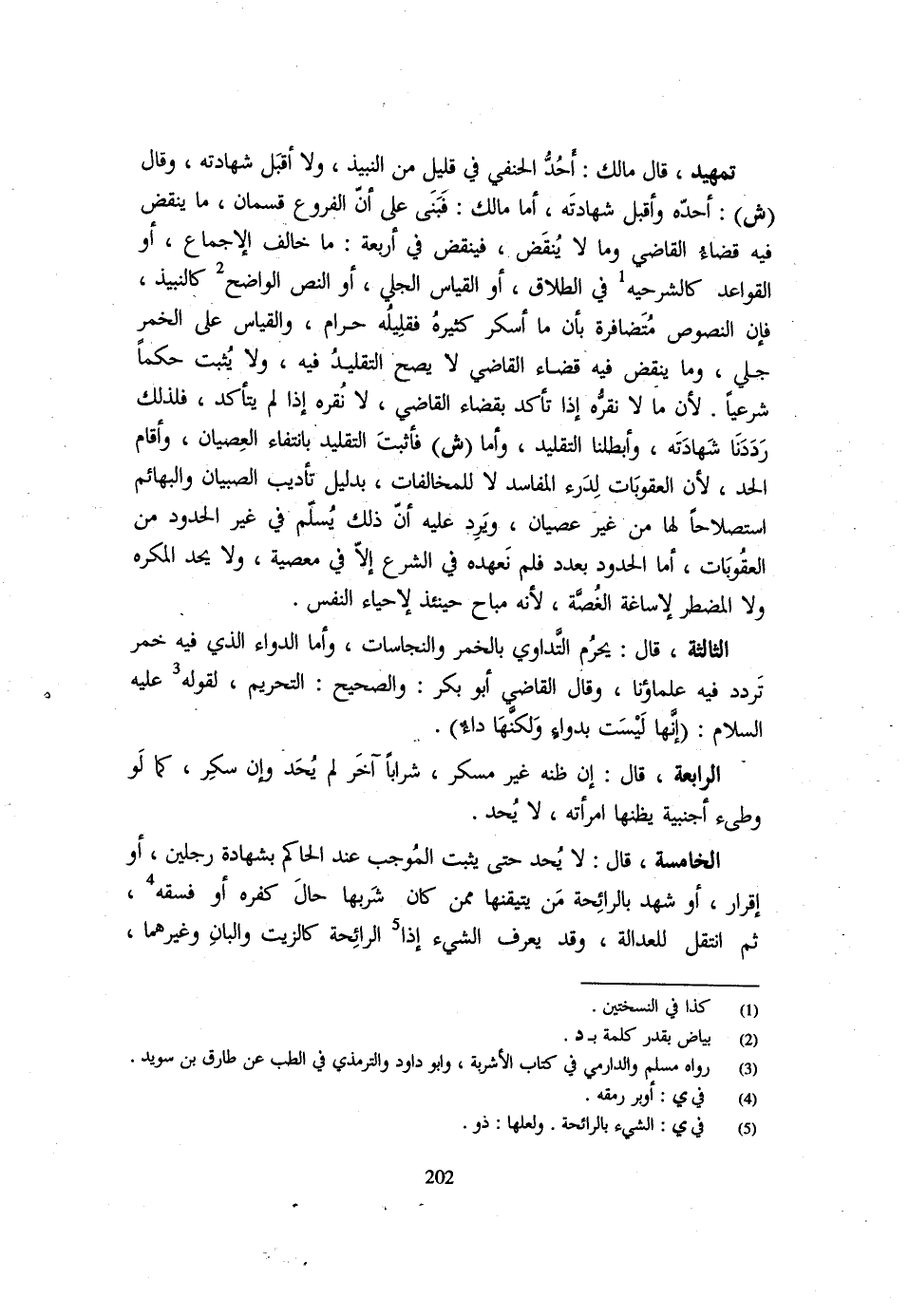 تَمْهِيدٌ قَالَ مَالِكٌ أَحُدُّ الْحَنَفِيَّ فِي قَلِيلٍ مِنَ النَّبِيذِ وَلَا أَقْبَلُ شَهَادَتَهُ وَقَالَ (ش) أَحُدُّهُ وَأَقْبَلُ شَهَادَتَهُ أَمَّا مَالِكٌ فَبَنَى عَلَى أَنَّ الْفُرُوعَ قِسْمَانِ مَا يُنْقَضُ فِيهِ قَضَاءُ الْقَاضِي وَمَا لَا يُنْقَضُ فَيُنْقَضُ فِي أَرْبَعَةٍ مَا خَالف الْإِجْمَاع أَو الْقَوَاعِد كالشرحية فِي الطَّلَاقِ أَوِ الْقِيَاسِ الْجَلِيِّ أَوِ النَّصِّ الْوَاضِحِ كَالنَّبِيذِ فَإِنَّ النُّصُوصَ مُتَضَافِرَةٌ بِأَنَّ مَا أَسْكَرَ كَثِيرُهُ فَقَلِيلُهُ حَرَامٌ وَالْقِيَاسُ عَلَى الْخَمْرِ جَلِيٌّ وَمَا يُنْقَضُ فِيهِ قَضَاءُ الْقَاضِي لَا يَصِحُّ التَّقْلِيدُ فِيهِ وَلَا يُثْبِتُ حُكْمًا شَرْعِيًّا لِأَنَّ مَا لَا نُقِرُّهُ إِذَا تَأَكَّدَ بِقَضَاءِ الْقَاضِي لَا نُقِرُّهُ إِذَا لَمْ يَتَأَكَّدْ فَلِذَلِكَ رَدَدْنَا شَهَادَتَهُ وَأَبْطَلْنَا التَّقْلِيدَ وَأَمَّا (ش) فَأَثْبَتَ التَّقْلِيد بانتقاء الْعِصْيَان وأمام الْحَدَّ لِأَنَّ الْعُقُوبَاتِ لِدَرْءِ الْمَفَاسِدِ لَا لِلْمُخَالَفَاتِ بِدَلِيلِ تَأْدِيبِ الصِّبْيَانِ وَالْبَهَائِمِ اسْتِصْلَاحًا لَهَا مِنْ غَيْرِ عِصْيَانٍ وَيَرُدُّ عَلَيْهِ أَنَّ ذَلِكَ يُسَلَّمُ فِي غَيْرِ الْحُدُودِ مِنَ الْعُقُوبَاتِ أَمَّا الْحُدُودُ بِعَدَدٍ فَلَمْ نَعْهَدْهُ فِي الشَّرْعِ إِلَّا فِي مَعْصِيَةٍ وَلَا يُحَدُّ الْمُكْرَهُ وَلَا الْمُضْطَرُّ لِإِسَاغَةِ الْغُصَّةِ لِأَنَّهُ مُبَاحٌ حِينَئِذٍ لِإِحْيَاءِ النَّفْسِ الثَّالِثَةُ قَالَ يَحْرُمُ التَّدَاوِي بِالْخَمْرِ وَالنَّجَاسَاتِ وَأَمَّا الدَّوَاءُ الَّذِي فِيهِ خَمْرٌ تَرَدَّدَ فِيهِ عُلَمَاؤُنَا وَقَالَ الْقَاضِي أَبُو بَكْرٍ وَالصَّحِيحُ التَّحْرِيمُ لِقَوْلِهِ عَلَيْهِ السَّلَامُ (إِنَّهَا لَيْسَتْ بِدَوَاءٍ وَلَكِنَّهَا دَاءٌ) الرَّابِعَةُ قَالَ إِن ظَنّه غير مُسكر شراراآخر لم يحد وَإِن سكر كَمَا لَو وطىء أَجْنَبِيَّةً يَظُنُّهَا امْرَأَتَهُ لَا يُحَدُّ الْخَامِسَةُ قَالَ لَا يُحَدُّ حَتَّى يَثْبُتَ الْمُوجِبُ عِنْدَ الْحَاكِمِ بِشَهَادَةِ رَجُلَيْنِ أَوْ إِقْرَارٍ أَوْ شَهِدَ بِالرَّائِحَةِ مَنْ يَتَيَقَّنُهَا مِمَّنْ كَانَ شَرِبَهَا حَالَ كُفْرِهِ أَوْ فِسْقِهِ ثُمَّ انْتَقَلَ لِلْعَدَالَةِ وَقَدْ يُعْرَفُ الشَّيْء إِذا الرَّائِحَةِ كَالزَّيْتِ وَالْبَانِ وَغَيْرِهِمَا