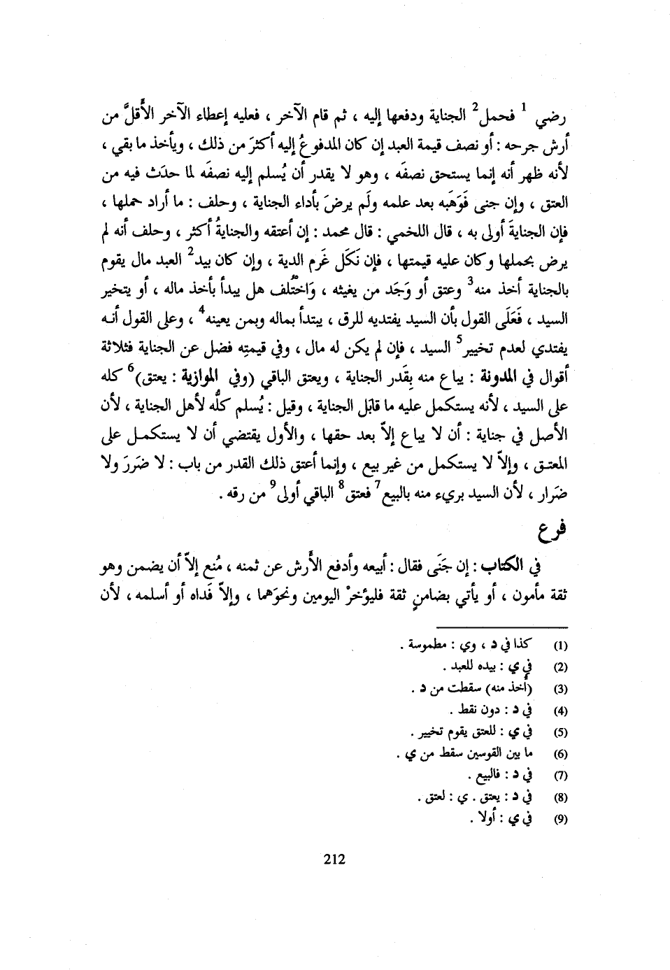 رَضِيَ فَحَمَلَ الْجِنَايَةَ وَدَفَعَهَا إِلَيْهِ ثُمَّ قَامَ الْآخَرُ فَعَلَيْهِ إِعْطَاءُ الْآخَرِ الْأَقَلَّ مِنْ أَرْشِ جرحه أَو نِصْفِ قِيمَةِ الْعَبْدِ إِنْ كَانَ الْمَدْفُوعُ إِلَيْهِ أَكْثَرَ مِنْ ذَلِكَ وَيَأْخُذُ مَا بَقِيَ لِأَنَّهُ ظَهَرَ أَنَّهُ إِنَّمَا يَسْتَحِقُّ نِصْفَهُ وَهُوَ لَا يَقْدِرُ أَنْ يُسَلِّمَ إِلَيْهِ نِصْفَهُ لِمَا حَدَثَ فِيهِ مِنَ الْعِتْقِ وَإِنْ جَنَى فَوَهَبَهُ بَعْدَ عِلْمِهِ وَلَمْ يَرْضَ بِأَدَاءِ الْجِنَايَةِ وَحَلَفَ مَا أَرَادَ حملهَا فغن الْجِنَايَةَ أَوْلَى بِهِ قَالَ اللَّخْمِيُّ قَالَ مُحَمَّدٌ إِنْ أَعْتَقَهُ وَالْجِنَايَةُ أَكْثَرُ وَحَلَفَ أَنَّهُ لَمْ يَرْضَ بِحَمْلِهَا وَكَانَ عَلَيْهِ قِيمَتُهَا فَإِنْ نَكَلَ غَرِمَ الدِّيَةَ وَإِنْ كَانَ بِيَدِ الْعَبْدِ مَالٌ يَقُومُ بِالْجِنَايَةِ أُخِذَ مِنْهُ وَعُتِقَ أَوْ وُجِدَ من يغيثه وَاخْتُلِفَ هَلْ يَبْدَأُ بِأَخْذِ مَالِهِ أَوْ يَتَخَيَّرُ السَّيِّدُ فَعَلَى الْقَوْلِ بِأَنَّ السَّيِّدَ يَفْتَدِيهِ لِلرِّقِّ يُبْتَدَأُ بِمَالِهِ وَبِمَنْ يُعِينُهُ وَعَلَى الْقَوْلِ أَنَّهُ يَفْتَدِي لِعَدَمِ تَخْيِيرِ السَّيِّدِ فَإِنْ لَمْ يَكُنْ لَهُ مَالٌ وَفِي قِيمَتِهِ فَضْلٌ عَنِ الْجِنَايَةِ فَثَلَاثَةُ أَقْوَالٍ فِي الْمُدَوَّنَةِ يُبَاعُ مِنْهُ بِقَدْرِ الْجِنَايَةِ وَيُعْتَقُ الْبَاقِي (وَفِي الْمَوَّازِيَّةِ يُعْتَقُ) كُلُّهُ عَلَى السَّيِّدِ لِأَنَّهُ يَسْتَكْمِلُ عَلَيْهِ مَا قَابَلَ الْجِنَايَةَ وَقِيلَ يُسَلَّمُ كُلُّهُ لِأَهْلِ الْجِنَايَةِ لِأَنَّ الأَصْل فِي جِنَايَة أَن لَا يُبَاع إِلَّا بعد حَقّهَا وَالْأول يَقْتَضِي أَن لَا يُسْتَكْمَلَ عَلَى الْمُعْتِقِ وَإِلَّا لَا يُسْتَكْمَلُ مِنْ غَيْرِ بَيْعٍ وَإِنَّمَا أُعْتِقَ ذَلِكَ الْقَدْرُ مِنْ بَابِ لَا ضَرَرَ وَلَا ضِرَارَ لِأَنَّ السَّيِّدَ بَرِيءٌ مِنْهُ بِالْبَيْعِ فَعِتْقُ الْبَاقِي أَوْلَى مِنْ رِقِّهِ