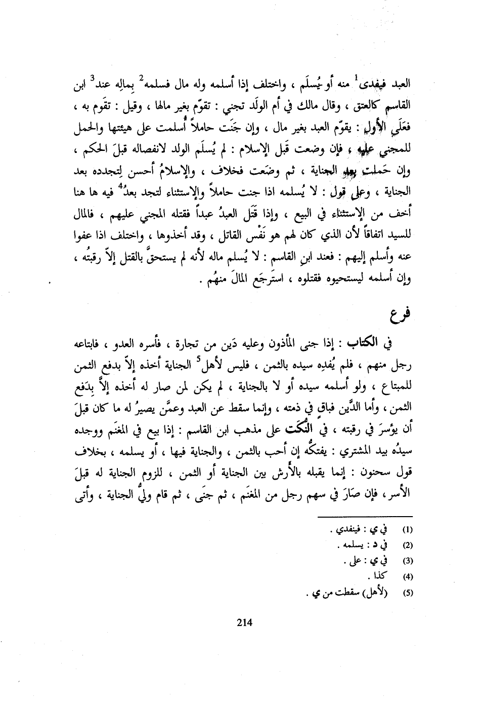 الْعَبْدُ فَيُفْدَى مِنْهُ أَوْ يُسَلَّمُ وَاخْتُلِفَ إِذَا أسلمه وَله مَال فسلمه بِمَالِهِ عِنْدَ ابْنِ الْقَاسِمِ كَالْعِتْقِ وَقَالَ مَالِكٌ فِي أُمِّ الْوَلَدِ تَجْنِي تُقَوَّمُ بِغَيْرِ مَالِهَا وَقِيلَ تُقَوَّمُ بِهِ فَعَلَى الْأَوَّلِ يُقَوَّمُ الْعَبْدُ بِغَيْرِ مَالٍ وَإِنْ جَنَتْ حَامِلًا أُسْلِمَتْ عَلَى هَيْئَتِهَا وَالْحَمْلُ لِلْمَجْنِيِّ عَلَيْهِ فَإِنْ وَضَعَتْ قَبْلَ الْإِسْلَامِ لَمْ يُسْلَمِ الْوَلَدُ لِانْفِصَالِهِ قَبْلَ الْحُكْمِ وَإِنْ حَمَلَتْ بَعْدَ الْجِنَايَةِ ثُمَّ وَضَعَتْ فَخِلَافٌ وَالْإِسْلَامُ أَحْسَنُ لِتَجَدُّدِهِ بَعْدَ الْجِنَايَةِ وَعَلَى قَوْلٍ لَا يُسلمهُ إِذا جنت حَامِلا وَالِاسْتِثْنَاء لتجد بعد فِيهِ هَا هُنَا أخف من الِاسْتِثْنَاء فِي الْبَيْعِ وَإِذَا قَتَلَ الْعَبْدُ عَبْدًا فَقَتَلَهُ الْمَجْنِيُّ عَلَيْهِمْ فَالْمَالُ لِلسَّيِّدِ اتِّفَاقًا لِأَنَّ الَّذِي كَانَ لَهُمْ هُوَ نَفْسُ الْقَاتِلِ وَقَدْ أَخَذُوهَا وَاخْتُلِفَ إِذَا عَفَوْا عَنْهُ وَأُسْلِمَ إِلَيْهِمْ فَعِنْدَ ابْنِ الْقَاسِمِ لَا يُسَلَّمُ مَالُهُ لِأَنَّهُ لَمْ يَسْتَحِقَّ بِالْقَتْلِ إِلَّا رَقَبَتَهُ وَإِنْ أَسْلَمَهُ لِيَسْتَحْيُوهُ فَقَتَلُوهُ اسْترْجع المَال مِنْهُم