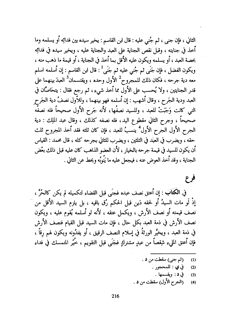 الثَّانِي فَإِنْ جَنَى ثُمَّ جُنِيَ عَلَيْهِ قَالَ ابْنُ الْقَاسِمِ يُخَيَّرُ سَيِّدُهُ بَيْنَ فِدَائِهِ أَوْ يُسلمهُ وَمَا أَخذ فِي جِنَايَته وَقبل نَقْصِ الْجِنَايَةِ عَلَى الْعَبْدِ وَالْجِنَايَةِ عَلَيْهِ وَيُخَيَّرُ سَيِّدُهُ فِي فِدَائِهِ بِحِصَّةِ الْعَبْدِ أَوْ يُسْلِمُهُ وَيَكُونُ عَلَيْهِ الْأَقَلُّ بِمَا أَخَذَ فِي الْجِنَايَةِ أَوْ قِيمَةِ مَا ذَهَبَ مِنْهُ وَيَكُونُ الْفَضْلُ فَإِن جنى ثمَّ حني عَلَيْهِ ثمَّ حَنى قَالَ ابْنُ الْقَاسِمِ إِنْ أَسْلَمَهُ أَسْلَمَ مَعَهُ دِيَةَ جُرْحِهِ فَكَانَ ذَلِكَ لِلْمَجْرُوحِ الْأَوَّلِ وَحْدَهُ وَيَقْتَسِمَانِ الْعَبْدَ بَيْنَهُمَا عَلَى قَدْرِ الْجِنَايَتَيْنِ وَلَا يُحْسَبُ عَلَى الْأَوَّلِ مِمَّا أَخَذَ شَيْءٌ ثُمَّ رَجَعَ فَقَالَ يَتَحَاصَّانِ فِي الْعَبْدِ وَدِيَّةِ الْجُرْحِ وَقَالَ أَشْهَبُ إِنْ أَسْلَمَهُ فَهُوَ بَيْنَهُمَا وَلِلْأَوَّلِ نِصْفُ دِيَةِ الْجُرْحِ الَّتِي كَانَتْ وَجَبَتْ لِلْعَبْدِ وَلِلسَّيِّدِ نِصْفُهَا لِأَنَّهُ جَرَحَ الْأَوَّلَ صَحِيحًا فَلَهُ نِصْفُهُ صَحِيحًا وَجَرَحَ الثَّانِي مَقْطُوعَ الْيَدِ فَلَهُ نِصْفُهُ كَذَلِكَ وَقَالَ عَبْدُ الْمَلِكِ دِيَةُ الْجُرْحِ الأول الْحَرج الأول ينْسب لِلْعَبْدِ فَإِنْ كَانَ ثُلُثَهُ فَقَدْ أَخَذَ الْمَجْرُوحُ ثلث حَقه وَيضْرب فِي العَبْد فِي الثُّلثَيْنِ وَيضْرب للثَّانِي بِجُرْحِهِ كُلِّهِ قَالَ مُحَمَّدٌ الْقِيَاسُ أَنْ يَكُونَ للسَّيِّد فِي قِيمَةِ جُرْحِهِ بِالْخِيَارِ لِأَنَّ الْعُضْوَ الذَّاهِبَ كَانَ عَلَيْهِ قَبْلَ ذَلِكَ بَعْضُ الْجِنَايَةِ وَقَدْ أَخذ البعوض عَنْهُ فَيَجْعَلُ عَلَيْهِ مَا يَنُوبُهُ وَيَحُطُّ عَنِ الثَّانِي
