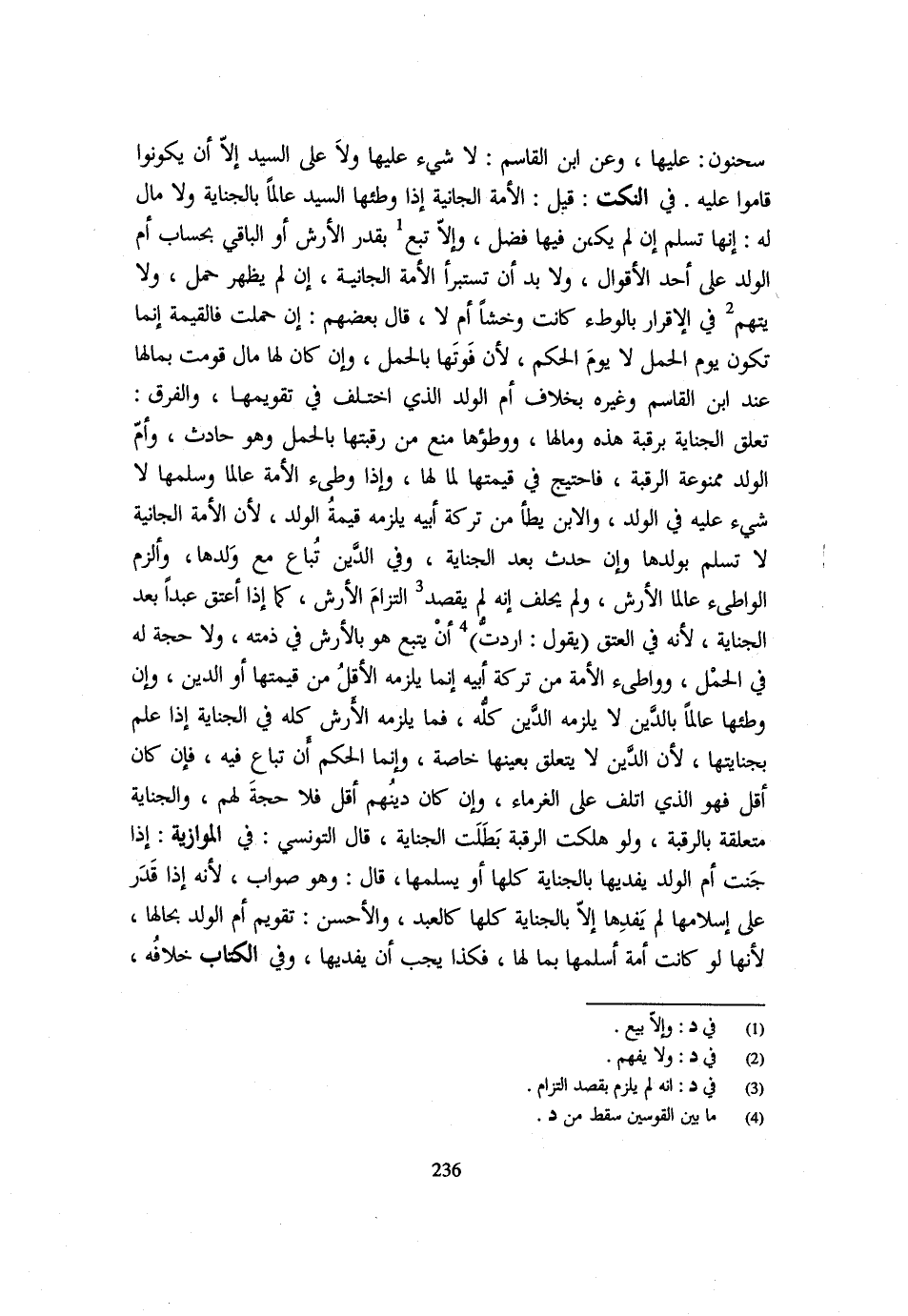 سَحْنُونٍ عَلَيْهَا وَعَنِ ابْنِ الْقَاسِمِ لَا شَيْءَ عَلَيْهَا وَلَا عَلَى السَّيِّدِ إِلَّا أَنْ يَكُونُوا قَامُوا عَلَيْهِ فِي النُّكَتِ قِيلَ الْأَمَةُ الْجَانِيَةُ إِذا وَطئهَا السَّيِّدِ إِلَّا أَنْ يَكُونُوا قَامُوا عَلَيْهِ فِي النُّكَتِ قِيلَ الْأَمَةُ الْجَانِيَةُ إِذَا وَطِئَهَا السَّيِّدُ عَالما بِالْجِنَايَةِ وَلَا مَال لَهُ إِنَّا تُسَلَّمُ إِنْ لَمْ يَكُنْ فِيهَا فَضْلٌ وَإِلَّا تُبِعَ بِقَدْرِ الْأَرْشِ أَوِ الْبَاقِي بِحِسَابِ أُمِّ الْوَلَد على أحد الْأَقْوَال ولابد أَن تستبرأ المة الْجَانِيَةُ إِنْ لَمْ يَظْهَرْ حَمْلٌ وَلَا يُتَّهَمُ فِي الْإِقْرَارِ بِالْوَطْءِ كَانَتْ وَخْشًا أَمْ لَا قَالَ بَعْضُهُمْ إِنْ حَمَلَتْ فَالْقِيمَةُ إِنَّمَا تَكُونُ يَوْمَ الْحَمْلِ لَا يَوْمَ الْحُكْمِ لِأَنَّ فَوْتَهَا بِالْحَمْلِ وَإِنْ كَانَ لَهَا مَالٌ قُوِّمَتْ بِمَالِهَا عِنْدَ ابْنِ الْقَاسِمِ وَغَيْرِهِ بِخِلَافِ أُمِّ الْوَلَدِ الَّذِي اخْتلف فِي بقويمها وَالْفَرْقُ تَعَلُّقُ الْجِنَايَةِ بِرَقَبَةِ هَذِهِ وَمَالِهَا وَوَطْؤُهَا منع من رقتبها بِالْحَمْلِ وَهُوَ حَادِثٌ وَأُمُّ الْوَلَدِ مَمْنُوعَةُ الرَّقَبَةِ فاحتيج فِي قيمتهَا لما لَهَا وَإِذا وطىء الْأَمَةَ عَالِمًا وَسَلَّمَهَا لَا شَيْءَ عَلَيْهِ فِي الْوَلَدِ وَالِابْنُ يَطَأُ مِنْ تَرِكَةِ أَبِيهِ يَلْزَمُهُ قِيمَةُ الْوَلَدِ لِأَنَّ الْأَمَةَ الْجَانِيَةَ لَا تُسَلَّمُ بِوَلَدِهَا وَإِنْ حَدَثَ بَعْدَ الْجِنَايَةِ وَفِي الدَّيْنِ تبَاع مَعَ وَلَدهَا وألزم الواطىء عَالِمًا الْأَرْشَ وَلَمْ يَحْلِفْ إِنَّهُ لَمْ يَقْصِدِ الْتِزَامَ الْأَرْشِ كَمَا إِذَا أَعْتَقَ عَبْدًا بَعْدَ الْجِنَايَة لنه فِي الْعتْق (يَقُولُ أَرَدْتُ) أَنْ يُتْبَعَ هُوَ بِالْأَرْشِ فِي ذمَّته وَلَا حجَّة لَهُ فِي الْحمل وواطىء الْأَمَةِ مِنْ تَرِكَةِ أَبِيهِ إِنَّمَا يَلْزَمُهُ الْأَقَلُّ مِنْ قِيمَتِهَا أَوِ الدَّيْنُ وَإِنْ وَطِئَهَا عَالِمًا بِالدَّيْنِ لَا يَلْزَمُهُ الدَّيْنُ كُلُّهُ فَمَا يَلْزَمُهُ الْأَرْش كُله فِي الْجِنَايَة إِذَا عَلِمَ بِجِنَايَتِهَا لِأَنَّ الدَّيْنَ لَا يَتَعَلَّقُ بِعَيْنِهَا خَاصَّةً وَإِنَّمَا الْحُكْمُ أَنْ تُبَاعَ فِيهِ فَإِن كَانَ أَقَلَّ فَهُوَ الَّذِي أُتْلِفَ عَلَى الْغُرَمَاءِ وَإِنْ كَانَ دَيْنُهُمْ أَقَلَّ فَلَا حُجَّةَ لَهُمْ وَالْجِنَايَةُ مُتَعَلِّقَةٌ بِالرَّقَبَةِ وَلَوْ هَلَكَتِ الرَّقَبَةُ بَطَلَتِ الْجِنَايَةُ قَالَ التُّونُسِيُّ فِي الْمَوَّازِيَّةِ إِذَا جَنَتْ أُمُّ الْوَلَد يفديها بِالْجِنَايَةِ كلهَا أَو ليسلمها قَالَ وَهُوَ صَوَابٌ لِأَنَّهُ إِذَا قَدَرَ عَلَى إِسْلَامِهَا لَمْ يَفْدِهَا إِلَّا بِالْجِنَايَةِ كُلِّهَا كَالْعَبْدِ وَالْأَحْسَنُ تَقْوِيمُ أُمِّ الْوَلَدِ بِحَالِهَا لِأَنَّهَا لَوْ كَانَتْ أَمَةً أَسْلَمَهَا بِمَا لَهَا فَكَذَا يَجِبُ أَنْ يَفْدِيَهَا وَفِي الْكِتَابِ خِلَافُهُ