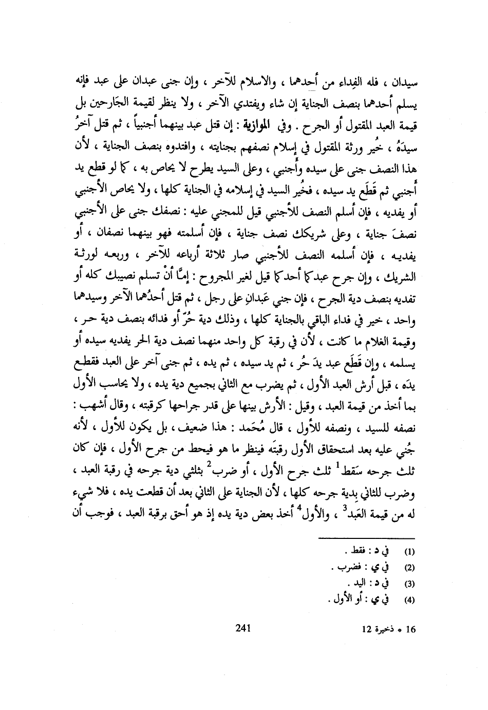 سَيِّدَانِ فَلَهُ الْفِدَاءُ مِنْ أَحَدِهِمَا وَالْإِسْلَامُ لِلْآخَرِ وَإِنْ جَنَى عَبْدَانِ عَلَى عَبْدٍ فَإِنَّهُ يُسَلِّمُ أَحَدَهُمَا بِنِصْفِ الْجِنَايَةِ إِنْ شَاءَ وَيَفْتَدِي الْآخَرَ ولاي نظر لِقِيمَةِ الْجَارِحِينَ بَلْ قِيمَةِ الْعَبْدِ الْمَقْتُولِ أَوِ الْجُرْحِ وَفِي الْمَوَّازِيَّةِ إِنْ قَتَلَ عَبْدٌ بَيْنَهُمَا أَجْنَبِيًّا ثُمَّ قَتَلَ آخَرُ سَيِّدَهُ خُيِّرَ وَرَثَةُ الْمَقْتُول فِي إِسْلَام نصفهم بِجِنَايَتِهِ وافتدوه بِنِصْفِ الْجِنَايَةِ لِأَنَّ هَذَا النِّصْفَ جَنَى عَلَى سَيِّدِهِ وَأَجْنَبِيٍّ وَعَلَى السَّيِّدِ يُطْرَحُ لَا يُحَاصُّ بِهِ كَمَا لَوْ قَطَعَ يَدَ أَجْنَبِيٍّ ثُمَّ قَطَعَ يَدَ سَيِّدِهِ فَخُيِّرَ السَّيِّدُ فِي إِسْلَامِهِ فِي الْجِنَايَةِ كُلِّهَا وَلَا يُحَاصُّ الْأَجْنَبِيُّ أَوْ يَفْدِيهِ فَإِنْ أَسْلَمَ النِّصْفَ لِلْأَجْنَبِيِّ قِيلَ لِلْمَجْنِيِّ عَلَيْهِ نِصْفُكَ جَنَى عَلَى الْأَجْنَبِيِّ نِصْفَ جِنَايَةٍ وَعَلَى شَرِيكِكَ نِصْفَ جِنَايَةٍ فَإِنْ أَسْلَمْتَهُ فَهُوَ بَيْنَهُمَا نِصْفَانِ أَوْ يَفْدِيهِ فَإِنْ أَسْلَمَهُ النِّصْفَ لأَجْنَبِيّ صَارَ ثَلَاثَةُ أَرْبَاعِهِ لِلْآخَرِ وَرُبْعُهُ لِوَرَثَةِ الشَّرِيكِ وَإِن جرح عبد كَمَا أحد كَمَا قيل لغير الْمَجْرُوح إِمَّا أَنْت تُسْلِمَ نَصِيبَكَ كُلَّهُ أَوْ تَفْدِيَهُ بِنِصْفِ دِيَةِ الْجُرْحِ فَإِنْ جَنَى عَبْدَانِ عَلَى رَجُلٍ ثُمَّ قَتَلَ أَحَدُهُمَا الْآخَرَ وَسَيِّدُهُمَا وَاحِدٌ خُيِّرَ فِي فِدَاءِ الْبَاقِي بِالْجِنَايَةِ كُلِّهَا وَذَلِكَ دِيَةُ حُرٍّ وَقِيمَةِ الْغُلَامِ مَا كَانَتْ لِأَنَّ فِي رَقَبَةِ كُلِّ وَاحِدٍ مِنْهُمَا نِصْفُ دِيَةِ الْحُرِّ يَفْدِيهِ سَيِّدُهُ أَوْ يُسْلِمُهُ وَإِنْ قَطَعَ عَبْدٌ يَدَ حُرٍّ ثُمَّ يَدَ سَيِّدِهِ ثُمَّ يَدَهُ ثُمَّ جنى آخر على العَبْد فَقطع يَده قبل أرش العَبْد الأول قالم مُحَمَّدٌ هَذَا ضَعِيفٌ بَلْ يَكُونُ لِلْأَوَّلِ لِأَنَّهُ جَنَى عَلَيْهِ بَعْدَ اسْتِحْقَاقِ الْأَوَّلِ رَقَبَتَهُ فَيُنْظَرُ مَا هُوَ فَيُحَطُّ مِنْ جُرْحِ الْأَوَّلِ فَإِنْ كَانَ ثُلُثُ جُرْحِهِ سَقَطَ ثُلُثُ جُرْحِ الْأَوَّلِ أَوْ ضُرِبَ بِثُلُثَيْ دِيَةِ جُرْحِهِ فِي رَقَبَةِ الْعَبْدِ وَضُرِبَ لِلثَّانِي بِدِيَةِ جُرْحِهِ كُلِّهَا لِأَنَّ الْجِنَايَةَ عَلَى الثَّانِي بَعْدَ أَنْ قُطِعَتْ يَدُهُ إِذْ هُوَ أَحَقُّ بِرَقَبَةِ الْعَبْدِ فَوَجَبَ أَنْ