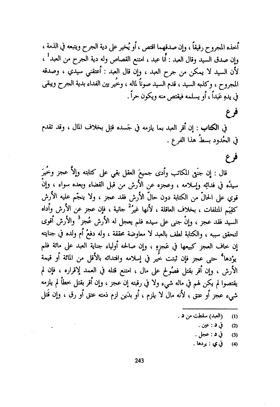 أَخَذَهُ الْمَجْرُوحُ رَقِيقًا وَإِنْ صَدَّقَهُمَا اقْتُصَّ أَوْ يُخَيَّرُ عَلَى دِيَةِ الْجُرْحِ وَيَتْبَعُهُ فِي الذِّمَّةِ وَإِنْ صَدَقَ السَّيِّدُ وَقَالَ الْعَبْدُ أَنَا عَبْدٌ امْتُنِعَ الْقِصَاصُ وَلَهُ دِيَةُ الْجُرْحِ مِنَ الْعَبْدِ لِأَنَّ السَّيِّدَ لَا يُمَكَّنُ مِنْ جُرْحِ الْعَبْدِ وَإِنْ قَالَ الْعَبْدُ أَعْتَقَنِي سَيِّدِي وَصَدَّقَهُ الْمَجْرُوحُ وَكَذَّبَهُ السَّيِّدُ قُدِّمَ السَّيِّدُ صَوْنًا لِمَالِهِ وَخُيِّرَ بَيْنَ الْفِدَاءِ بِدِيَةِ الْجُرْحِ وَيَبْقَى فِي يَدِهِ عَبْدًا أَوْ يُسْلِمُهُ فَيُقْتَصُّ مِنْهُ وَيَكُونُ حُرًّا