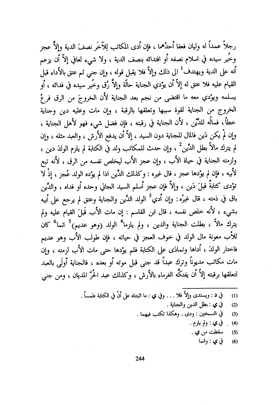رَجُلًا عَمْدًا لَهُ وَلِيَّانِ فَعَفَا أَحَدُهُمَا فَإِنْ أَدَّى الْمُكَاتَبُ لِلْآخَرِ نِصْفَ الدِّيَةِ وَإِلَّا عَجَزَ وَخُيِّرَ سَيِّدُهُ فِي إِسْلَامِ نِصْفِهِ أَوِ افْتِدَائِهِ بِنصْف الدِّيَة وَلَا شَيْء لعافي إِلَّا أَنْ يَزْعُمَ أَنَّهُ عَلَى الدِّيَةِ وَيَهْتَدِفُ إِلَى ذَلِكَ وَإِلَّا فَلَا يُقْبَلُ قَوْلُهُ وَإِنْ جَنَى ثُمَّ عُتِقَ بِالْأَدَاءِ قَبْلَ الْقِيَامِ عَلَيْهِ فَلَا عِتْقَ لَهُ إِلَّا أَنْ يُؤَدِّيَ الْجِنَايَةَ حَالَّةً وَإِلَّا رُقَّ وَخُيِّرَ سَيِّدُهُ فِي فِدَائِهِ أَوْ يُسْلِمُهُ وَيُؤَدِّي مَعَهُ مَا اقْتَضَى مِنْ نَجْمٍ بَعْدَ الْجِنَايَةِ لِأَنَّ الْخُرُوجَ مِنَ الرِّقِّ فَرْعُ الْخُرُوجِ مِنَ الْجِنَايَةِ لِقُوَّةِ سَبَبِهَا وَتَعَلُّقِهَا بِلَا رَقَبَة وَإِنْ مَاتَ وَعَلَيْهِ دَيْنٌ وَجِنَايَةٌ خَطَأٌ فَمَالُهُ لِلدَّيْنِ لِأَنَّ الْجِنَايَةَ فِي رَقَبَتِهِ فَإِنْ فَضَلَ شَيْءٌ فَهُوَ لِأَهْلِ الْجِنَايَةِ وَإِنْ لَمْ يَكُنْ دَيْنٌ فَالْمَالُ لِلْجِنَايَةِ دُونَ السَّيِّدِ إِلَّا أَنْ يَدْفَعَ الْأَرْشَ وَالْعَبْدُ مِثْلُهُ وَإِنْ لَمْ يَتْرُكْ مَالًا بَطَلَ الدَّيْنُ وَإِنْ حَدَثَ لِلْمُكَاتَبِ وَلَدٌ فِي الْكِتَابَةِ لَمْ يَلْزَمِ الْوَلَدَ دَيْنٌ وَلَزِمَتْهُ الْجِنَايَة فِي حَيَاة الْأَب وَإِن عَجَزَ الْأَبُ لِيُخَلِّصَ نَفْسَهُ مِنَ الرِّقِّ لِأَنَّهُ تَبَعٌ لِأَبِيهِ فَإِنْ لَمْ يُؤَدِّهَا عَجَزَ قَالَ غَيْرُهُ وَكَذَلِكَ الدَّيْنُ إِذَا لَمْ يُؤَدِّهِ الْوَلَدُ عَجَزَ إِذْ لَا تُؤَدَّى كِتَابَةٌ قَبْلَ دَيْنٍ وَإِلَّا فَإِنْ عَجَزَ أَسْلَمَ السَّيِّدُ الْجَانِيَ وَحْدَهُ أَوْ فَدَاهُ وَالدَّيْنُ بَاقٍ فِي ذِمَّتِهِ قَالَ غَيْرُهُ وَإِنْ أَدَّى الْوَلَدُ الدَّيْنَ وَالْجِنَايَةَ وَعُتِقَ لَمْ يَرْجِعْ عَلَى أَبِيهِ بِشَيْءٍ لِأَنَّهُ خَلَّصَ نَفْسَهُ قَالَ ابْنُ الْقَاسِمِ إِنْ مَاتَ الْأَبُ قَبْلَ الْقِيَامِ عَلَيْهِ وَلَمْ يَتْرُكْ مَالًا بَطَلَتِ الْجِنَايَةُ وَالدَّيْنُ وَلَمْ يَلْزَمَا الْوَلَدَ (وَهُوَ عَدِيمٌ) إِنَّمَا كَانَ لِلْأَبِ مَعُونَةُ مَالِ الْوَلَدِ فِي خَوْفِ الْعَجْزِ فِي حَيَاتِهِ فَإِنْ طُولِبَ الْأَبُ وهوعديم فَاخْتَارَ الْوَلَد أَدَّاهَا وَتَمَادَى عَلَى الْكِتَابَةِ فَلَمْ يُؤَدِّهَا حَتَّى مَاتَ الْأَبُ لَزِمَتْهُ وَإِنْ مَاتَ مَكَاتَبٌ مَدْيُونًا وَتَرَكَ عَبْدًا قَدْ جَنَى قَبْلَ مَوْتِهِ أَوْ بَعْدَهُ فَالْجِنَايَةُ أَوْلَى بِالْعَبْدِ لِتَعَلُّقِهَا بِرَقَبَتِهِ إِلَّا أَنْ يَفْتَكَّهُ الْغُرَمَاءُ بِالْأَرْشِ وَكَذَلِكَ عَبْدُ الْحُرِّ الْمِدْيَانُ وَمن جني