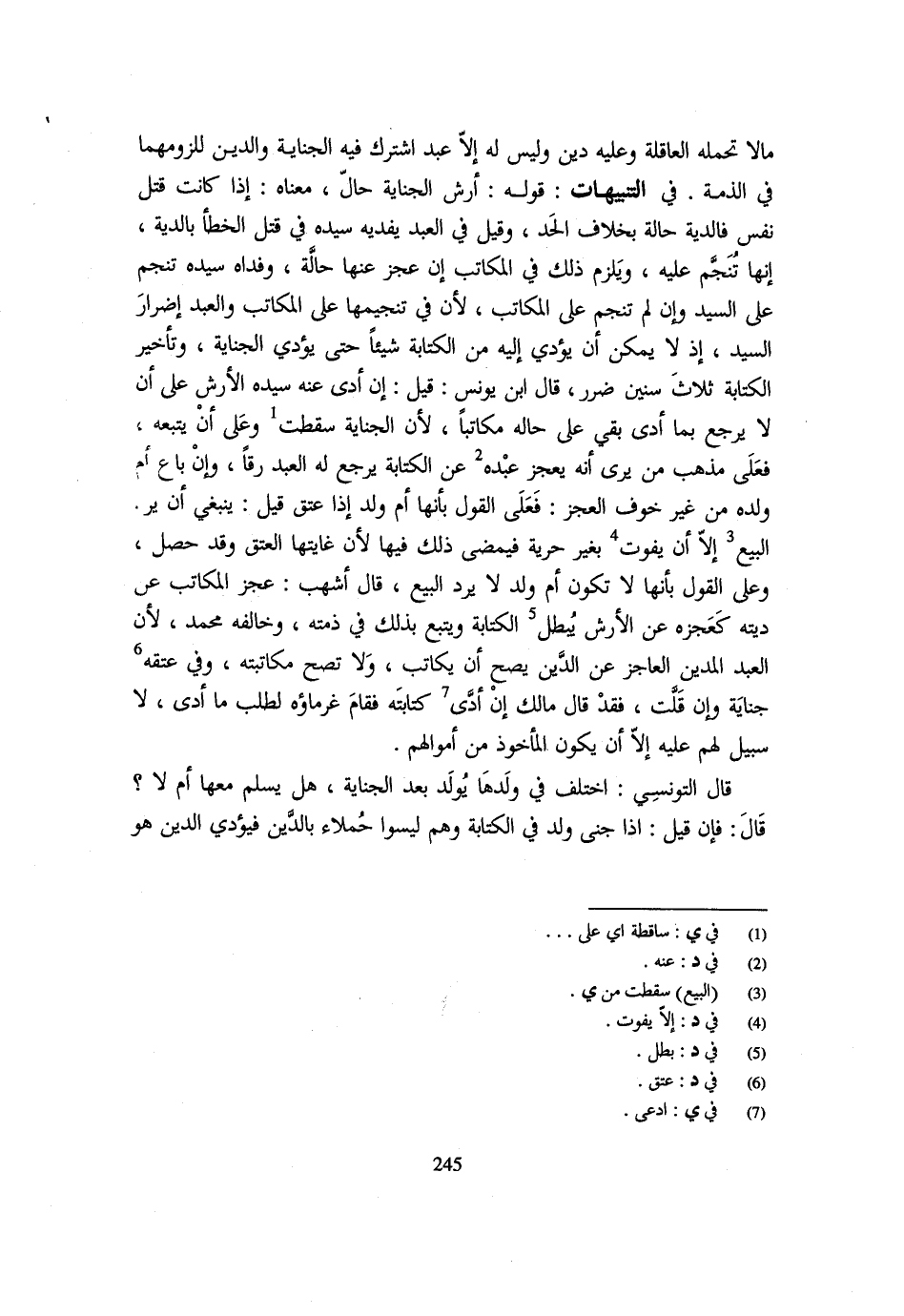 مَالًا تَحْمِلُهُ الْعَاقِلَةُ وَعَلَيْهِ دَيْنٌ وَلَيْسَ لَهُ إِلَّا عَبْدٌ اشْتَرَكَ فِيهِ الْجِنَايَةُ وَالدَّيْنُ لِلُزُومِهِمَا فِي الذِّمَّةِ فِي التَّنْبِيهَاتِ قَوْلُهُ أَرْشُ الْجِنَايَةِ حَالٌّ مَعْنَاهُ إِذَا كَانَتْ قَتْلَ نَفْسٍ فَالدِّيَةُ حَالَة بِخِلَاف الْحَد وَقِيلَ فِي الْعَبْدِ يَفْدِيهِ سَيِّدُهُ فِي قَتْلِ الْخَطَأِ بِالدِّيَةِ إِنَّهَا تُنَجَّمُ عَلَيْهِ وَيَلْزَمُ ذَلِكَ فِي الْمُكَاتَبِ إِنْ عَجَزَ عَنْهَا حَالَّةً وَفَدَاهُ سَيِّدُهُ تُنَجَّمُ عَلَى السَّيِّدِ وَإِنْ لَمْ تُنَجَّمْ عَلَى الْمُكَاتَبِ لِأَنَّ فِي تَنْجِيمِهَا عَلَى الْمُكَاتَبِ وَالْعَبْدِ إِضْرَارَ السَّيِّدِ إِذْ لَا يُمْكِنُ أَنْ يُؤَدِّيَ إِلَيْهِ مِنَ الْكِتَابَةِ شَيْئًا حَتَّى يُؤَدِّيَ الْجِنَايَةَ وَتَأْخِيرُ الْكِتَابَةِ ثَلَاثَ سِنِينَ ضَرَرٌ قَالَ ابْنُ يُونُسَ قِيلَ إِنْ أَدَّى عَنْهُ سَيِّدُهُ الْأَرْش على أَن لَا يَرْجِعَ بِمَا أَدَّى بَقِيَ عَلَى حَالِهِ مُكَاتَبًا لِأَنَّ الْجِنَايَةَ سَقَطَتْ وَعَلَى أَنْ يَتْبَعَهُ فَعَلَى مَذْهَبِ مَنْ يَرَى أَنَّهُ يُعْجِزُ عَبْدَهُ عَنِ الْكِتَابَةِ يَرْجِعُ لَهُ الْعَبْدُ رِقًّا وَإِنْ بَاعَ أُمَّ وَلَدِهِ مِنْ غَيْرِ خَوْفِ الْعَجْزِ فَعَلَى الْقَوْلِ بِأَنَّهَا أُمُّ وَلَدٍ إِذَا عُتِقَ قِيلَ يَنْبَغِي أَن ير البيع إِلَّا أَن يفوت بِغَيْر حُرِّيَّةٍ فَيَمْضِي ذَلِكَ فِيهَا لِأَنَّ غَايَتَهَا الْعِتْقُ وَقَدْ حَصَلَ وَعَلَى الْقَوْلِ بِأَنَّهَا لَا تَكُونُ أُمَّ وَلَدٍ لَا يُرَدُّ الْبَيْعُ قَالَ أَشْهَبُ عَجْزُ الْمُكَاتَبِ عَنْ دِيَتِهِ كَعَجْزِهِ عَنِ الْأَرْشِ يُبْطِلُ الْكِتَابَةَ وَيُتَّبَعُ بِذَلِكَ فِي ذِمَّتِهِ وَخَالَفَهُ مُحَمَّدٌ لِأَنَّ الْعَبْدَ الْمَدِينَ الْعَاجِزَ عَنِ الدَّيْنِ يَصح أَن يُكَاتب وَلَا تصح مُكَاتبَته وَفِي عتقه جِنَايَةٌ وَإِنْ قَلَّتْ فَقَدْ قَالَ مَالِكٌ إِنْ أَدَّى كِتَابَتَهُ فَقَامَ غُرَمَاؤُهُ لِطَلَبِ مَا أَدَّى لَا سَبِيلَ لَهُمْ عَلَيْهِ إِلَّا أَنْ يَكُونَ الْمَأْخُوذُ مِنْ أَمْوَالِهِمْ قَالَ التُّونُسِيُّ اخْتُلِفَ فِي وَلَدِهَا يُولَدُ بَعْدَ الْجِنَايَةِ هَلْ يُسَلَّمُ مَعَهَا أَمْ لَا قَالَ فَإِنْ قِيلَ إِذَا جَنَى وَلَدٌ فِي الْكِتَابَةِ وَهُمْ لَيْسُوا حُمَلَاءَ بِالدَّيْنِ فَيُؤَدِّي الدّين