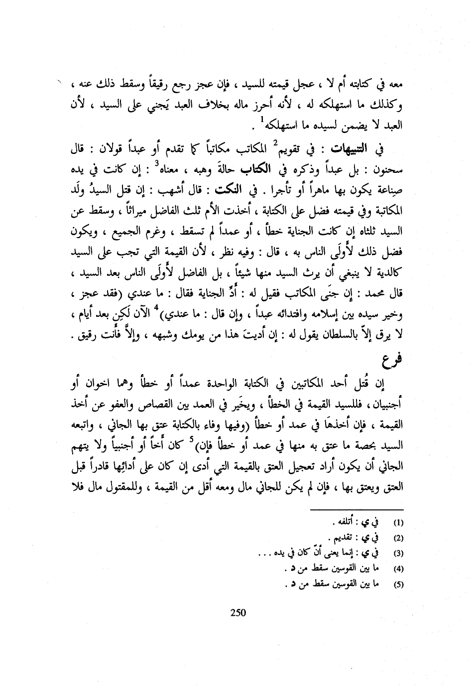 مَعَهُ فِي كِتَابَتِهِ أَمْ لَا عَجَّلَ قِيمَتَهُ لِلسَّيِّدِ فَإِنْ عَجَزَ رَجَعَ رَقِيقًا وَسَقَطَ ذَلِكَ عَنْهُ وَكَذَلِكَ مَا اسْتَهْلَكَهُ لَهُ لِأَنَّهُ أَحْرَزَ مَالَهُ بِخِلَافِ الْعَبْدِ يَجْنِي عَلَى السَّيِّدِ لِأَنَّ الْعَبْدَ لَا يَضْمَنُ لِسَيِّدِهِ مَا اسْتَهْلَكَهُ فِي التَّنْبِيهَاتِ فِي تَقْوِيمِ الْمُكَاتَبِ مُكَاتَبًا كَمَا تَقَدَّمَ أَوْ عَبْدًا قَوْلَانِ قَالَ سَحْنُونٌ بَلْ عَبْدًا وَذَكَرَهُ فِي الْكِتَابِ حَالَةَ وَهَبَهُ مَعْنَاهُ إِنْ كَانَتْ فِي يَدِهِ صِنَاعَةٌ يَكُونُ بِهَا مَاهِرًا أَو تأخرا فِي النكت قَالَ أَشهب إِن قتل السد وَلَدَ الْمُكَاتَبَةِ وَفِي قِيمَتِهِ فَضْلٌ عَلَى الْكِتَابَةِ أَخَذَتِ الْأُمُّ ثُلُثَ الْفَاضِلِ مِيرَاثًا وَسَقَطَ عَنِ السَّيِّد ثُلُثَاهُ إِن كَانَت الْجِنَايَة خطأ أَو عمدا لم تسْقط وَغُرِّمَ الْجَمِيعَ وَيَكُونُ فَضْلُ ذَلِكَ لِأَوْلَى النَّاسِ بِهِ قَالَ وَفِيهِ نَظَرٌ لِأَنَّ الْقَيِّمَةَ الَّتِي تَجِبُ عَلَى السَّيِّدِ كَالدِّيَةِ لَا يَنْبَغِي أَنْ يَرِثَ السَّيِّدُ مِنْهَا شَيْئًا بَلِ الْفَاضِلُ لِأَوْلَى النَّاسِ بَعْدَ السَّيِّدِ قَالَ مُحَمَّدٌ إِنْ جَنَى الْمُكَاتَبُ فَقِيلَ لَهُ أَدِّ الْجِنَايَةَ فَقَالَ مَا عِنْدِي (فَقَدْ عَجَزَ وَخُيِّرَ سَيِّدُهُ بَيْنَ إِسْلَامِهِ وَافْتِدَائِهِ عَبْدًا وَإِنْ قَالَ مَا عِنْدِي الْآنَ لَكِنْ بَعْدَ أَيَّامٍ لَا يُرَقُّ إِلَّا بِالسُّلْطَانٍ يَقُولُ لَهُ إِنْ أَدَّيْتَ هَذَا مِنْ يَوْمِكَ وَشِبْهِهِ وَإِلَّا فَأَنْتَ رَقِيقٌ