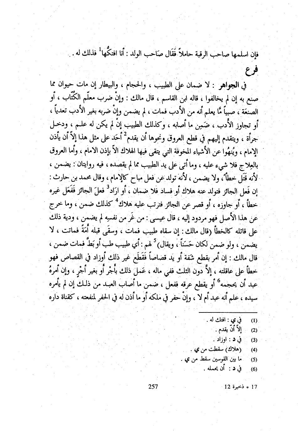 فَرْعٌ فِي الْجَوَاهِرِ لَا ضَمَانَ عَلَى الطَّبِيبِ وَالْحَجَّامِ وَالْبَيْطَارِ إِنْ مَاتَ حَيَوَانٌ مِمَّا صَنَعَ بِهِ إِنْ لَمْ يُخَالِفُوا قَالَهُ ابْنُ الْقَاسِمِ قَالَ مَالِكٌ وَإِنْ ضَرَبَ مُعَلِّمُ الْكُتَّابِ أَوِ الصَّنْعَةِ صِبِّيًا مَا يُعْلَمُ أَنَّهُ مِنَ الْأَدَبِ فَمَاتَ لَمْ يَضْمَنْ وَإِنْ ضَرَبَهُ بِغَيْرِ الْأَدَبِ تَعَدِّيًا أَوْ تَجَاوَزَ الْأَدَبَ ضَمِنَ مَا أَصَابَهُ وَكَذَلِكَ الطَّبِيبُ إِنْ لَمْ يَكُنْ لَهُ عَلِمٌ وَدَخَلَ جُرْأَةً وَيَتَقَدَّمُ إِلَيْهِمْ فِي قَطْعِ الْعُرُوقِ وَنَحْوهَا أَن يقدم أَحَدٌ عَلَى مِثْلِ هَذَا إِلَّا أَنْ يَأْذَنَ الإِمَام وينهوا عَنِ الْأَشْيَاءِ الْمُخَوِّفَةِ الَّتِي يُتَّقَى فِيهَا الْهَلَاكُ إِلَّا بِإِذن الإِمَام وَأما الْعُرُوق بِالْعِلَاجِ فَلَا شَيْءَ عَلَيْهِ وَمَا أَتَى عَلَى يَدِ الطَّبِيبِ مِمَّا لَمْ يَقْصِدْهُ فِيهِ رِوَايَتَانِ يَضْمَنُ لِأَنَّهُ قَتَلَ خَطَأً وَلَا يَضْمَنُ لِأَنَّهُ تَوَلَّدَ عَنْ فِعْلٍ مُبَاحٍ كَالْإِمَامِ وَقَالَ مُحَمَّدُ بْنُ حَارِثٍ إِنْ فَعَلَ الْجَائِزَ فَتَوَلَّدَ عَنْهُ هَلَاكٌ أَوْ فَسَادٌ فَلَا ضَمَانَ أَوْ أَرَادَ فِعْلَ الْجَائِزِ فَفَعَلَ غَيْرُهُ خَطَأً أَوْ جَاوَزَهُ أَوْ قَصَّرَ عَنِ الْجَائِزِ فَتَرَتَّبَ عَلَيْهِ هَلَاكٌ كَذَلِكَ ضَمِنَ وَمَا خَرَجَ عَنْ هَذَا الْأَصْلِ فَهُوَ مدرود إِلَيْهِ قَالَ عِيسَى مَنْ غَرَّ مِنْ نَفْسِهِ لميضمن ودية ذَلِك على قَاتله كَالْخَطَأِ (قَالَ مَالِكٌ إِنْ سَقَاهُ طَبِيبٌ فَمَاتَ وَسَقَى قَبْلَهُ أَمَةً فَمَاتَتْ لَا يَضْمَنُ وَلَوْ ضَمِنَ لَكَانَ حَسَنًا وَيُقَالُ) لَهُمْ أَيُّ طَبِيبٍ طَبَّ أَوْ بَطَّ فَمَاتَ ضَمِنَ قَالَ مَالِكٌ إِنْ أَمَرَ بِقَطْعِ شَفَةٍ أَوْ يَدٍ قِصَاصًا فَقُطِعَ غَيْرُ ذَلِكَ أَوْ زَادَ فِي الْقِصَاصِ فَهُوَ خَطَأٌ عَلَى عَاقِلَتِهِ إِلَّا دُونَ الثُّلُثِ فَفِي مَالِهِ عَمِلَ ذَلِكَ بِأَجْرٍ أَوْ بِغَيْرِ أجر وَإِن أمره سَيِّدُهُ عَلِمَ أَنَّهُ عَبْدٌ أَمْ لَا وَإِنَ حَفَرَ فِي مِلْكِهِ أَوْ مَا أُذِنَ لَهُ فِي الْحَفْرِ لِمَنْفَعَتِهِ كَقَنَاةِ دَارِهِ