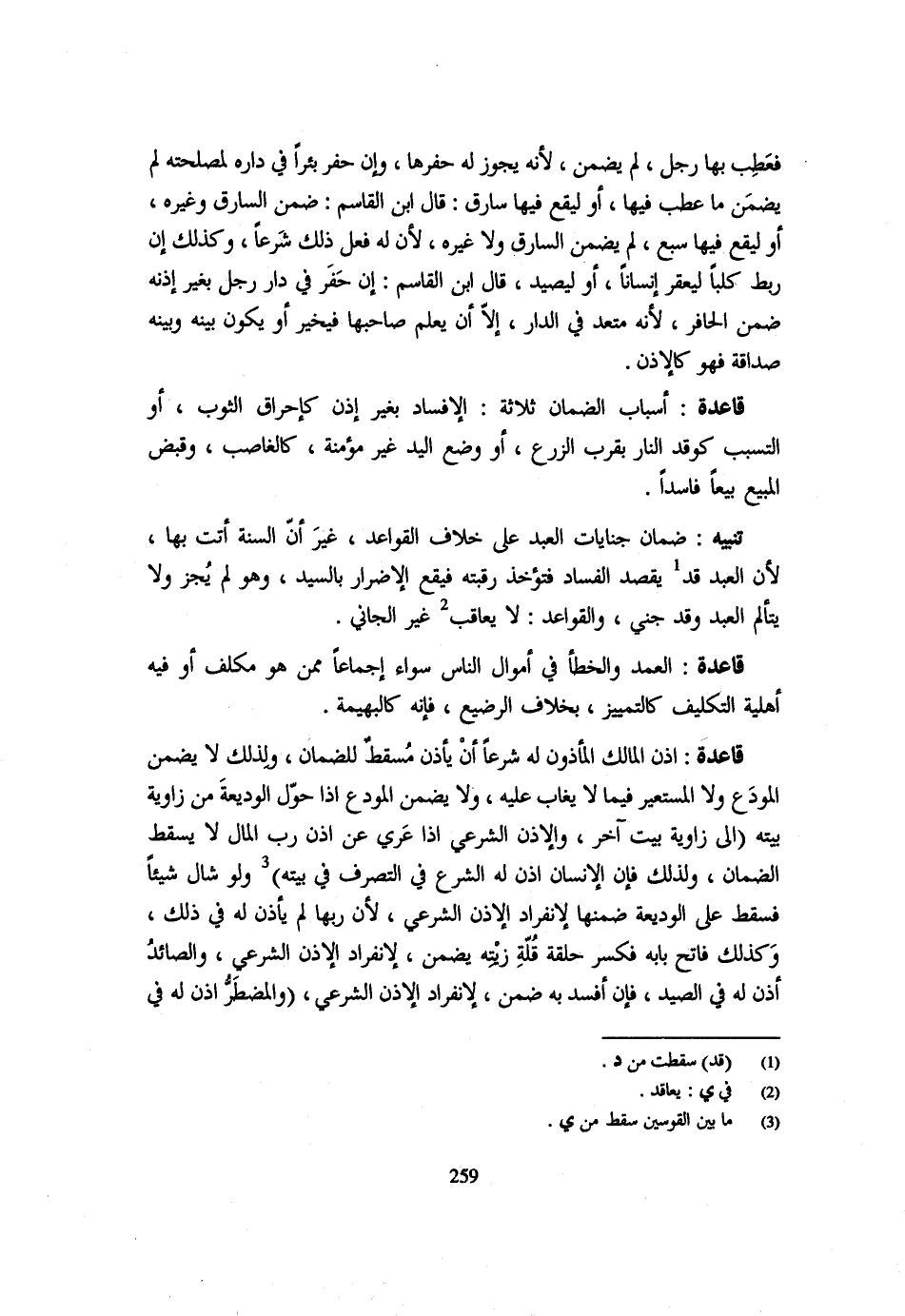 فَعَطِبَ بِهَا رَجُلٌ لَمْ يَضْمَنْ لِأَنَّهُ يَجُوزُ لَهُ حَفْرُهَا وَإِنْ حَفَرَ بِئْرًا فِي دَارِهِ لِمَصْلَحَتِهِ لَمْ يَضْمَنْ مَا عَطِبَ فِيهَا أَوْ لِيَقَعَ فِيهَا سَارِقٌ قَالَ ابْنُ الْقَاسِمِ ضَمِنَ السَّارِقَ وَغَيْرَهُ أَوْ لِيَقَعَ فِيهَا سَبُعٌ لَمْ يضمن السَّارِق وَلَا غَيره لِأَنَّهُ لَهُ فِعْلَ ذَلِكَ شَرْعًا وَكَذَلِكَ إِنْ رَبَطَ كَلْبًا لِيَعْقِرَ إِنْسَانًا أَوْ لِيَصِيدَ قَالَ ابْنُ الْقَاسِمِ إِنْ حَفَرَ فِي دَارِ رَجُلٍ بِغَيْرِ إِذْنِهِ ضَمِنَ الْحَافِرُ لِأَنَّهُ مُتَعَدٍّ فِي الدَّارِ إِلَّا أَن يعلم صَاحبهَا فَيُخَير أَوْ يَكُونُ بَيْنَهُ وَبَيْنَهُ صَدَاقَةٌ فَهُوَ كَالْإِذْنِ قَاعِدَةٌ أَسْبَابُ الضَّمَانِ ثَلَاثَةٌ الْإِفْسَادُ بِغَيْرِ إِذْنٍ كَإِحْرَاقِ الثَّوْبِ أَوِ التَّسَبُّبِ كَوَقْدِ النَّارِ بِقُرْبِ الزَّرْعِ أَوْ وَضْعِ الْيَدِ غَيْرِ مُؤَمَّنَةٍ كَالْغَاصِبِ وَقَبْضِ الْمَبِيعِ بَيْعًا فَاسِدًا تَنْبِيهٌ ضَمَانُ جِنَايَاتِ الْعَبْدِ عَلَى خِلَافِ الْقَوَاعِدِ غَيْرَ أَنَّ السُّنَّةَ أَتَتْ بِهَا لِأَنَّ الْعَبْدَ قَدْ يَقْصِدُ الْفَسَادَ فَتُؤْخَذُ رَقَبَتُهُ فَيَقَعُ الْإِضْرَارُ بِالسَّيِّدِ وَهُوَ لَمْ يجز وَلَا يَتَأَلَّمُ الْعَبْدُ وَقَدْ جَنَى وَالْقَوَاعِدُ لَا يُعَاقَبُ غَيْرُ الْجَانِي قَاعِدَةٌ الْعَمْدُ وَالْخَطَأُ فِي أَمْوَالِ النَّاسِ سَوَاءٌ إِجْمَاعًا مِمَّنْ هُوَ مُكَلَّفٌ أَوْ فِيهِ أَهْلِيَّةُ التَّكْلِيفِ كَالتَّمْيِيزِ بِخِلَافِ الرَّضِيعِ فَإِنَّهُ كَالْبَهِيمَةِ قَاعِدَةٌ إِذْنُ الْمَالِكِ الْمَأْذُونِ لَهُ شرعا أَن يَأْذَن مسْقط للضَّمَان وَلِذَلِكَ لَا يَضْمَنُ الْمُودِعُ وَلَا الْمُسْتَعِيرُ فِيمَا لَا يُغَابُ عَلَيْهِ وَلَا يَضْمَنُ الْمُودِعُ إِذَا حَوَّلَ الْوَدِيعَةَ مِنْ زَاوِيَةِ بَيْتِهِ (إِلَى زَاوِيَةِ بَيْتٍ آخَرَ وَالْإِذْنُ الشَّرْعِيُّ إِذَا عَرِيَ عَنْ إِذْنِ رَبِّ الْمَالِ لَا يَسْقُطُ الضَّمَانُ وَلِذَلِكَ فَإِنَّ الْإِنْسَانَ أَذِنَ لَهُ الشَّرْعُ فِي التَّصَرُّفِ فِي بَيْتِهِ) وَلَوْ شَالَ شَيْئًا فَسَقَطَ عَلَى الْوَدِيعَةِ ضَمِنَهَا لِانْفِرَادِ الْإِذْنِ الشَّرْعِيِّ لِأَنَّ رَبَّهَا لَمْ يَأْذَنْ لَهُ فِي ذَلِكَ وَكَذَلِكَ فَاتِحُ بَابه فَكسر حَلقَة قلَّة زيته يَضْمَنُ لِانْفِرَادِ الْإِذْنِ الشَّرْعِيِّ وَالصَّائِدُ أُذِنَ لَهُ فِي الصَّيْد فَإِن أفسد بِهِ ضمن لانفرد الْإِذْن الشَّرْعِيّ (والمضطر أُذِنَ لَهُ فِي
