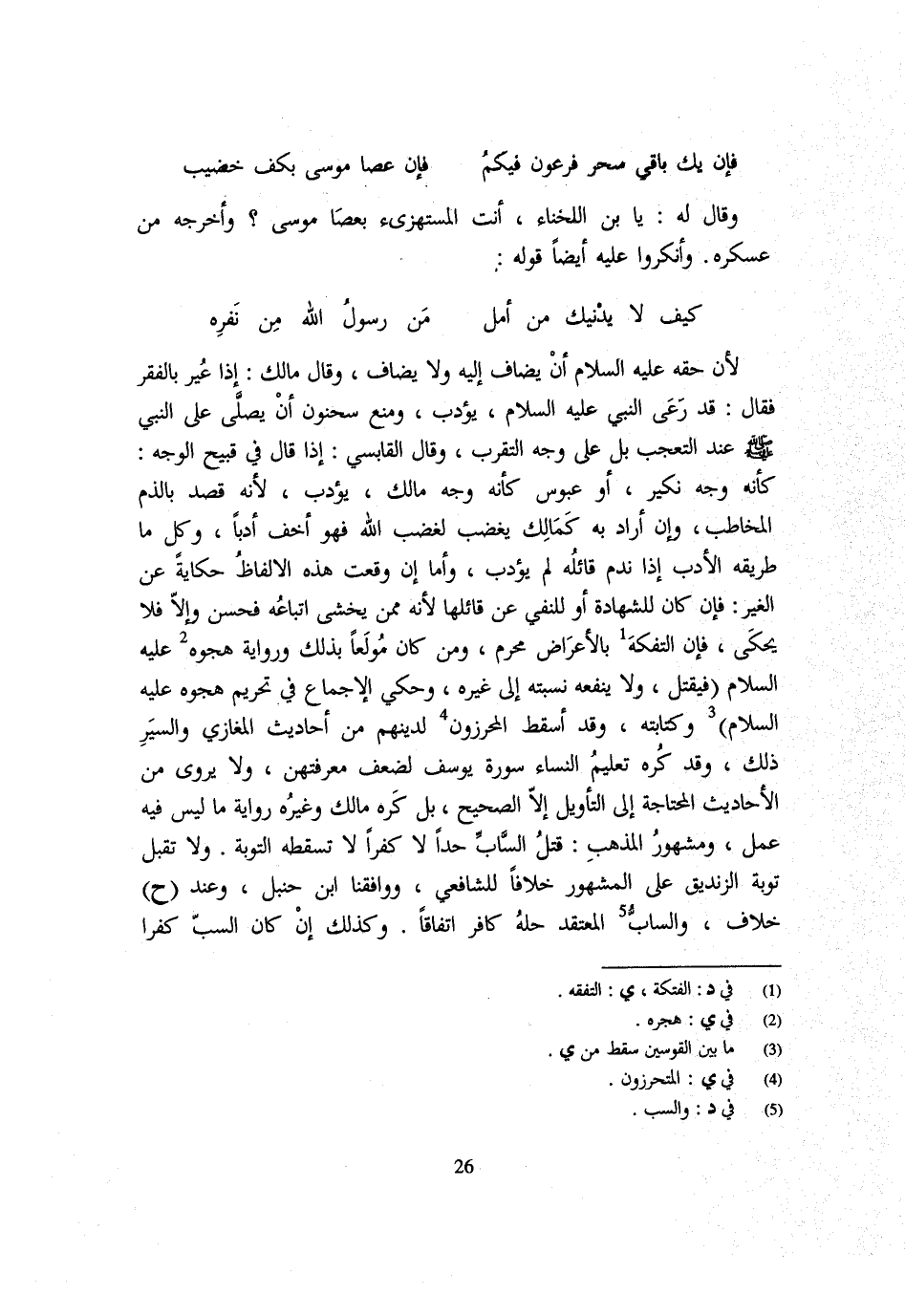 لِأَنَّ حَقَّهُ عَلَيْهِ السَّلَامُ أَنْ يُضَافَ إِلَيْهِ وَلَا يُضَافُ وَقَالَ مَالِكٌ إِذَا عُيِّرَ بالفقر فَقَالَ قد رعى النَّبِي عَلَيْهِ السَّلَام يُؤَدَّبُ وَمَنَعَ سَحْنُونٌ أَنْ يُصَلِّي عَلَى النَّبِيِّ - صَلَّى اللَّهُ عَلَيْهِ وَسَلَّم َ - عِنْدَ التَّعَجُّبِ بَلْ عَلَى وَجْهِ التَّقَرُّبِ وَقَالَ الْقَابِسِيُّ إِذَا قَالَ فِي قَبِيحِ الْوَجْهِ كَأَنَّهُ وَجْهُ نَكِيرٍ أَوْ عَبُوسٍ كَأَنَّهُ وَجْهُ مَالِكٍ يُؤَدَّبُ لِأَنَّهُ قَصَدَ بِالذَّمِّ الْمُخَاطَبَ وَإِنْ أَرَادَ بِهِ كَمَالِكٍ يَغْضَبُ لِغَضَبِ اللَّهِ فَهُوَ أَخَفُّ أَدَبًا وَكُلُّ مَا طَرِيقُهُ الْأَدَبُ إِذَا نَدِمَ قَائِلُهُ لَمْ يُؤَدَّبْ وَأَمَّا إِنْ وَقَعَتْ هَذِهِ الْأَلْفَاظُ حِكَايَةً عَنِ الْغَيْرِ فَإِنْ كَانَ لِلشَّهَادَةِ أَو للنَّفْي عَنْ قَائِلِهَا لِأَنَّهُ مِمَّنْ يُخْشَى اتِّبَاعُهُ فَحَسَنٌ وَإِلَّا فَلَا يُحْكَى فَإِنَّ التَّفَكُّهَ بِالْأَعْرَاضِ مُحَرَّمٌ وَمَنْ كَانَ مُولَعًا بِذَلِكَ وَرِوَايَةِ هَجْوِهِ عَلَيْهِ السَّلَامُ (فَيُقْتَلُ وَلَا يَنْفَعُهُ نِسْبَتُهُ إِلَى غَيْرِهِ وَحُكِيَ الْإِجْمَاعُ فِي تَحْرِيمِ هَجْوِهِ عَلَيْهِ السَّلَامُ) وَكِتَابَتِهِ وَقَدْ أَسْقَطَ الْمُحْرِزُونَ لِدِينِهِمْ مِنْ أَحَادِيثِ الْمَغَازِي وَالسِّيَرِ ذَلِكَ وَقَدْ كُرِهَ تَعْلِيمُ النِّسَاءِ سُورَةَ يُوسُفَ لِضَعْفِ مَعْرِفَتِهِنَّ وَلَا يُرْوَى مِنَ الْأَحَادِيثِ الْمُحْتَاجَةِ إِلَى التَّأْوِيلِ إِلَّا الصَّحِيحُ بَلْ كَرِهَ مَالِكٌ وَغَيْرُهُ رِوَايَةَ مَا لَيْسَ فِيهِ عمل ومشهور الْمَذْهَب قتل العاب حَدًّا لَا كُفْرًا لَا تُسْقِطُهُ التَّوْبَةُ وَلَا تُقْبَلُ تَوْبَةُ الزِّنْدِيقِ عَلَى الْمَشْهُورِ خِلَافًا لِلشَّافِعِيِّ وَوَافَقَنَا ابْنُ حَنْبَلٍ وَعِنْدَ (ح) خِلَافٌ وَالسَّابُّ الْمُعْتَقِدُ حِلَّهُ كَافِرٌ اتِّفَاقًا وَكَذَلِكَ إِنْ كَانَ السب كفرا