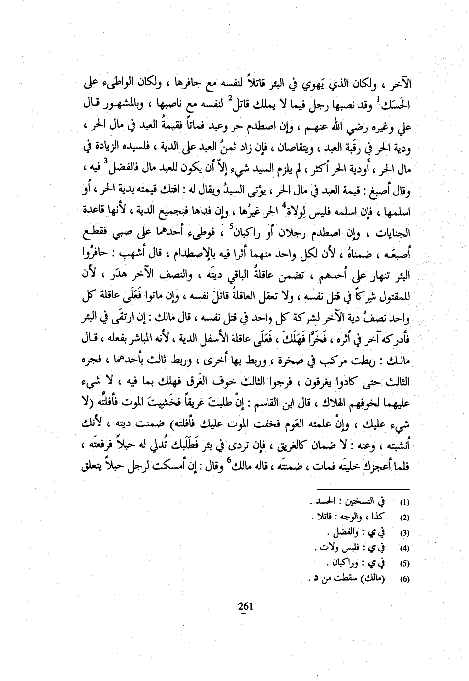 الْآخَرِ وَلَكَانَ الَّذِي يَهْوِي فِي الْبِئْرِ قَاتِلًا لنَفسِهِ مَعَ حافرها ولكان الواطىء عَلَى الْحَسَكِ وَقَدْ نَصَبَهَا رَجُلٌ فِيمَا لَا يَمْلِكُ قَاتِلٌ لِنَفْسِهِ مَعَ نَاصِبِهَا وَبِالْمَشْهُورِ قَالَ عَلِيٌّ وَغَيْرُهُ رَضِيَ اللَّهُ عَنْهُمْ وَإِنِ اصْطَدَمَ حُرٌّ وَعَبْدٌ فَمَاتًا فَقِيمَةُ الْعَبْدِ فِي مَالِ الْحُرِّ وَدِيَةُ الْحُرِّ فِي رَقَبَةِ الْعَبْدِ وَيَتَقَاصَّانِ فَإِن زاج ثَمَنُ الْعَبْدِ عَلَى الدِّيَةِ فَلِسَيِّدِهِ الزِّيَادَةُ فِي مَالِ الْحُرِّ أَوْ دِيَةُ الْحُرِّ أَكْثَرُ لَمْ يَلْزَمِ السَّيِّدَ شَيْءٌ إِلَّا أَنْ يَكُونَ لِلْعَبْدِ مَالٌ فَالْفَضْلُ فِيهِ وَقَالَ أَصْبَغُ قِيمَةُ الْعَبْدِ فِي مَال الْحر يُؤْتى السَّيِّدُ وَيُقَالُ لَهُ افْتَكَّ قِيمَتَهُ بِدِيَةِ الْحُرِّ أَوْ أَسْلِمْهَا فَإِنْ أَسْلَمَهُ فَلَيْسَ لِوُلَاةِ الْحُرِّ غَيْرُهَا وَإِنْ فَدَاهَا فَبِجَمِيعِ الدِّيَةِ لِأَنَّهَا قَاعِدَةُ الْجِنَايَات وَإِن اصطدم رجلَانِ أَو راكبان فوطىء أَحَدُهُمَا عَلَى صَبِيٍّ فَقَطَعَ إِصْبَعَهُ ضَمِنَاهُ لِأَنَّ لِكُلِّ وَاحِدٍ مِنْهُمَا أَثَرًا فِيهِ بِالِاصْطِدَامِ قَالَ أَشهب حافروا الْبِئْرِ تَنْهَارُ عَلَى أَحَدِهِمْ تَضْمَنُ عَاقِلَةُ الْبَاقِي دِيَتِهِ وَالنِّصْفُ الْآخَرُ هَدَرٌ لِأَنَّ لِلْمَقْتُولِ شِرْكًا فِي قَتْلِ نَفْسِهِ وَلَا تَعْقِلُ الْعَاقِلَةُ قَاتِلَ نَفْسِهِ وَإِنْ مَاتُوا فَعَلَى عَاقِلَةِ كُلِّ وَاحِدٍ نِصْفُ دِيَةِ الْآخَرِ لِشَرِكَةِ كُلِّ وَاحِدٍ فِي قتل نَفسه قَالَ مَالك عَن ارْتَقَى فِي الْبِئْرِ فَأَدْرَكَهُ آخَرُ فِي أَثَرِهِ فَخَرَّا فَهَلَكَ فَعَلَى عَاقِلَةِ الْأَسْفَلِ الدِّيَةُ لِأَنَّهُ الْمُبَاشِرُ بِفِعْلِهِ قَالَ مَالِكٌ رُبِطَتْ مَرْكَبٌ فِي صَخْرَةٍ وَرُبِطَ بِهَا أُخْرَى وَرُبِطَ ثَالِثٌ بِأَحَدِهِمَا فجره الثَّالِث حَتَّى كَادُوا يفرقون فَرجوا الثَّالِثَ خَوْفَ الْغَرَقِ فَهَلَكَ بِمَا فِيهِ لَا شَيْءَ عَلَيْهِمَا لِخَوْفِهِمُ الْهَلَاكَ قَالَ ابْنُ الْقَاسِمِ إِنْ طَلَبْتَ غَرِيقًا فَخَشِيتَ الْمَوْتَ فَأَفْلِتْهُ (لَا شَيْءَ عَلَيْكَ وَإِنْ عَلَّمْتَهُ الْعَوْمَ فَخِفْتَ الْمَوْتَ عَلَيْكَ فَأَفْلَتَّهُ) ضَمِنْتَ دِيَتَهُ لِأَنَّكَ أَنْشَبْتَهُ وَعَنْهُ لَا ضَمَان كالغريق فَإِن ترجى فِي بِئْرٍ فَطَلَبَكَ تُدْلِي لَهُ حَبْلًا فَرَفَعْتَهُ فَلَمَّا أَعْجَزَكَ خَلَّيْتَهُ فَمَاتَ ضَمِنْتَهُ قَالَهُ مَالِكٌ وَقَالَ إِنْ أَمْسَكْتَ لِرَجُلٍ حَبْلًا يَتَعَلَّقُ